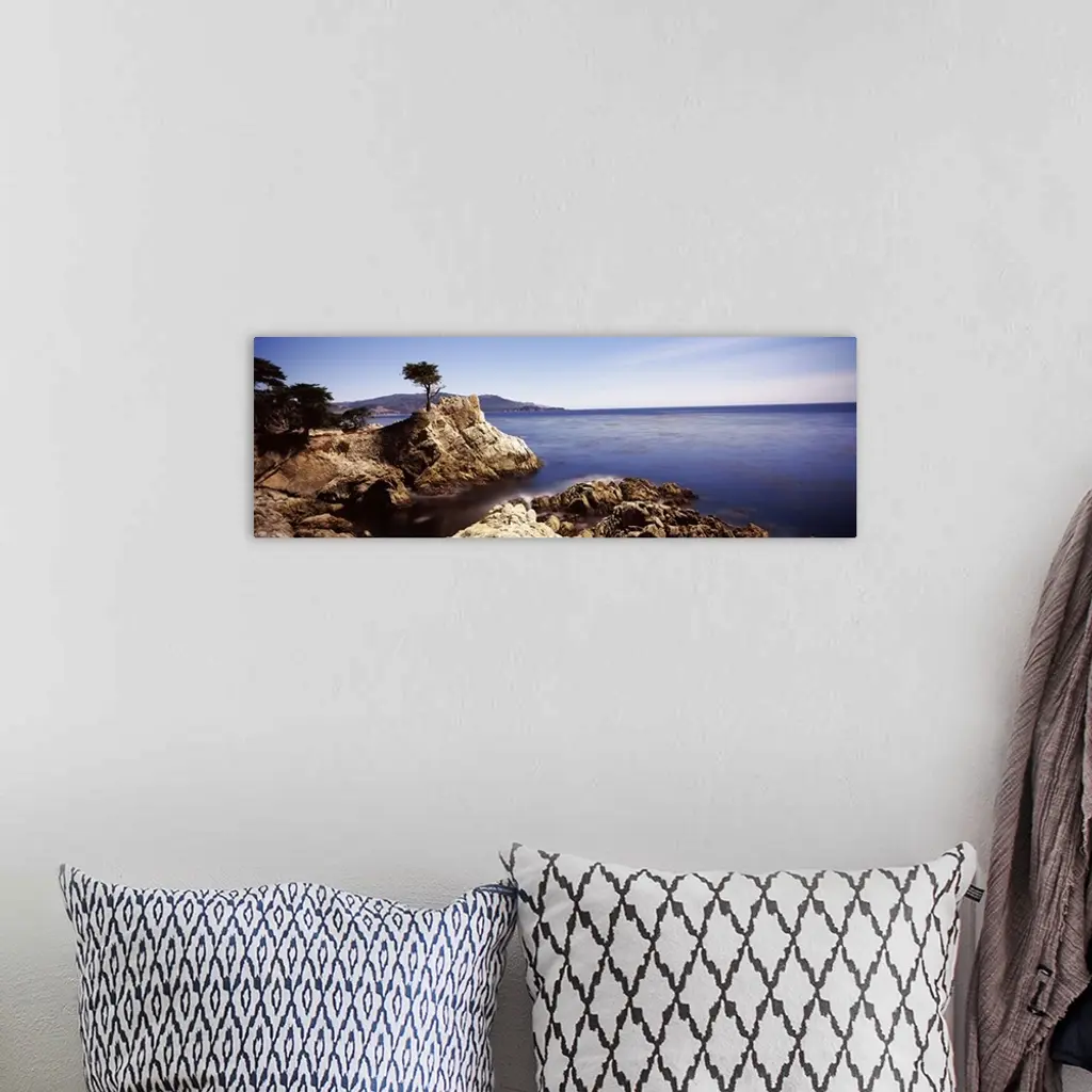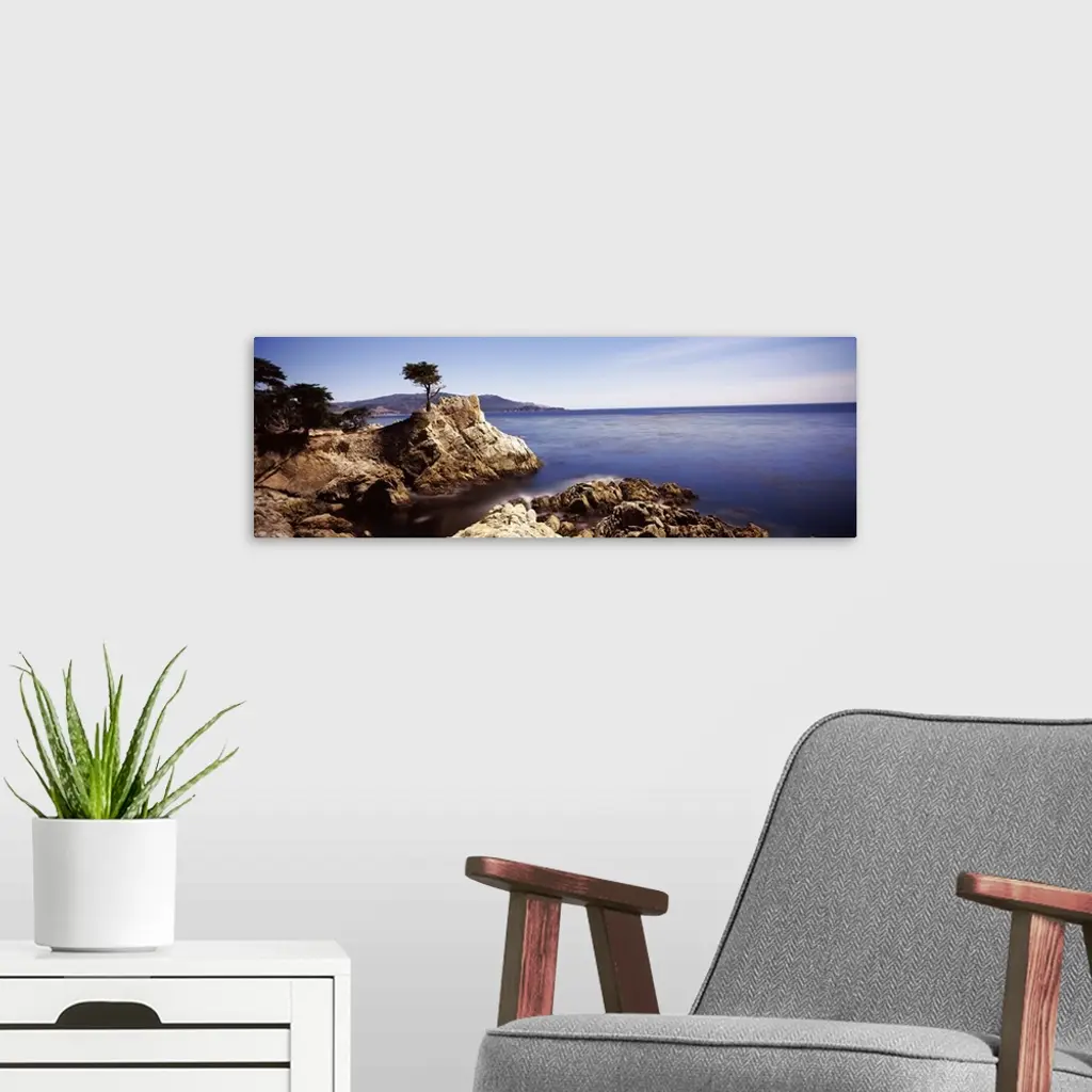 Panoramic photograph of rocky shoreline and cliff with single tree growing near the edge.
