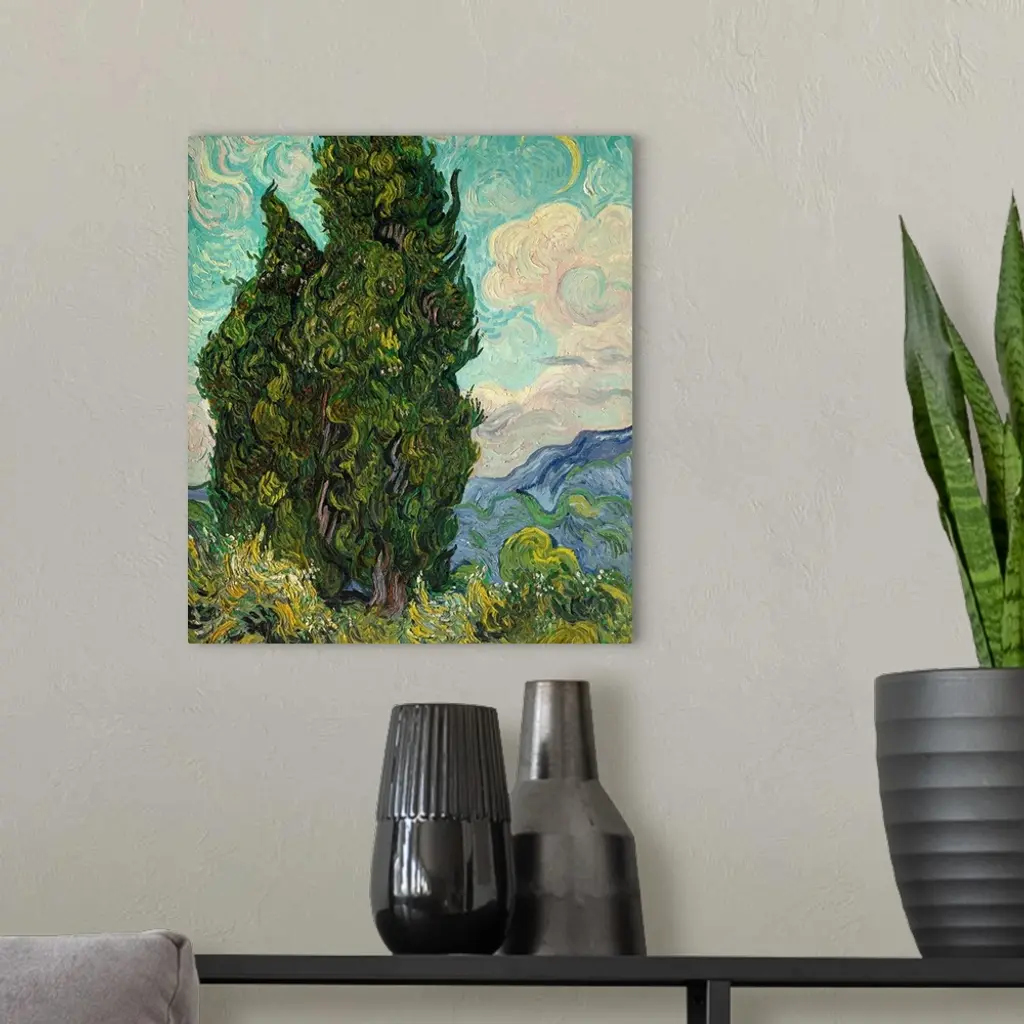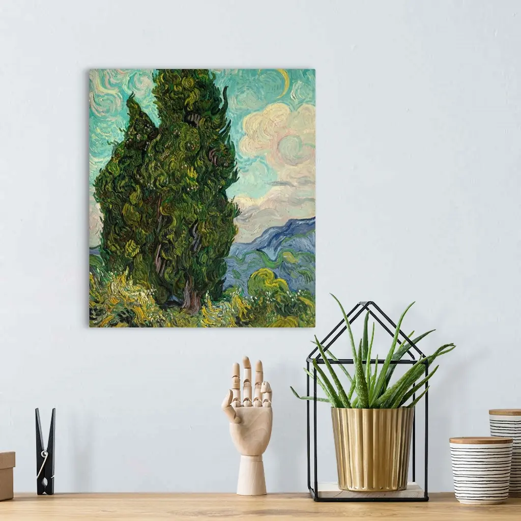 Cypresses was painted in late June 1889, shortly after Van Gogh began his yearlong stay at the asylum in Saint-Remy. The subject, which he found beautiful as regards lines and proportions, like an Egyptian obelisk, both captivated and challenged the artist: It's the dark patch in a sun-drenched landscape, but it's one of the most interesting dark notes, the most difficult to hit off exactly that I can imagine. One of two close-up views of the very tall and massive trees in a vertical format (the other is in the Kroller-Muller Museum, Otterlo), Cypresses was shown in the 1890 Salon des Independants.