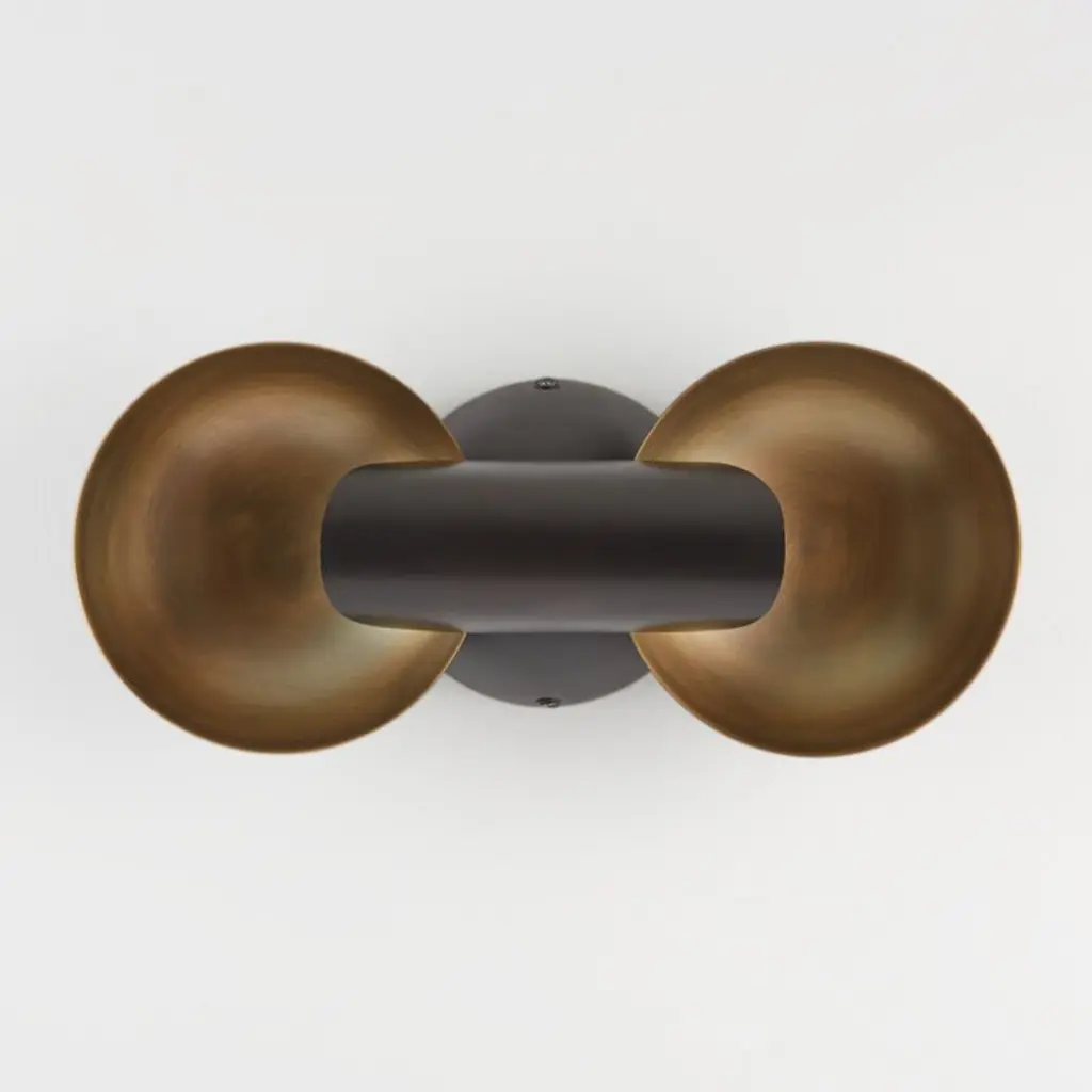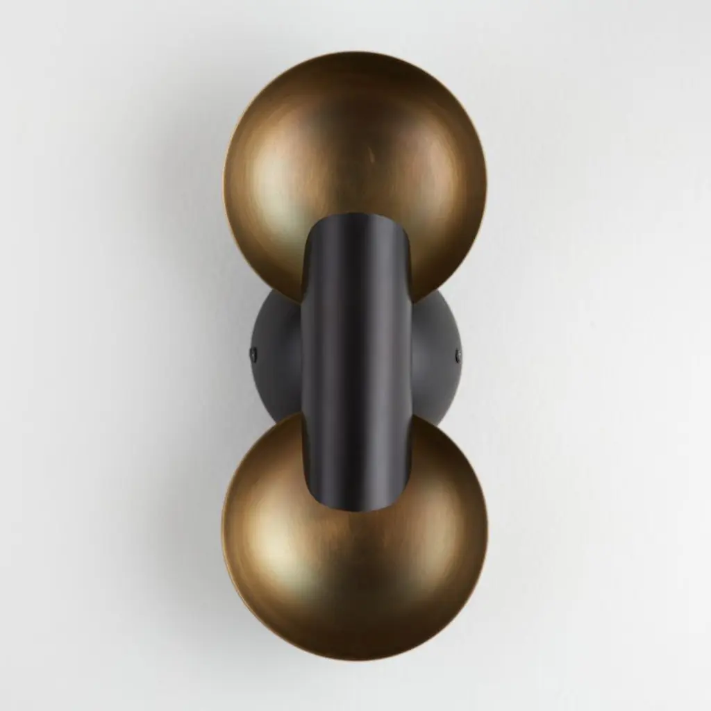 Cyril updates the classic candle reflector sconce for modern decor. Finished in black and antique brass shallow disc-like bowls reflect the light from LED bulbs concealed in the black cylindrical "candle." The result is a soft golden glow that instantly creates a warm atmosphere. Ideal for hallways and other narrow spaces, the wall light hangs horizontally or vertically. Artisans press, spin, cut and weld our exclusive Cyril decorative sconce by hand.