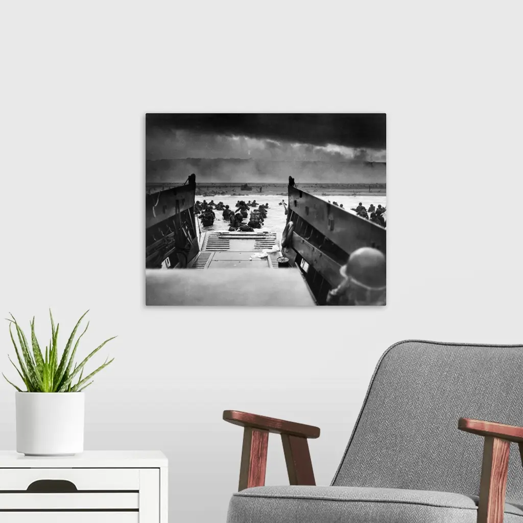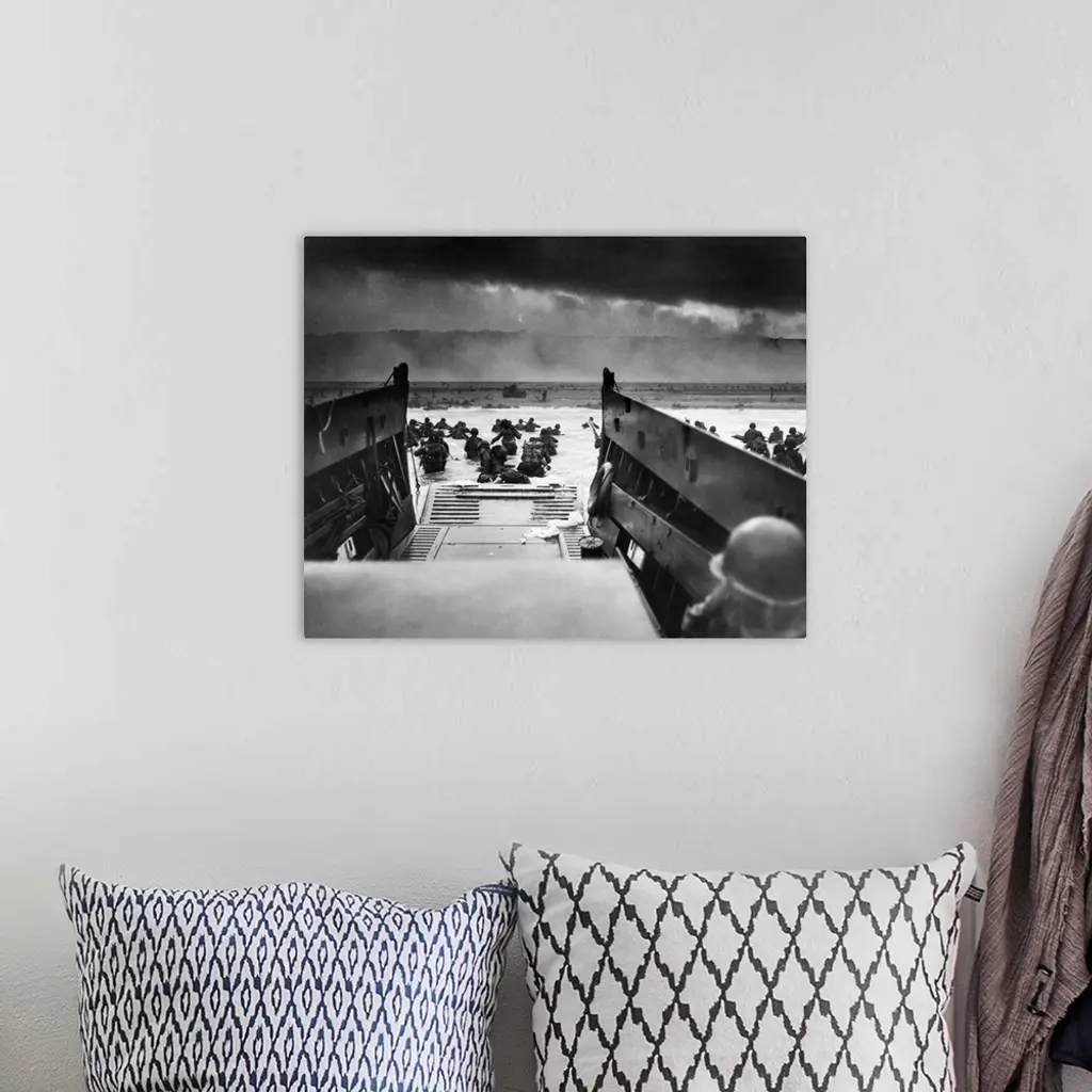 D-Day landings. US Coast Guard-manned LCVP disembarking troops on the morning of 6 June 1944 at Omaha Beach in one of the first waves of the D-Day landings. The unit was Company E, 16th Infantry Regiment, 1st Infantry Division. Omaha Beach saw the fiercest fighting, and this photograph became an iconic image ('Into the Jaws of Death'). The D-Day landings were the largest seaborne invasion in history. They successfully liberated the Normandy coast of Nazi-occupied France, contributing to the Allied victory in World War II. During the landings, the Allied force of some 156,000 (from the UK, USA and Canada) took some 12,000 casualties and suffered more than 4000 dead.
