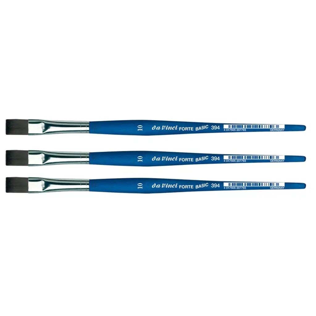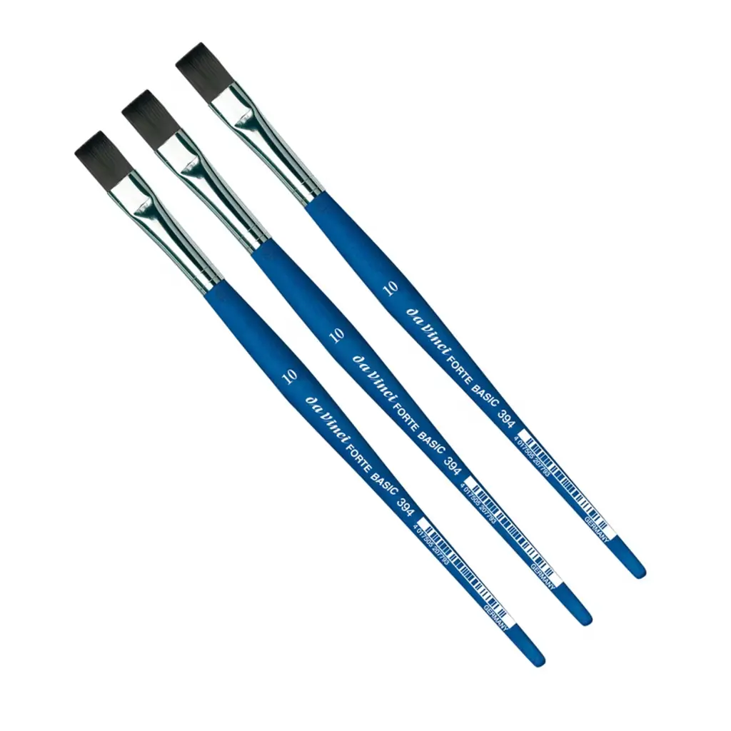 da Vinci FORTE BASIC Student Brush, Synthetic, Acrylic, Flat, Series 394, Size 10, Pack of 3 | da Vinci Forte Basic is the brush line for all decorative craft techniques and colors. This brush is made from durable, red brown synthetic fibers, that were specifically developed for FORTE, which combine the best of bristle and natural hairbrushes. The extra durable fibers are ideal for any rough surface including wood, rough paper, card, textile, canvas, fired porcelain, ceramic and much more! Certified green manufacturing with sustainable wood handles handmade in Germany at our family-owned factory since 1890. 100% Vegan. Sold as a pack of 3.
