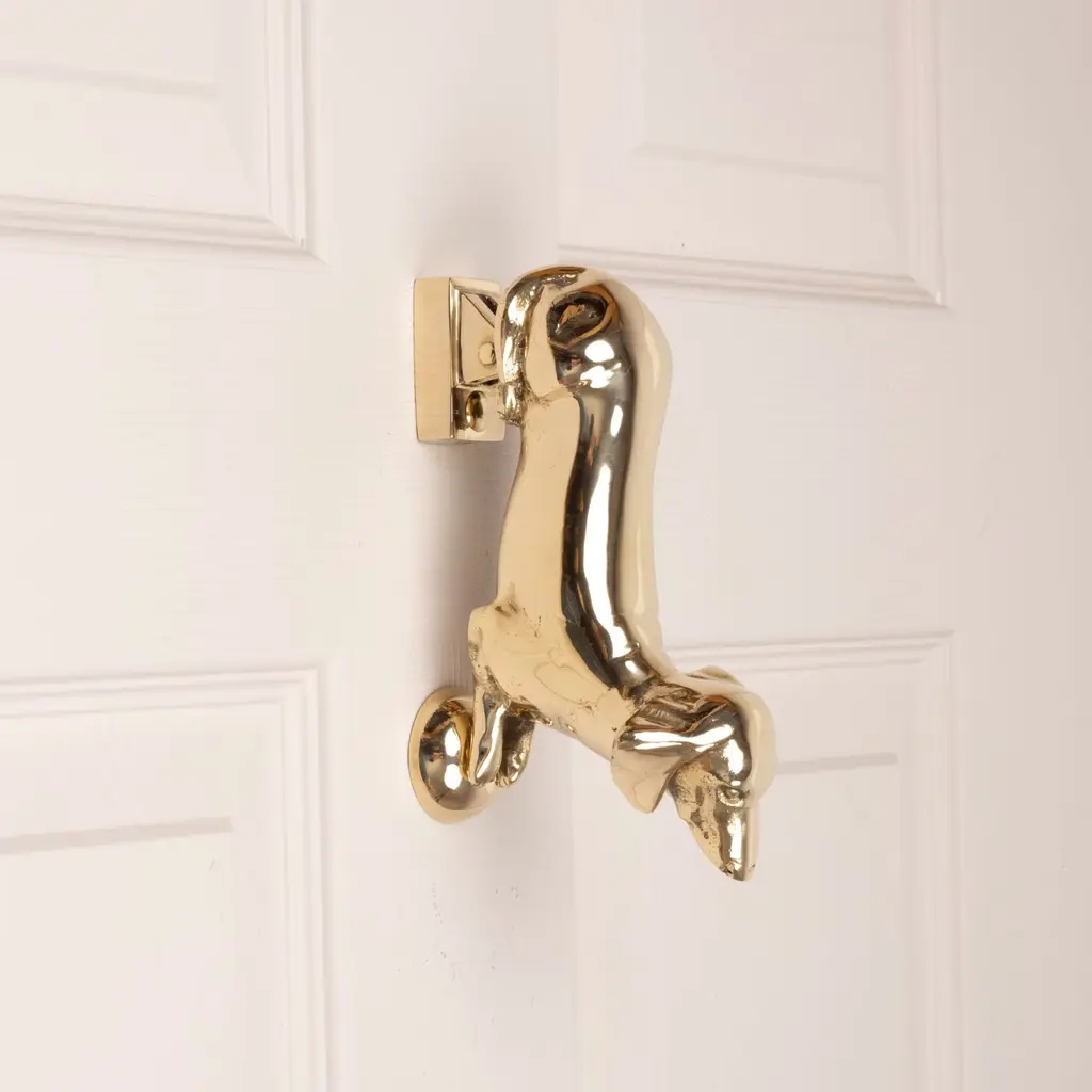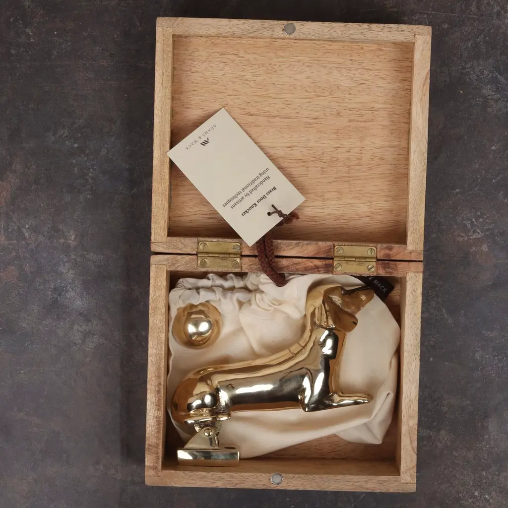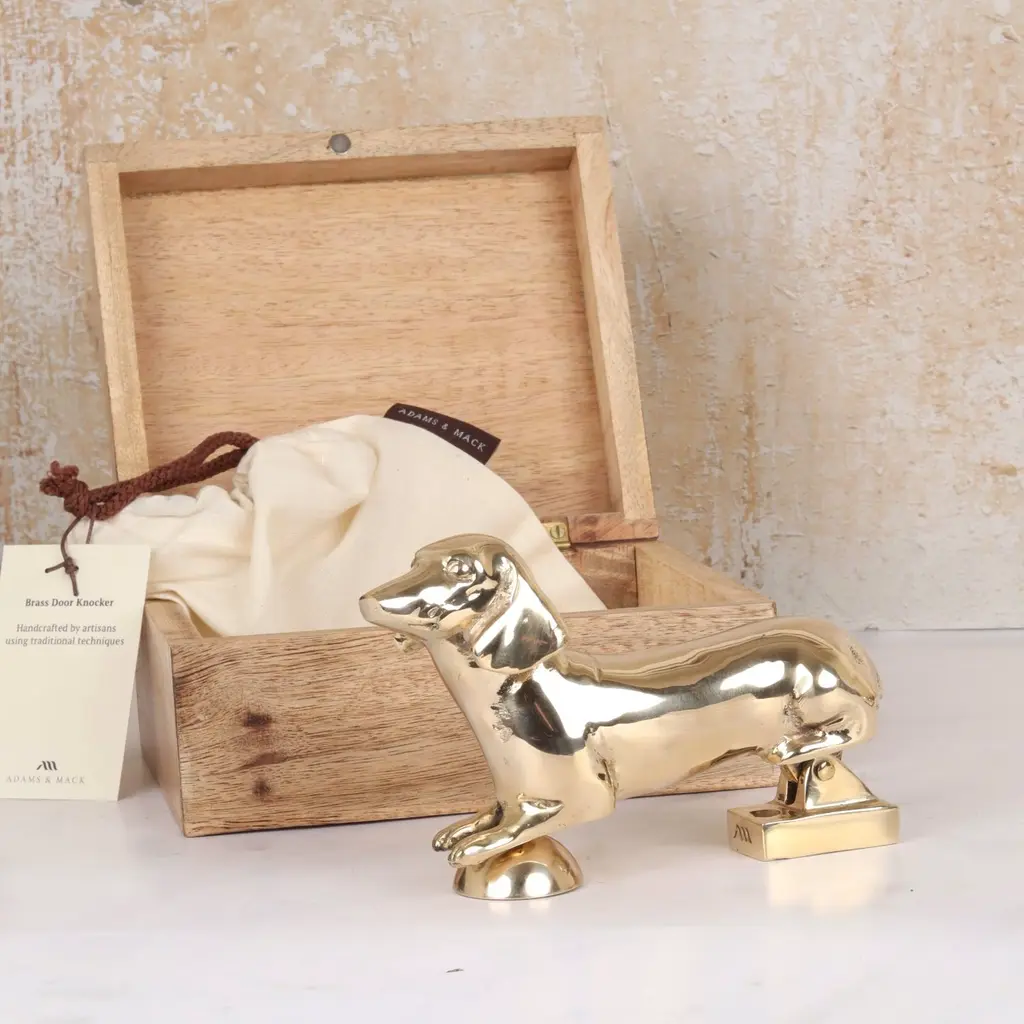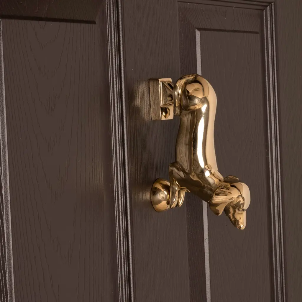 A serious expression and droopy ears give this Dachshund Door Knocker its undeniable charm. Positioned to face visitors head-on, it’s guaranteed to raise a smile. Cast from solid brass and weighing just under 1kg, it gives a satisfying knock and is easy to install with a surface-mounted bracket and fixings included. Handcrafted using traditional techniques, each piece is unique and engraved with the maker’s mark. Over time, the brass will develop a natural patina, or it can be polished to maintain its shine. Suitable for wooden and solid core composite doors. Presented in a wooden gift box with a branded dust bag. Other finishes available—please see our website.