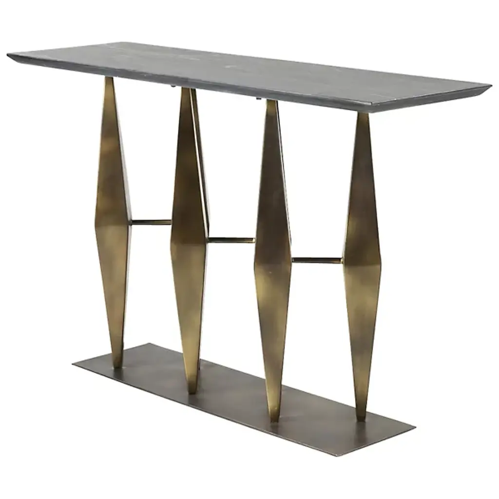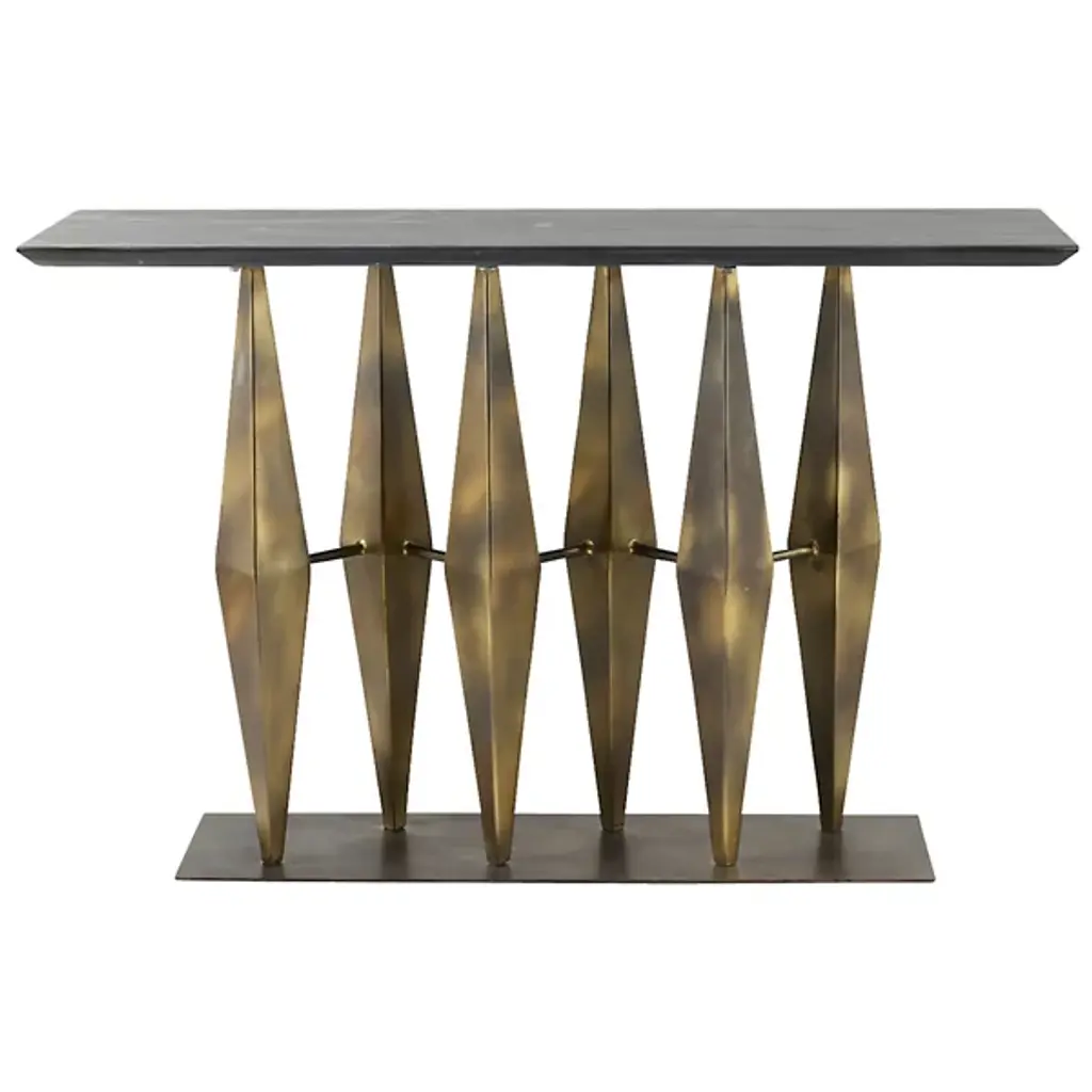 The Aztec-inspired Dagmar Console from Arteriors features timeless elegance, making a striking statement in any space. The geometric base, reminiscent of prisms or spears, is finished in antique gold, adding a touch of sophistication. Topped with a sleek, matte black marble surface, it offers a refined contrast that enhances its visual appeal. Each piece is unique, with natural variations in the marble veining, ensuring a distinctive look that stands out in any room.