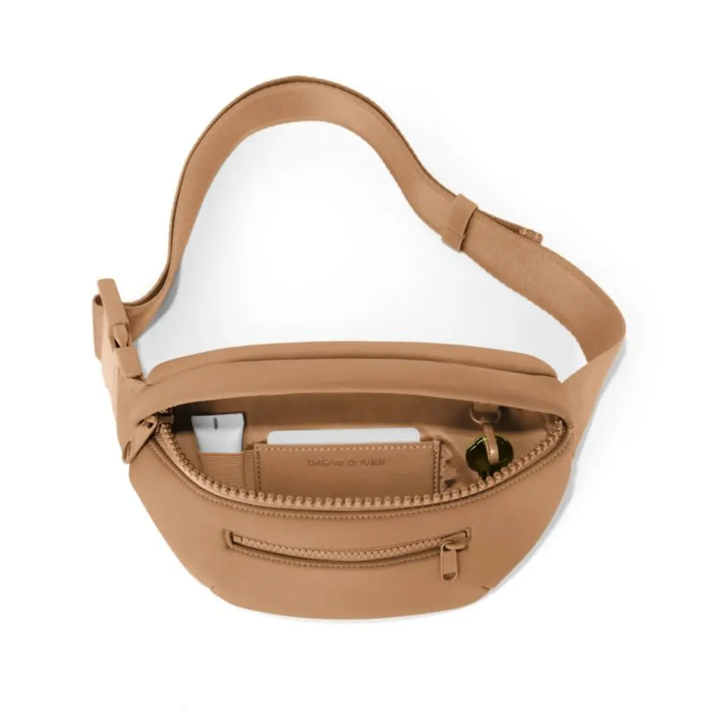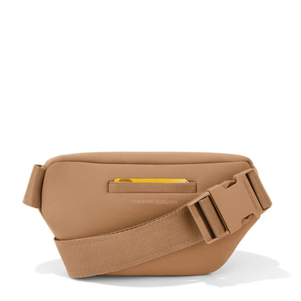 Dagne Dover's take on this parent essentialthe fanny packprovides a just-right amount of carry space. It sports a front zipper pocket, plus an interior with enough room for a small wallet, phone, keys and a paci or two. The adjustable strap and lightweight, streamlined design make it ultra-comfortable to sling across your chest, freeing you up for the hands-on duties of parenting.