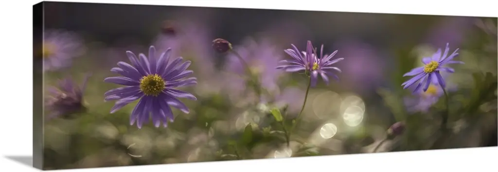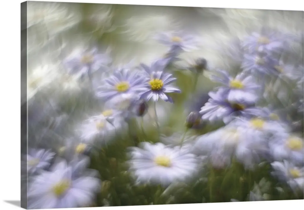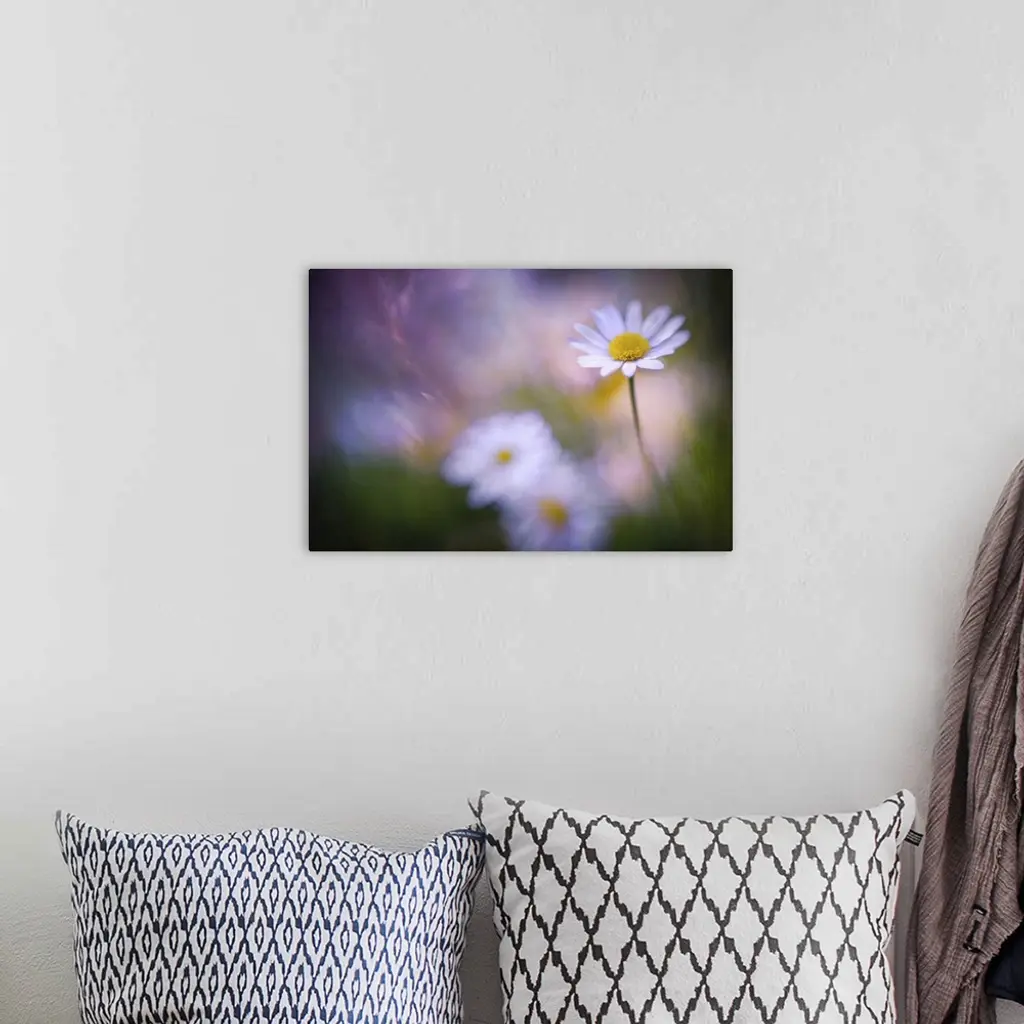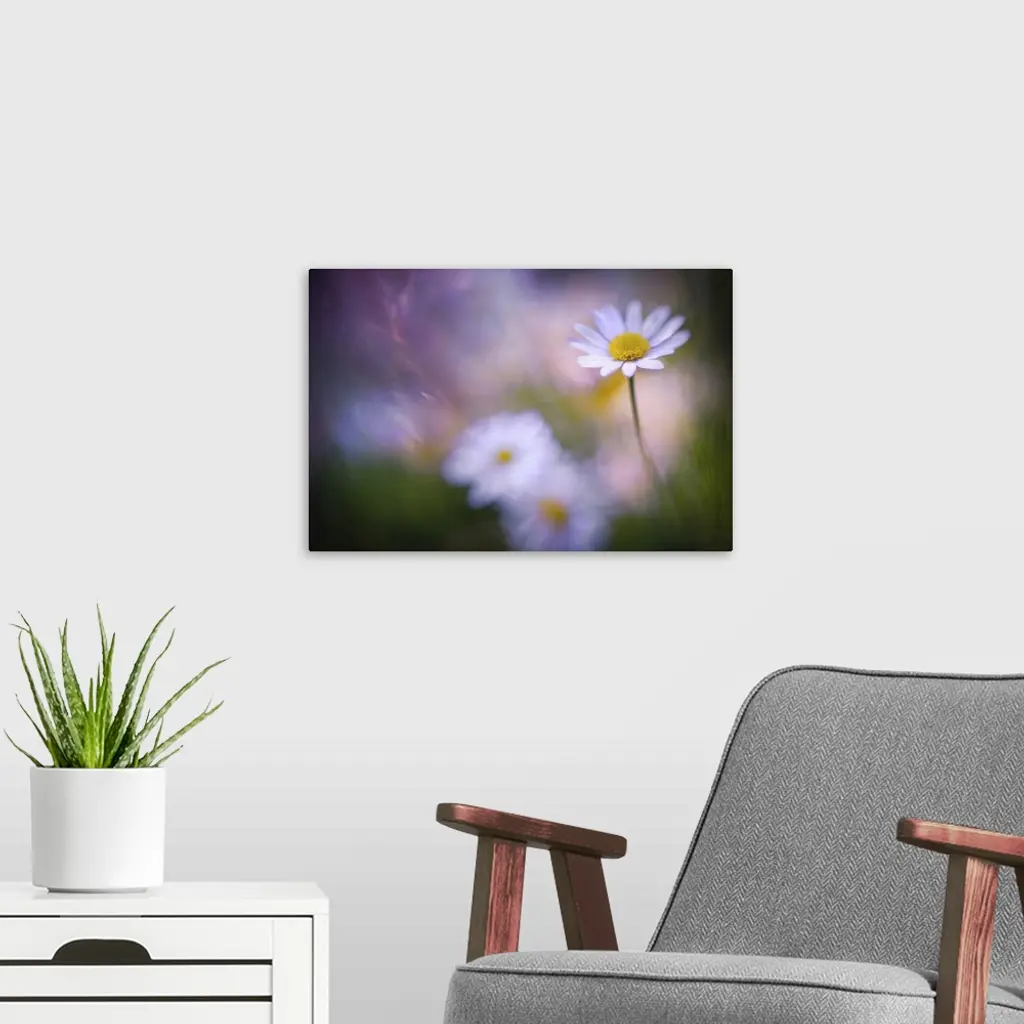 Delicate white daisies with yellow centers stand against a dreamy, blurred background of soft purple and green hues. The focus gently highlights a single flower, creating a serene, tranquil atmosphere.