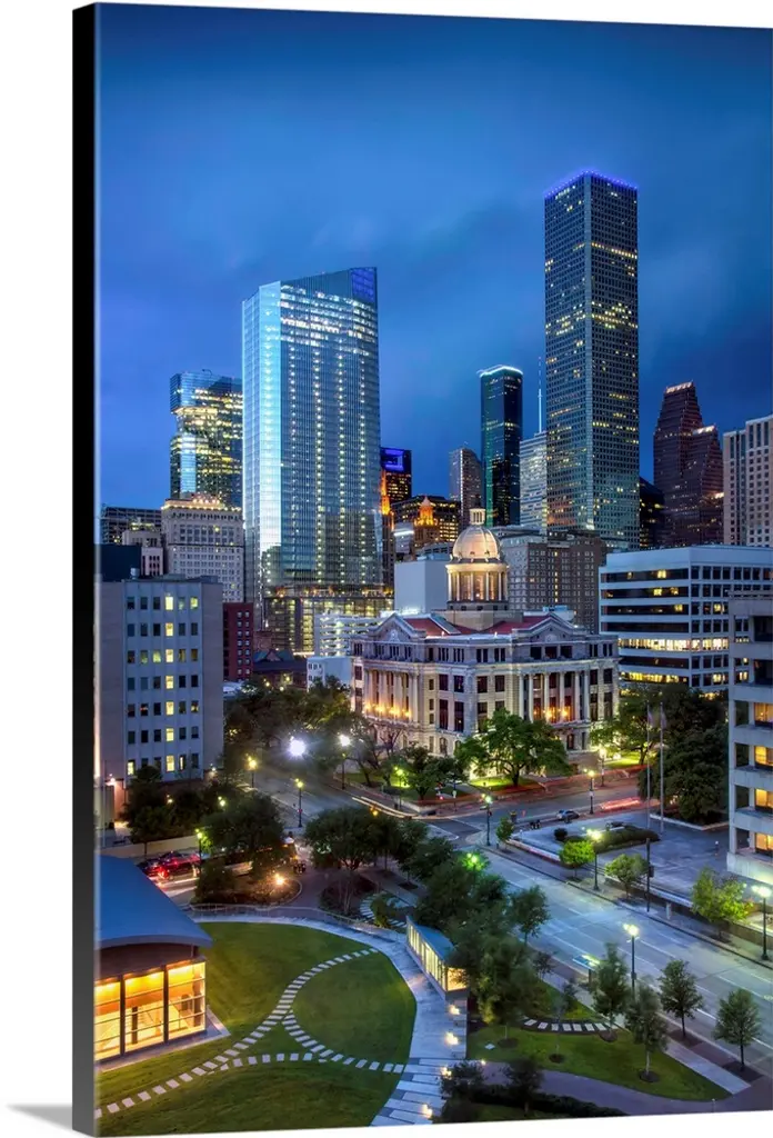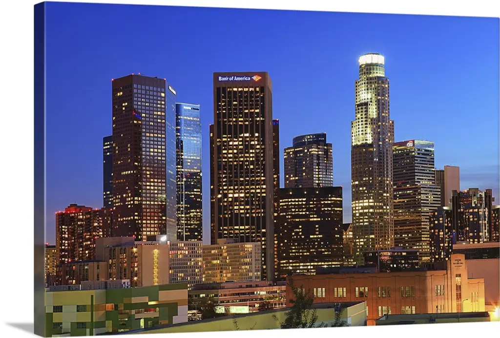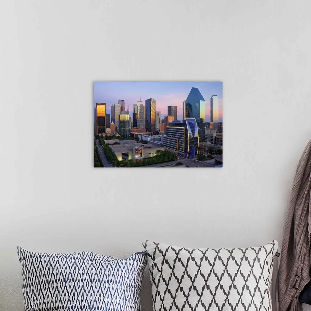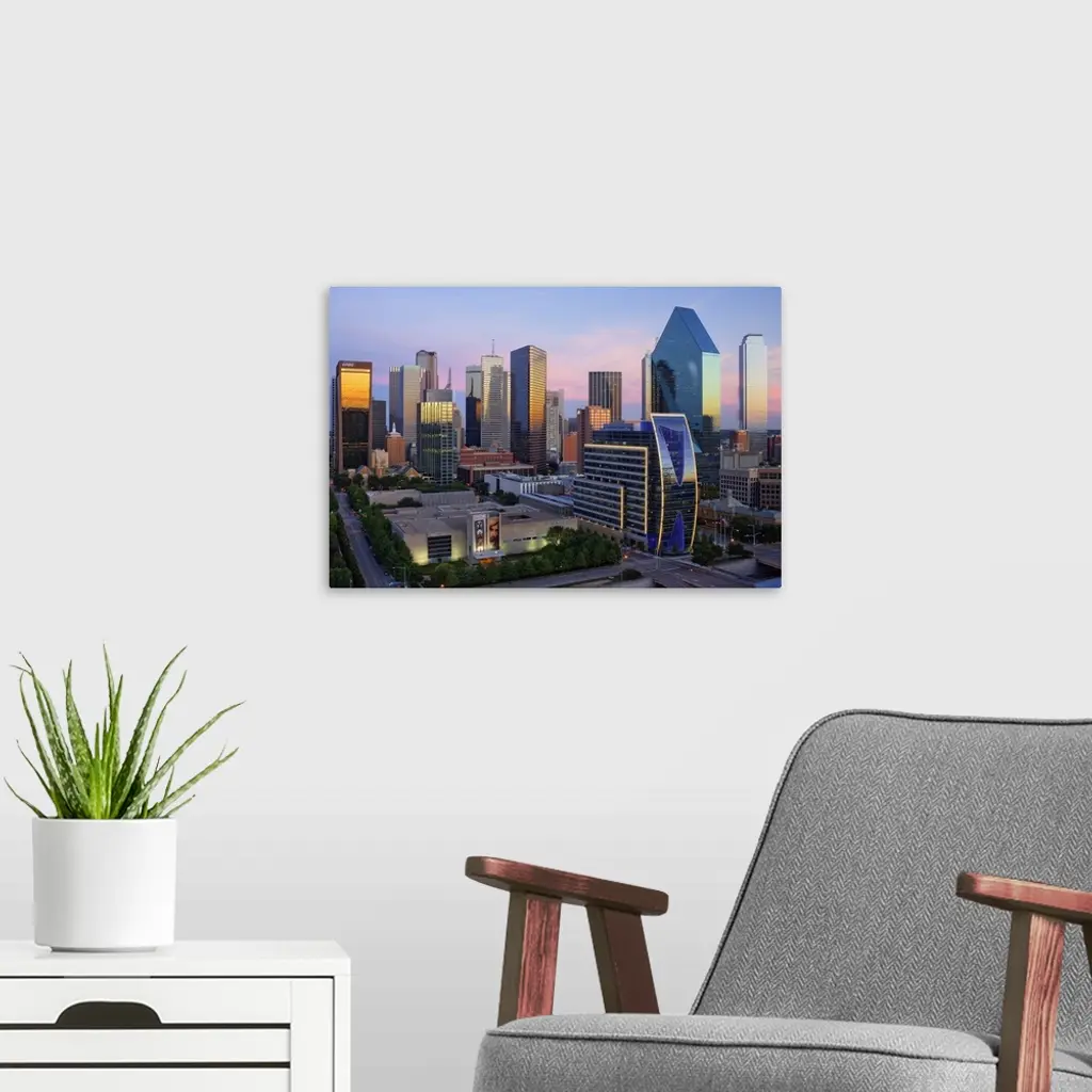 Dallas cityscape with several modern skyscrapers reflecting the fading light from the sunset at twilight.