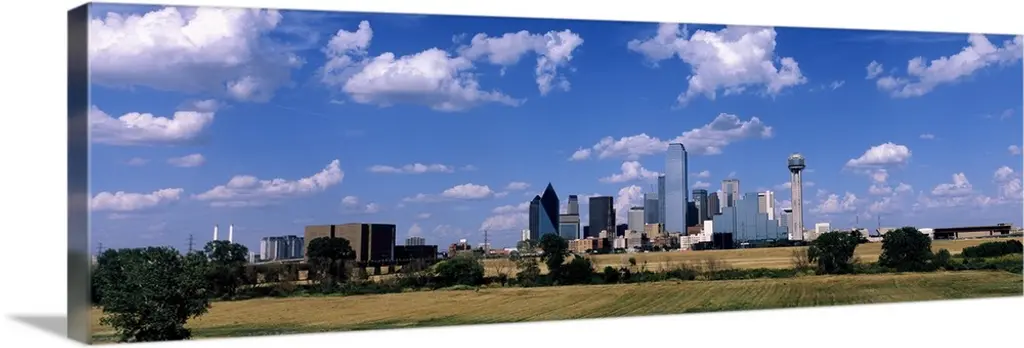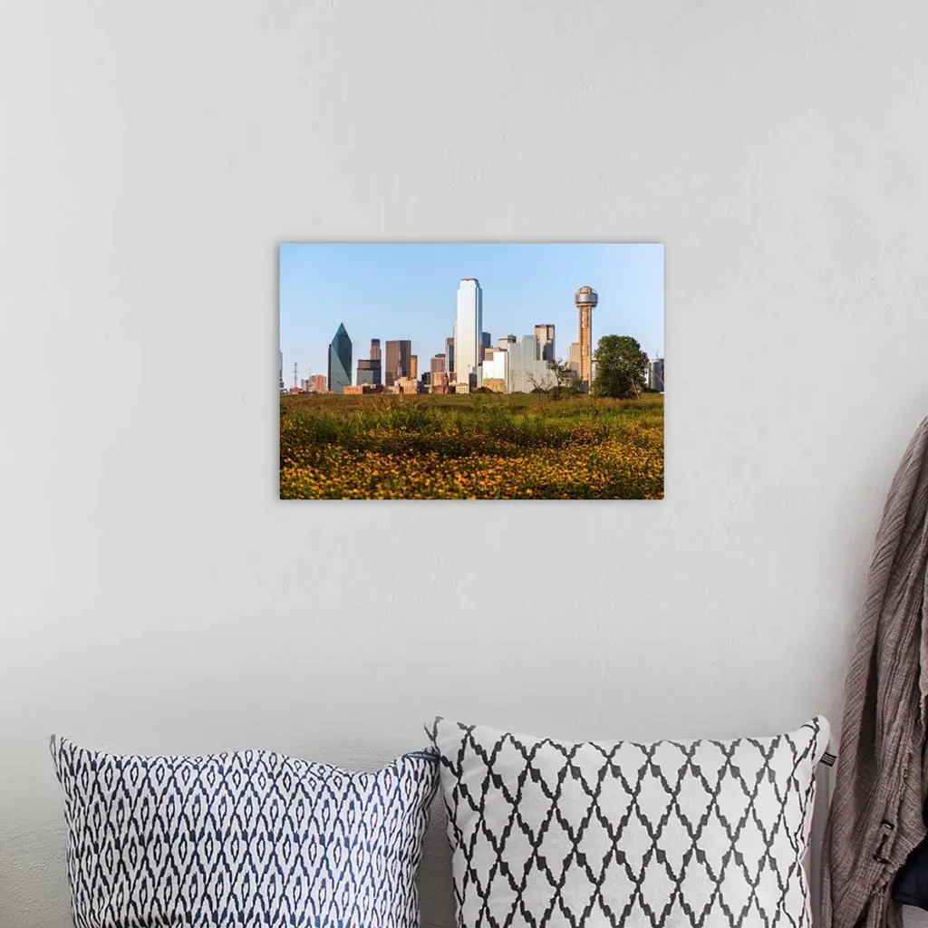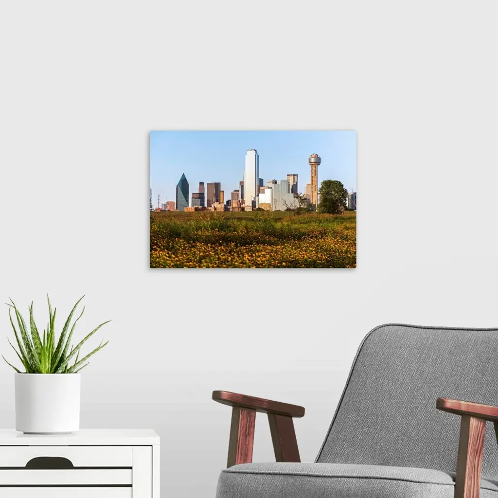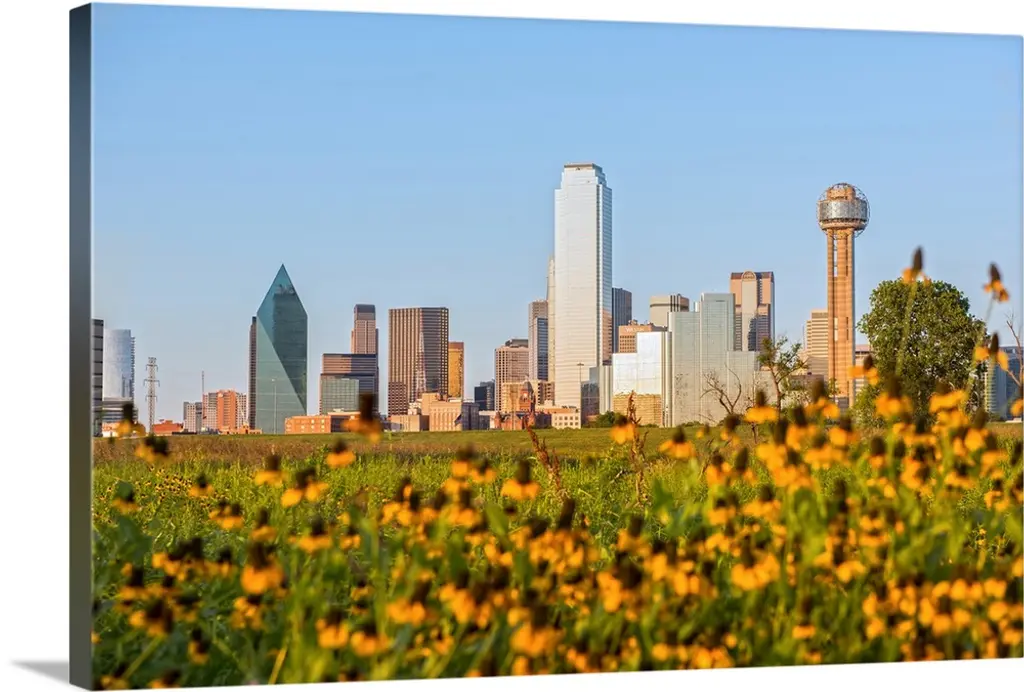 A field of wild flowers in the foreground of the Dallas Texas skyline.
