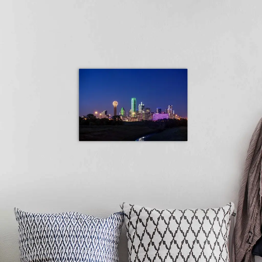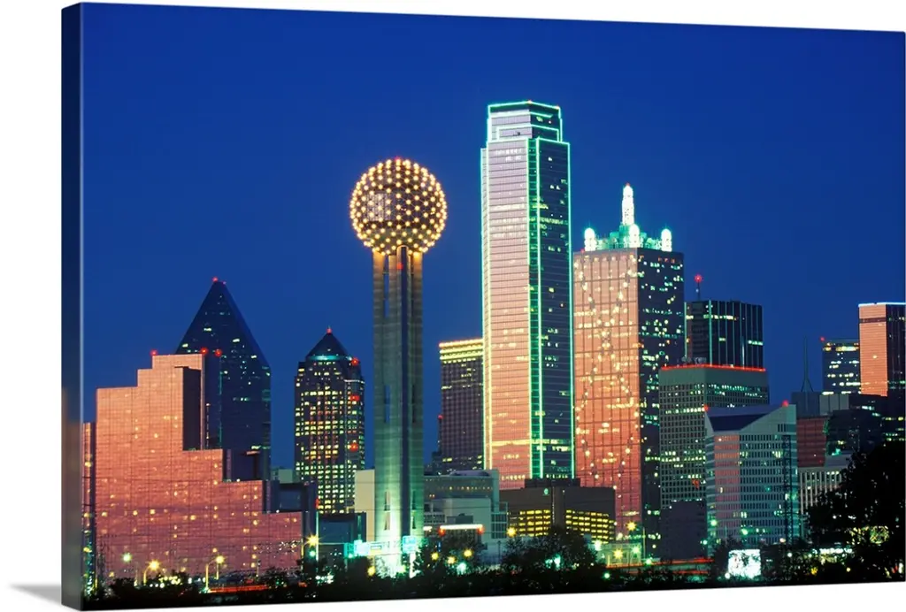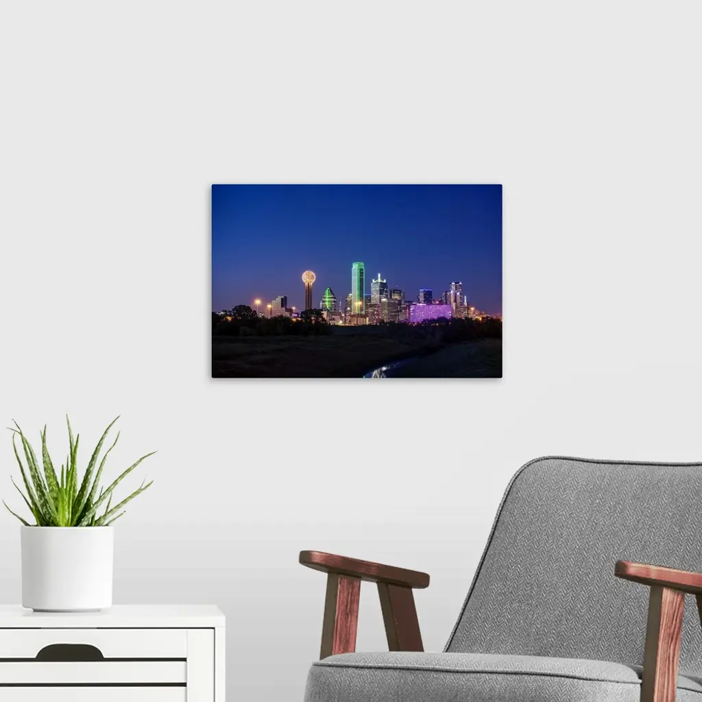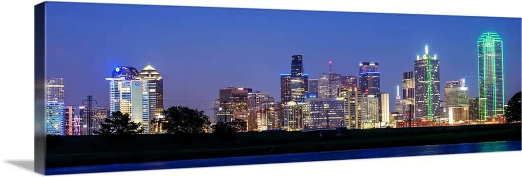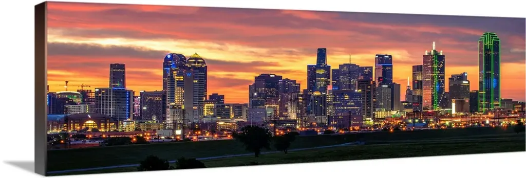 A horizontal image of the Dallas, Texas city skyline at sunset
