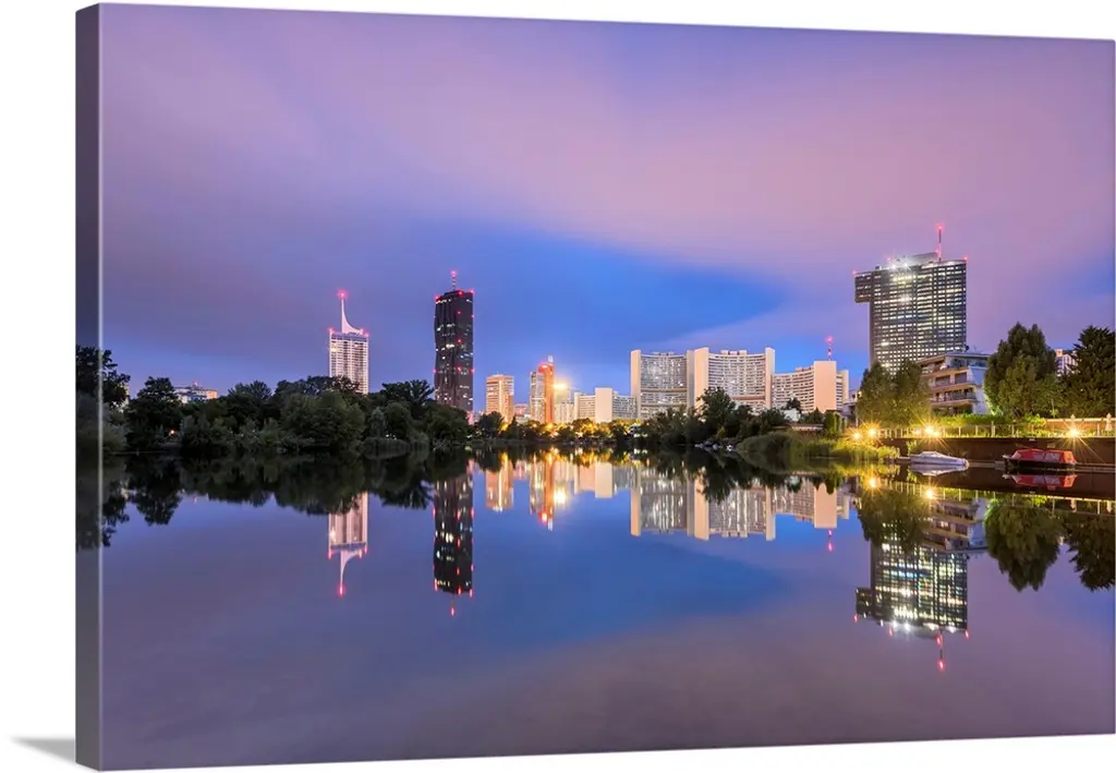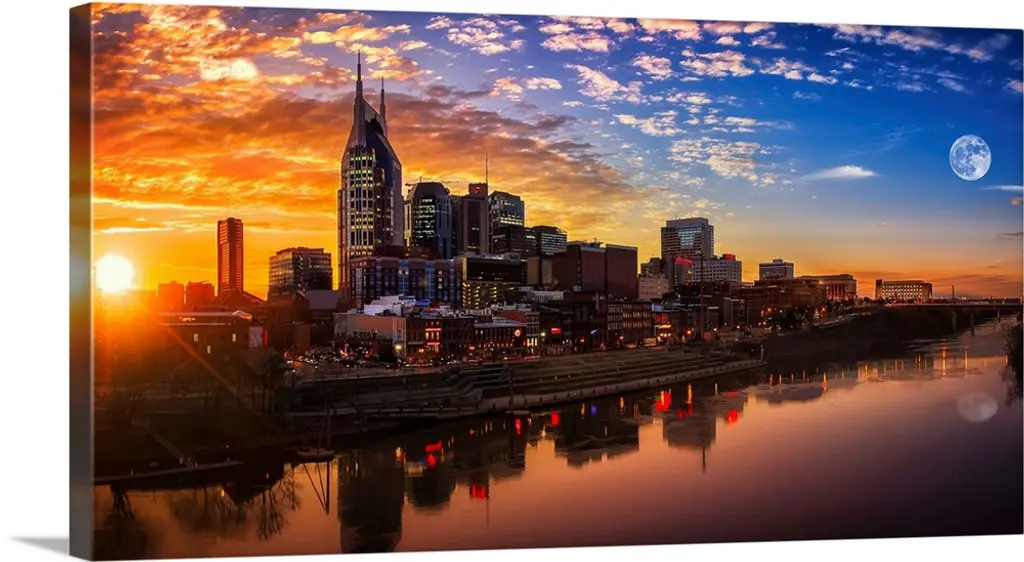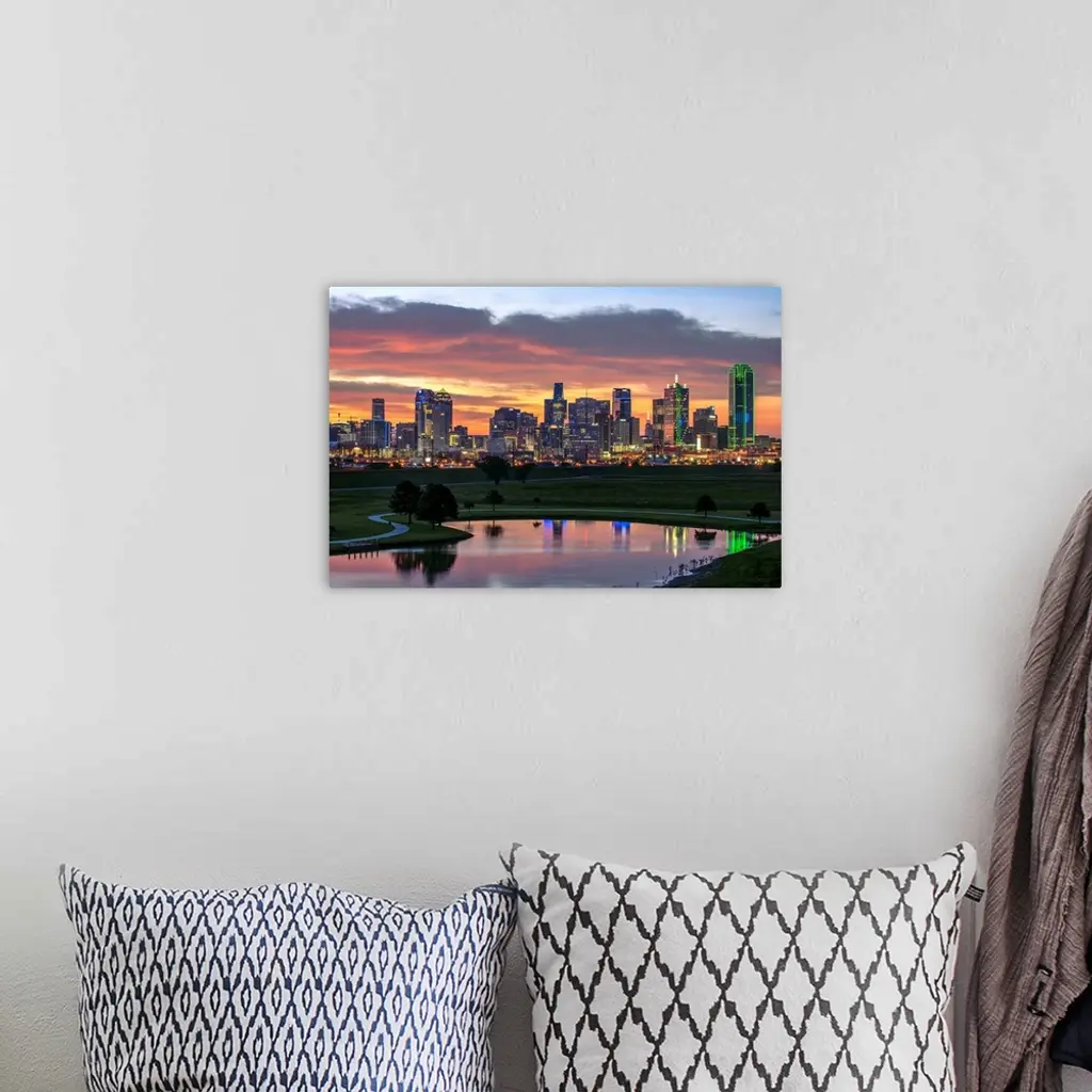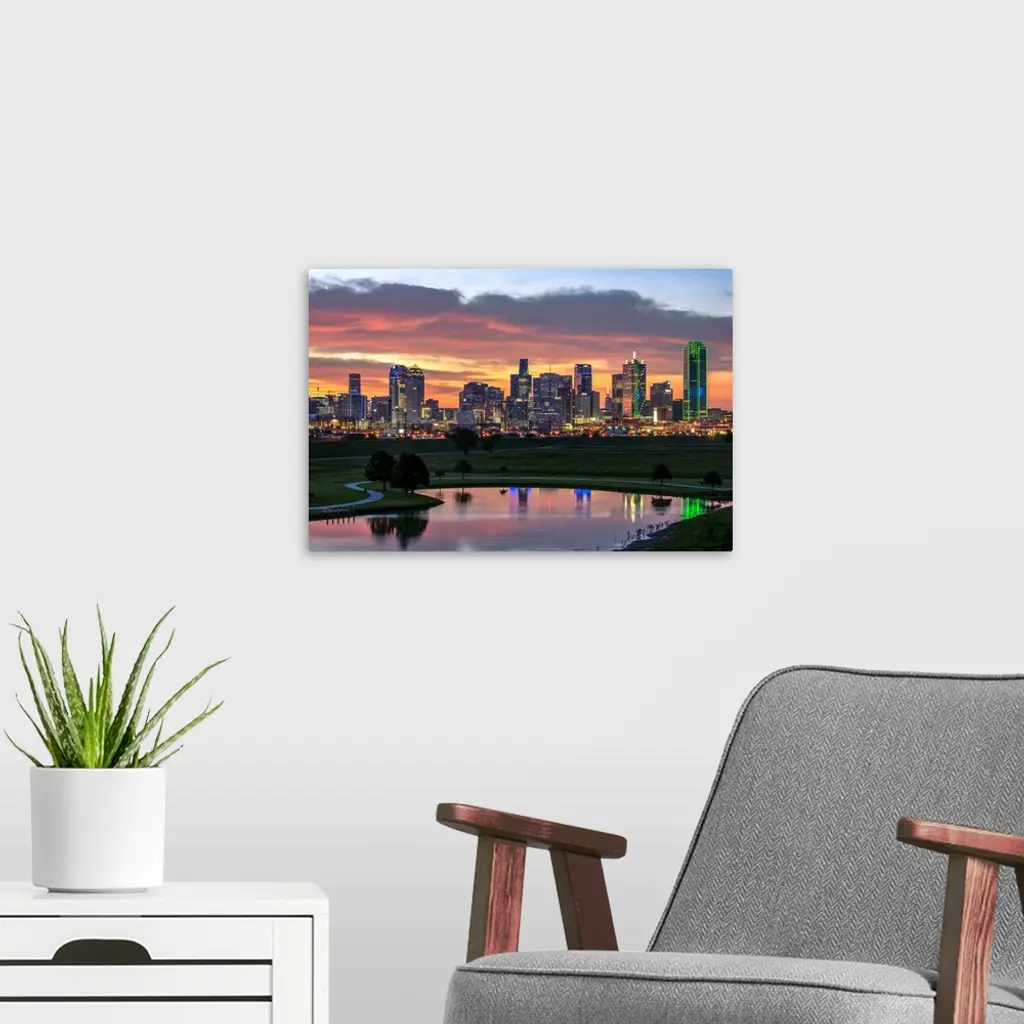 A horizontal image of the Dallas, Texas city skyline at sunset