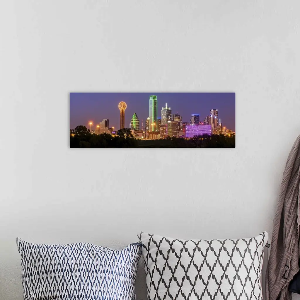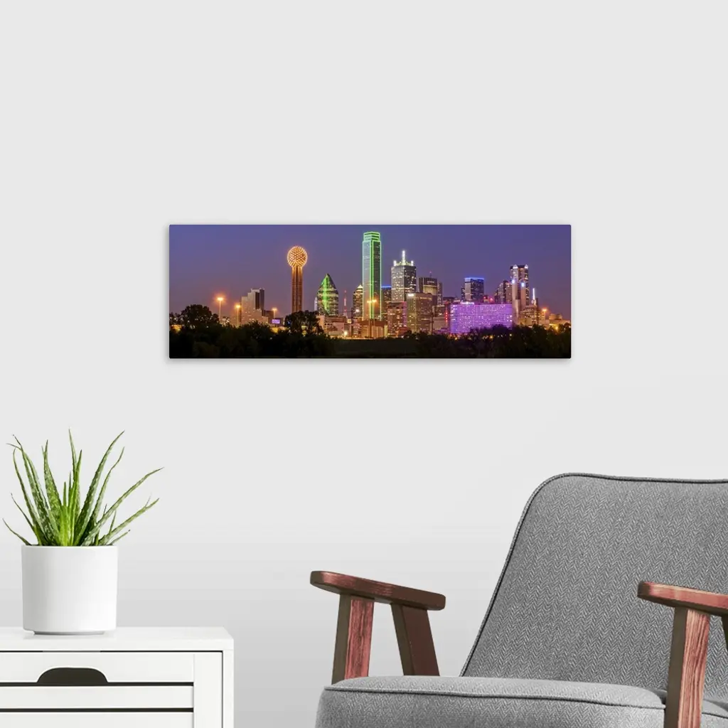 A horizontal image of the Dallas, Texas city skyline at sunset