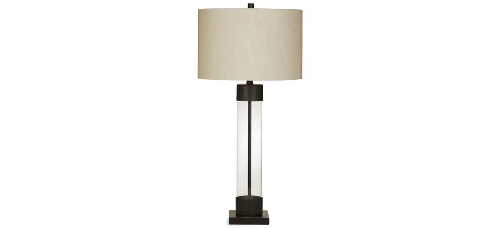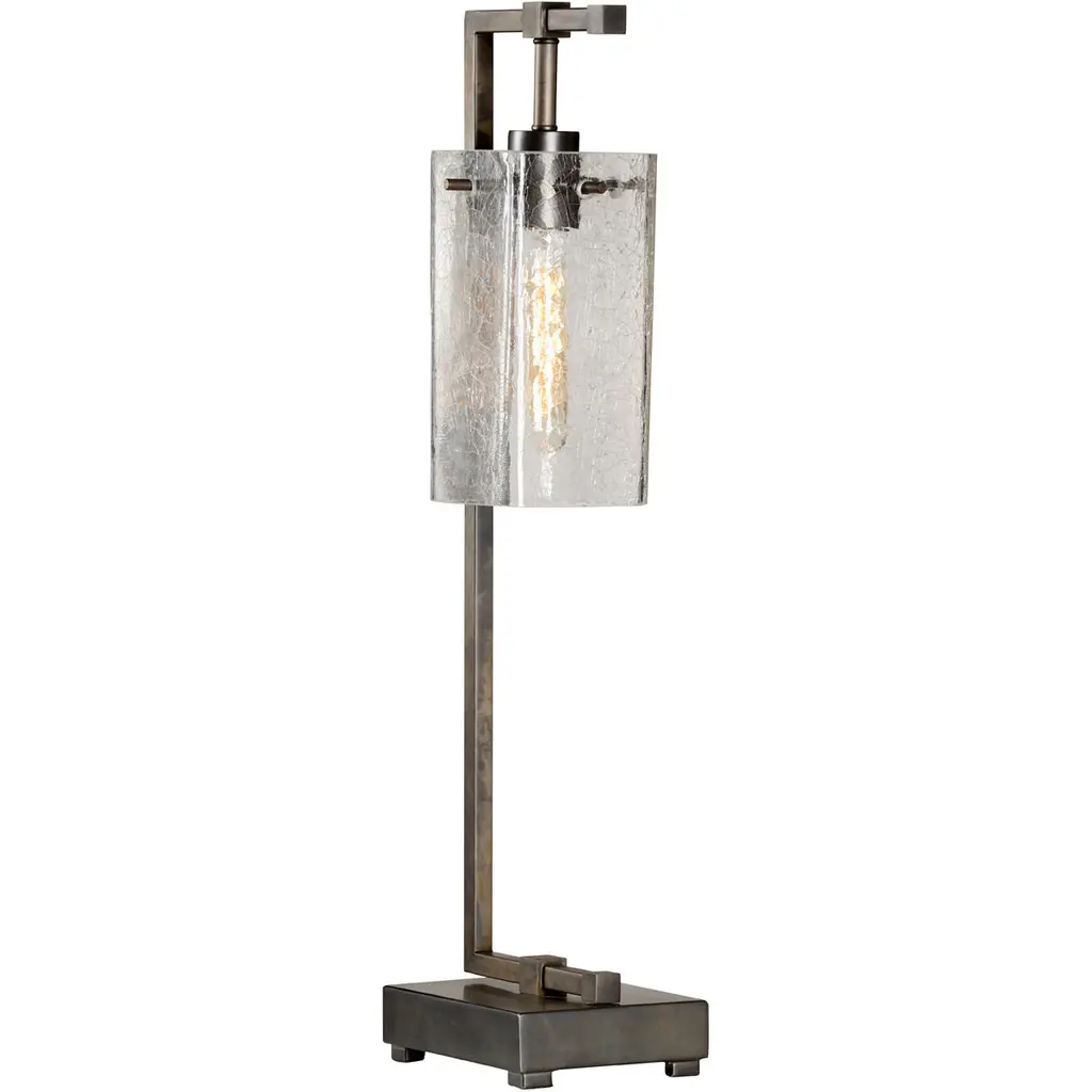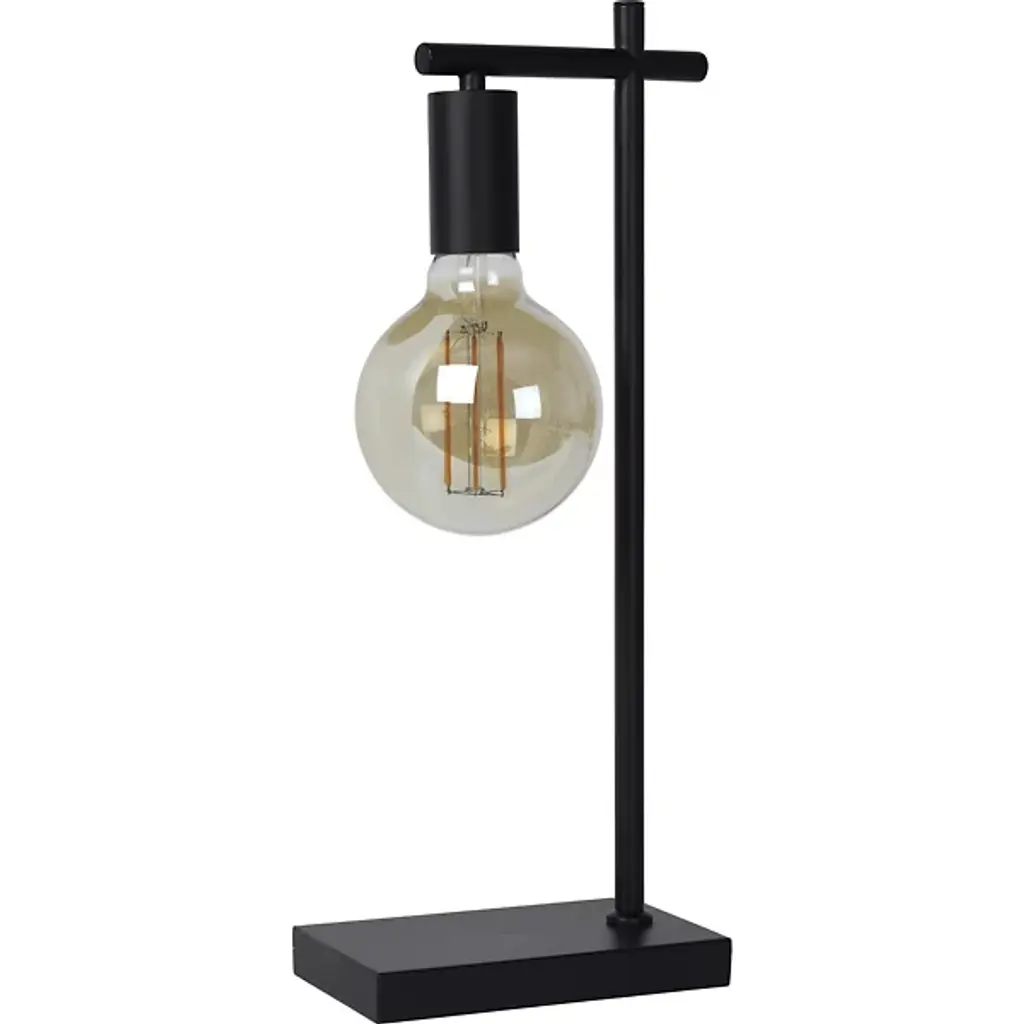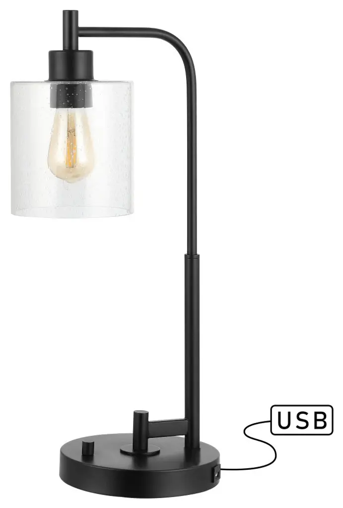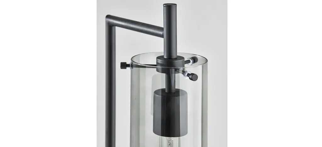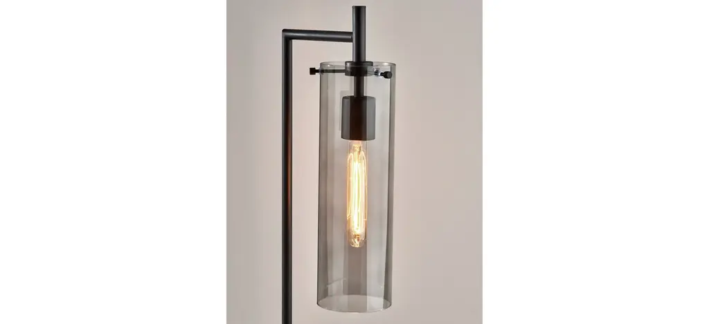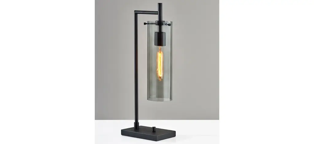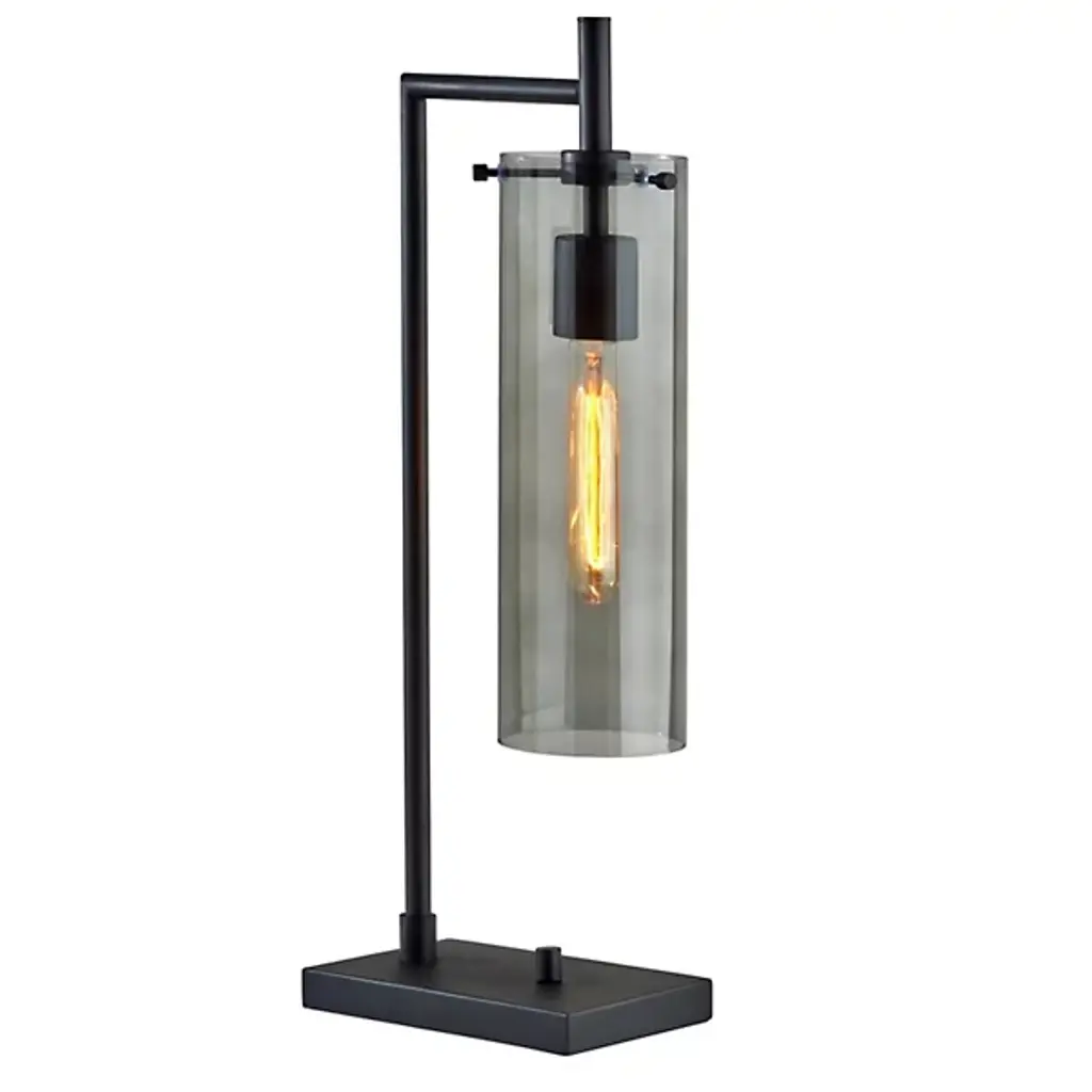 With clean, simple lines, a metal finish, and vintage Edison bulb, the Dalton Desk Lamp integrates seamlessly with industrial and modern chic styling. This lamp's small footprint and narrow profile make it a space efficient choice for desks, nightstands, and end tables. Anchored by a rectangular base crafted of metal, a matching narrow pole extends straight before meeting with a short arm at a 90o angle. Suspended from the arm is a luxuriously styled smoked glass cylindrical shade that leaves the included 40W Edison tube bulb visible for striking, vintage appeal. The lamp is easily operated by a discreet rotary switch located on the base.