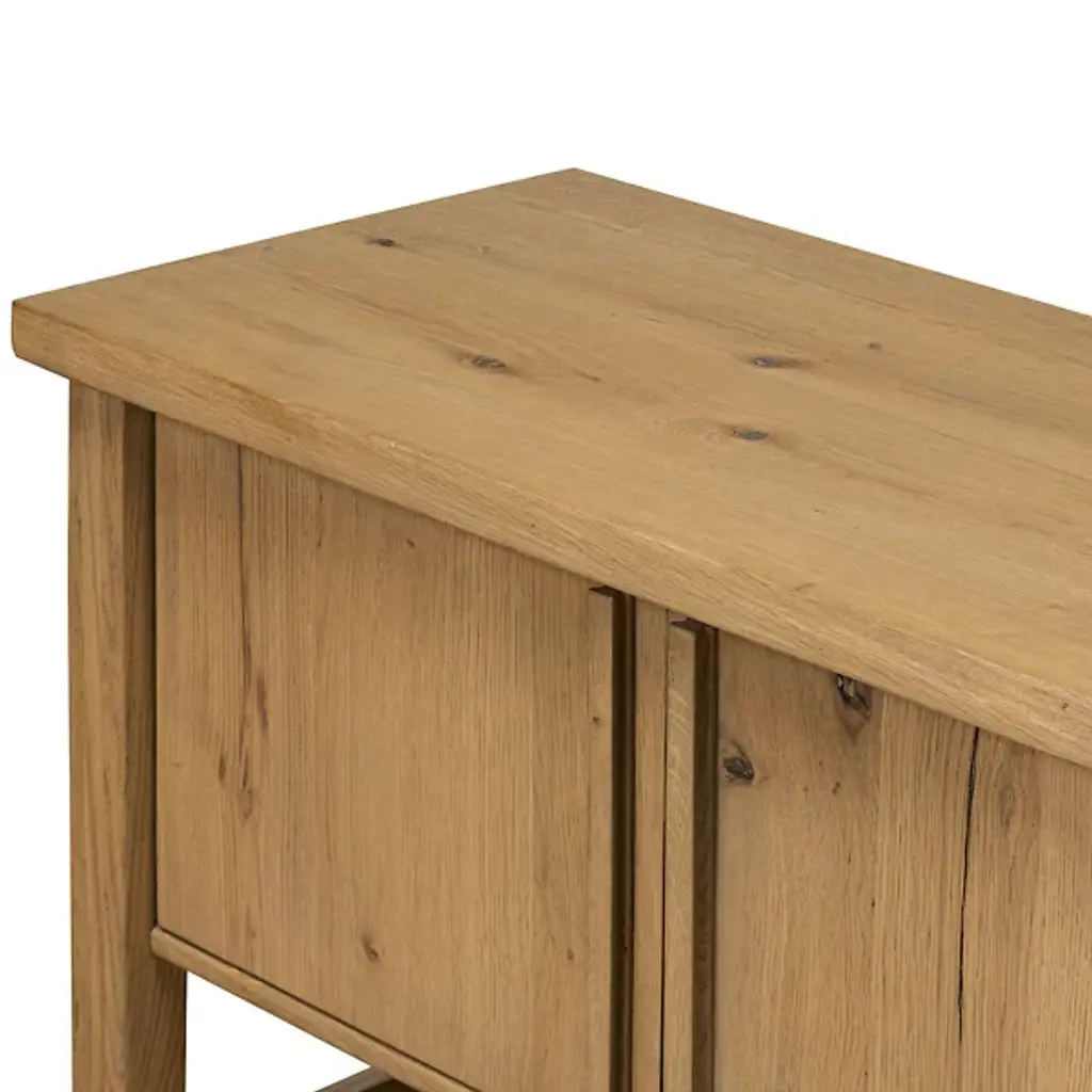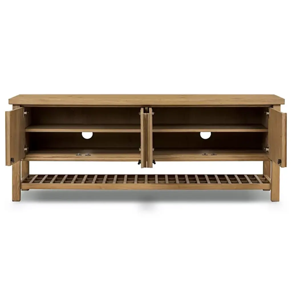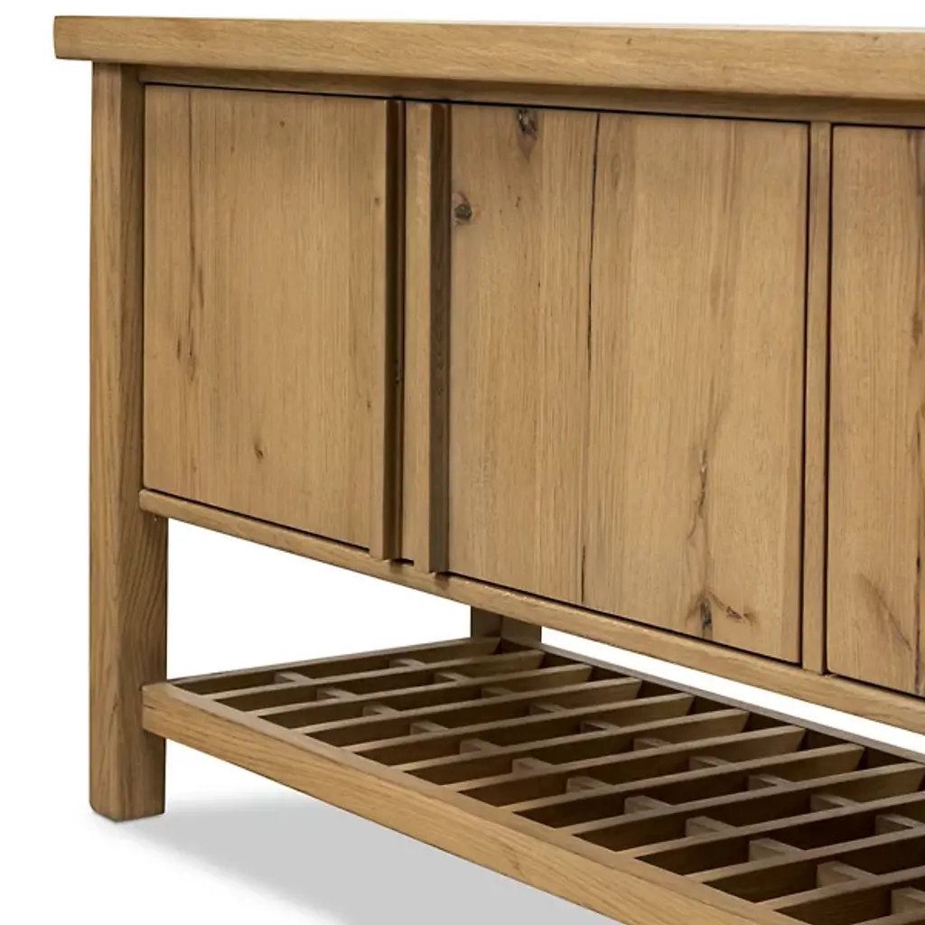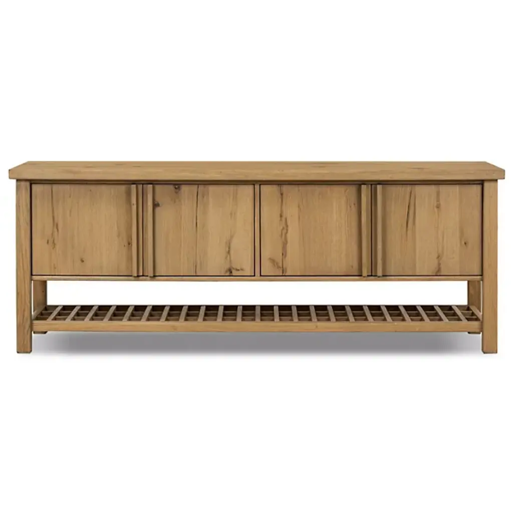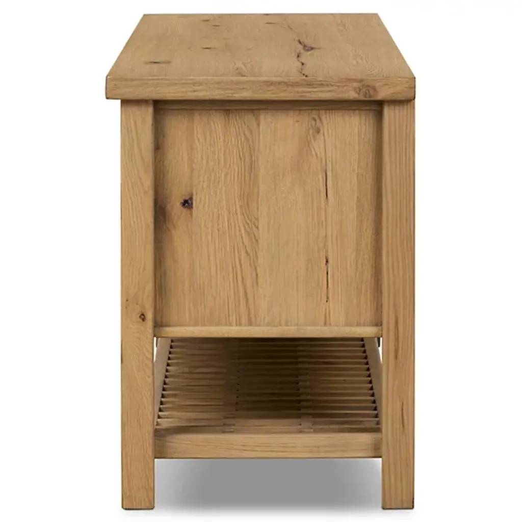 The Dalton Media Storage from Four Hands brings a sense of calm to any space. Crafted from aged natural oak, it features beautiful cross-lap joinery that highlights its thoughtful craftsmanship. Inspired by the serene simplicity of Japanese tea houses, open lower shelving adds extra room for storage or display, making it as practical as it is peaceful. It's the perfect blend of form and function, designed to complement the space with quiet elegance.