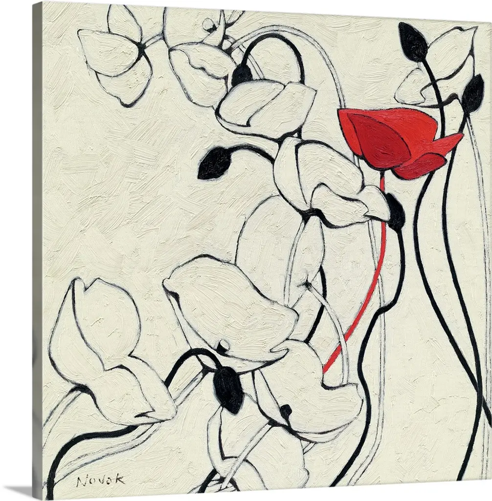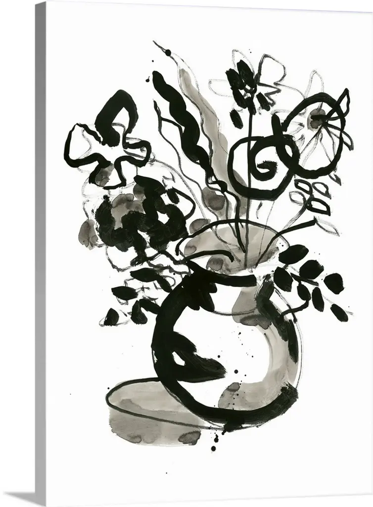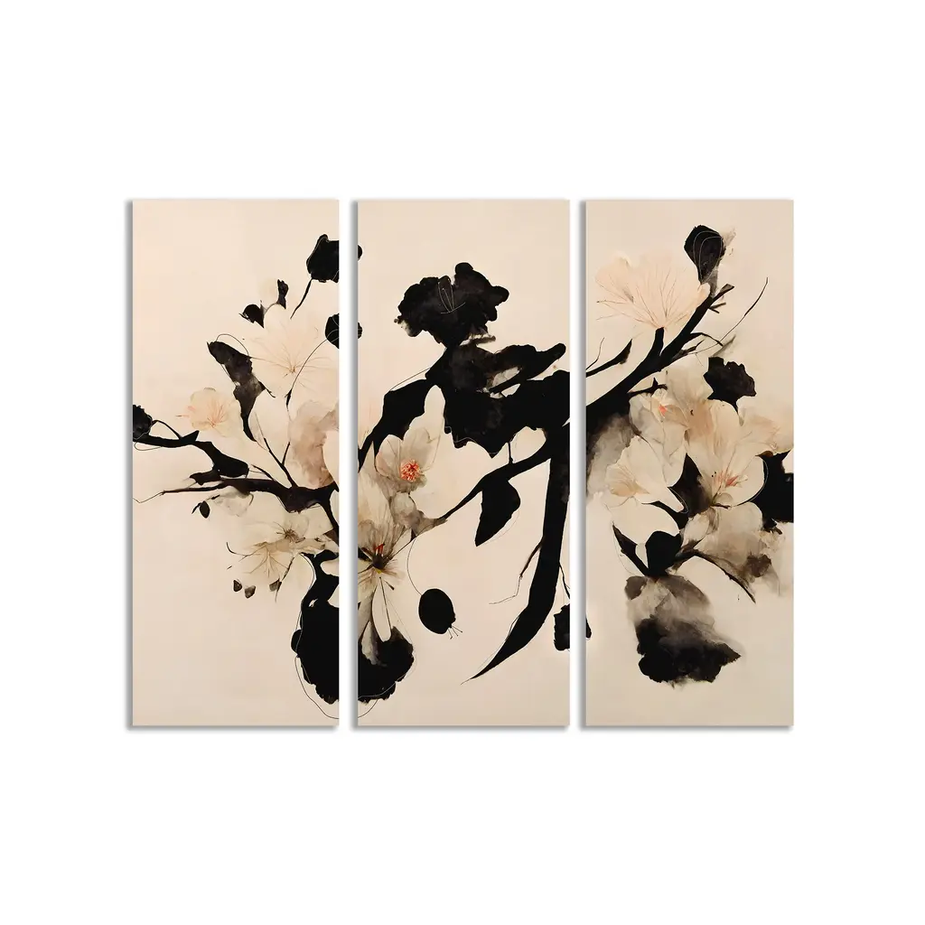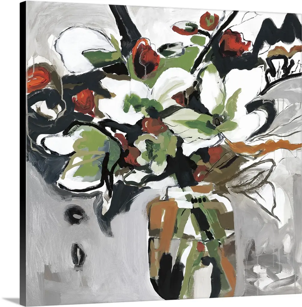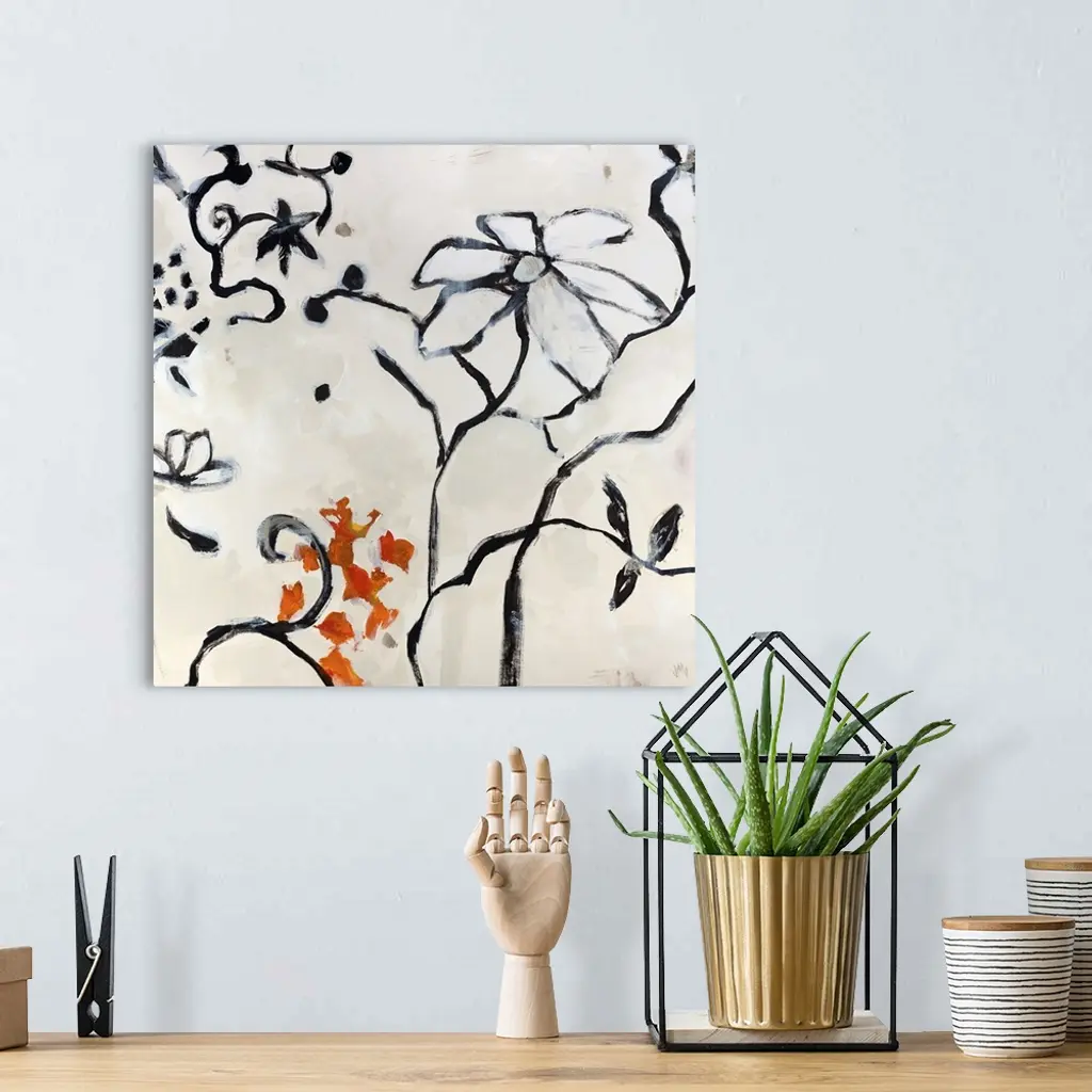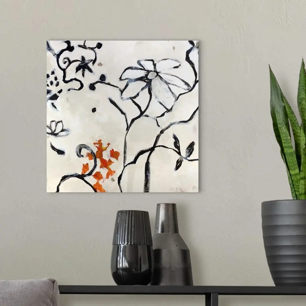 Square, large home art decor of simple, jagged branches and twirling vines with various flowers and leaves, on a neutral background with minimal texture.