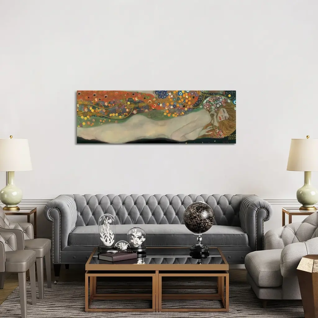 Big classic art portrays a nude woman sleeping while in a curled position. Surrounding the female are various patterns that incorporate an abundance of brightly colored circles.