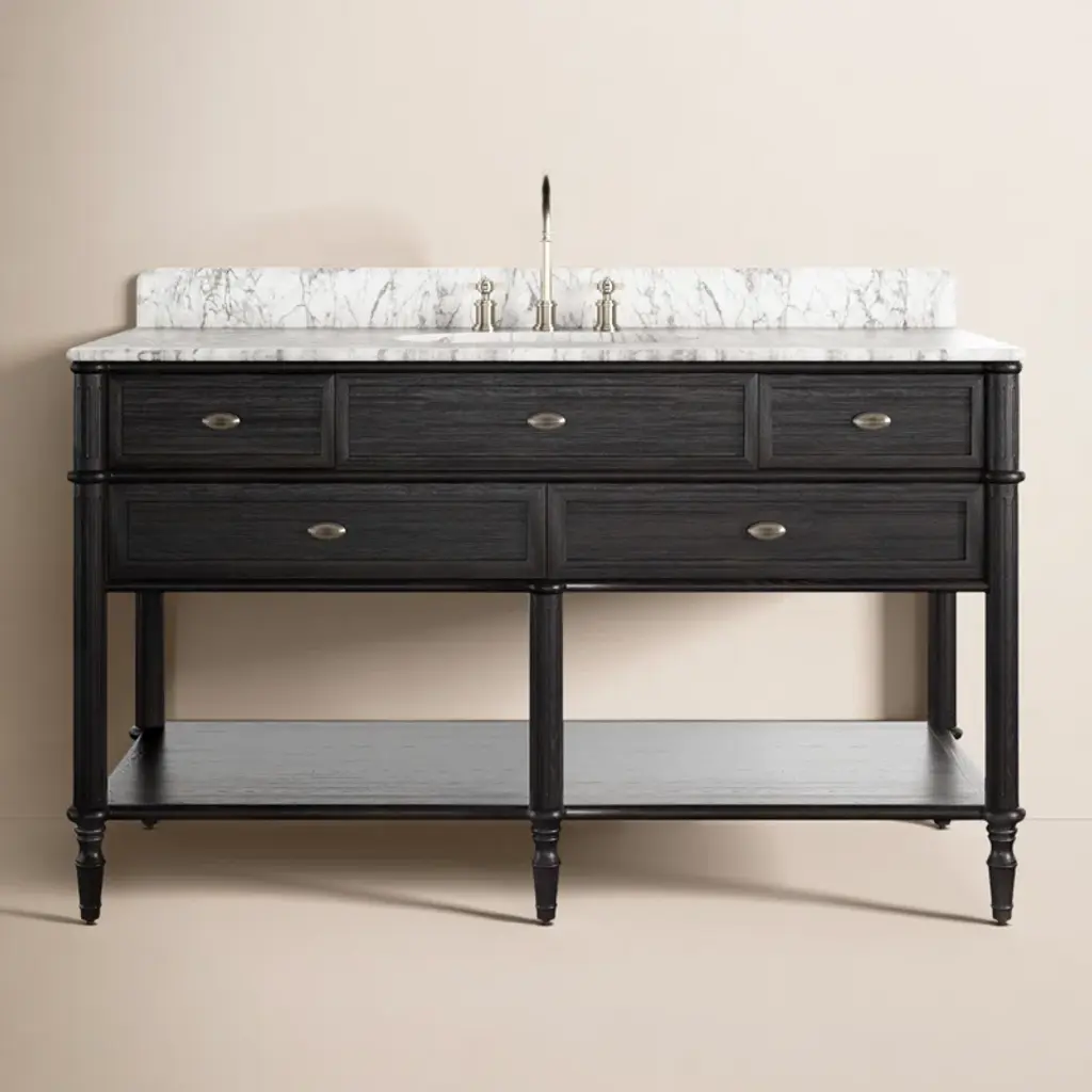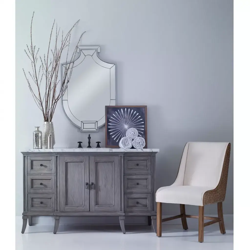 A large six drawer, two door sink chest with a wire brushed grey finish. Made from Mindi wood. Solid brass hardware. Statuario marble top.