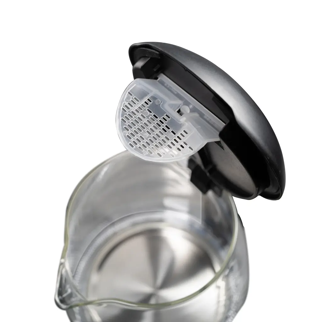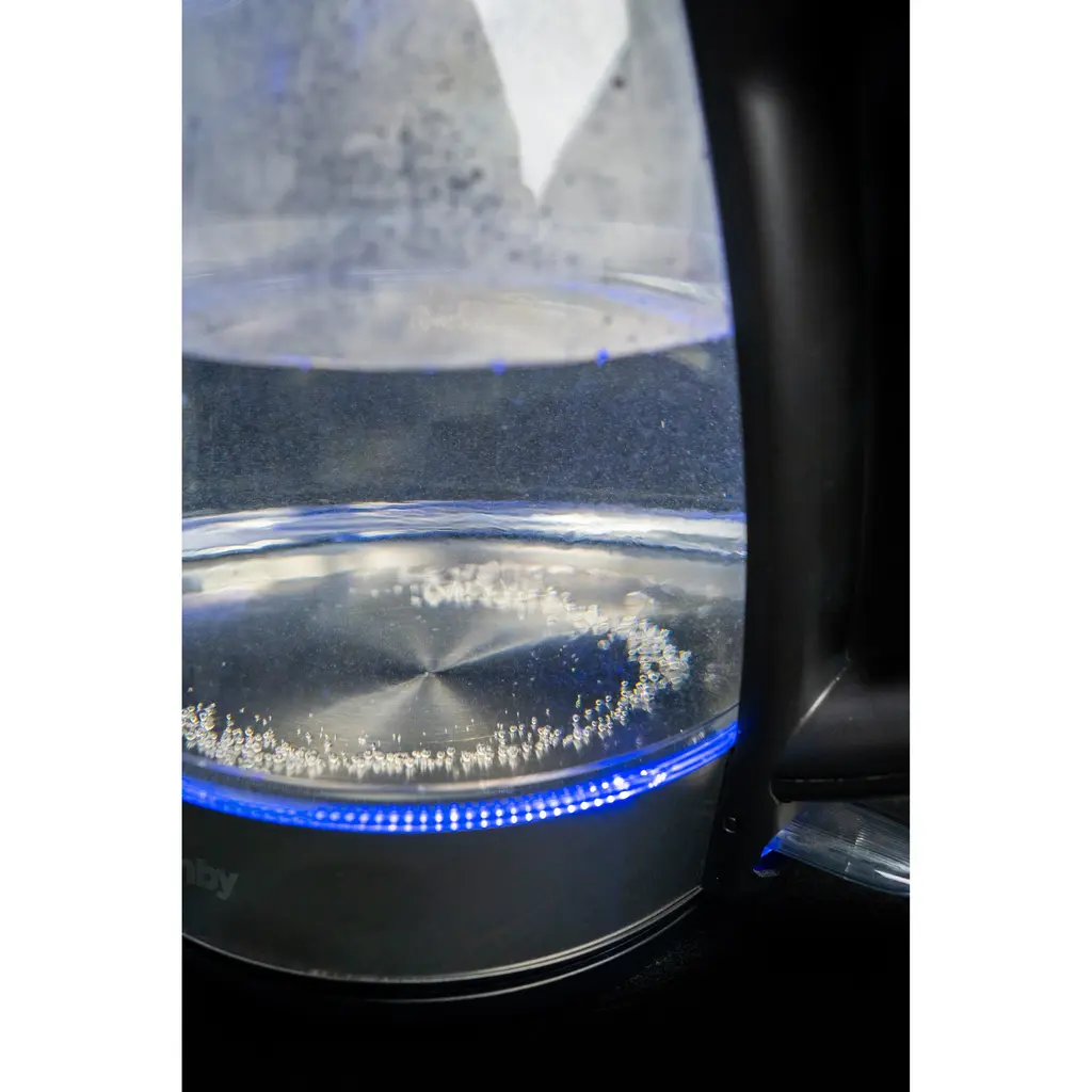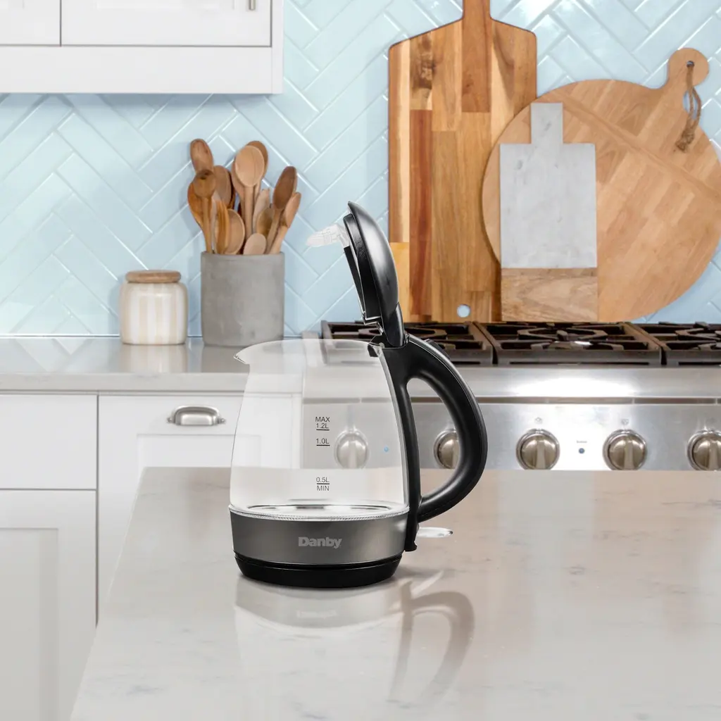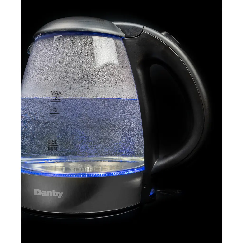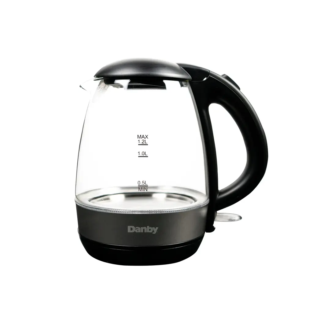 Enjoy the perfect cup of tea, hot chocolate, or make instant meals with the 1.2L capacity glass kettle by Danby. Ideal for small households to make a quick drink or for the college student short on time but needs a quick meal. Features include a blue LED indicator light when turned on and a built to last design that is compact, space-saving and looks great in any modern kitchen. With 1500 watts, this electric kettle is easy to operate, store and can boil water faster than a microwave. The powerful rapid-boil system provides fast heating from any standard outlet and the auto shut-off function helps keep the kettle from boiling dry. Pair this model with your French press and make the ideal cup of coffee. All your hot beverages and quick meals can be served easily with the 360-degree rotating base, allowing easy filling, and pouring without the cord.1.2 Litre size Glass KettleStylish blue LED indicator light when turned onCordless, kettle lifts off 360-degree swivel baseMesh filter in spoutManual on/off switch on handleSafety first - boil-dry protection and auto shut-off when water boilBlack and stainless steel1500W of powerCapacity markings on the sideAuto-open lid with push of a buttonAnti-slip bottom