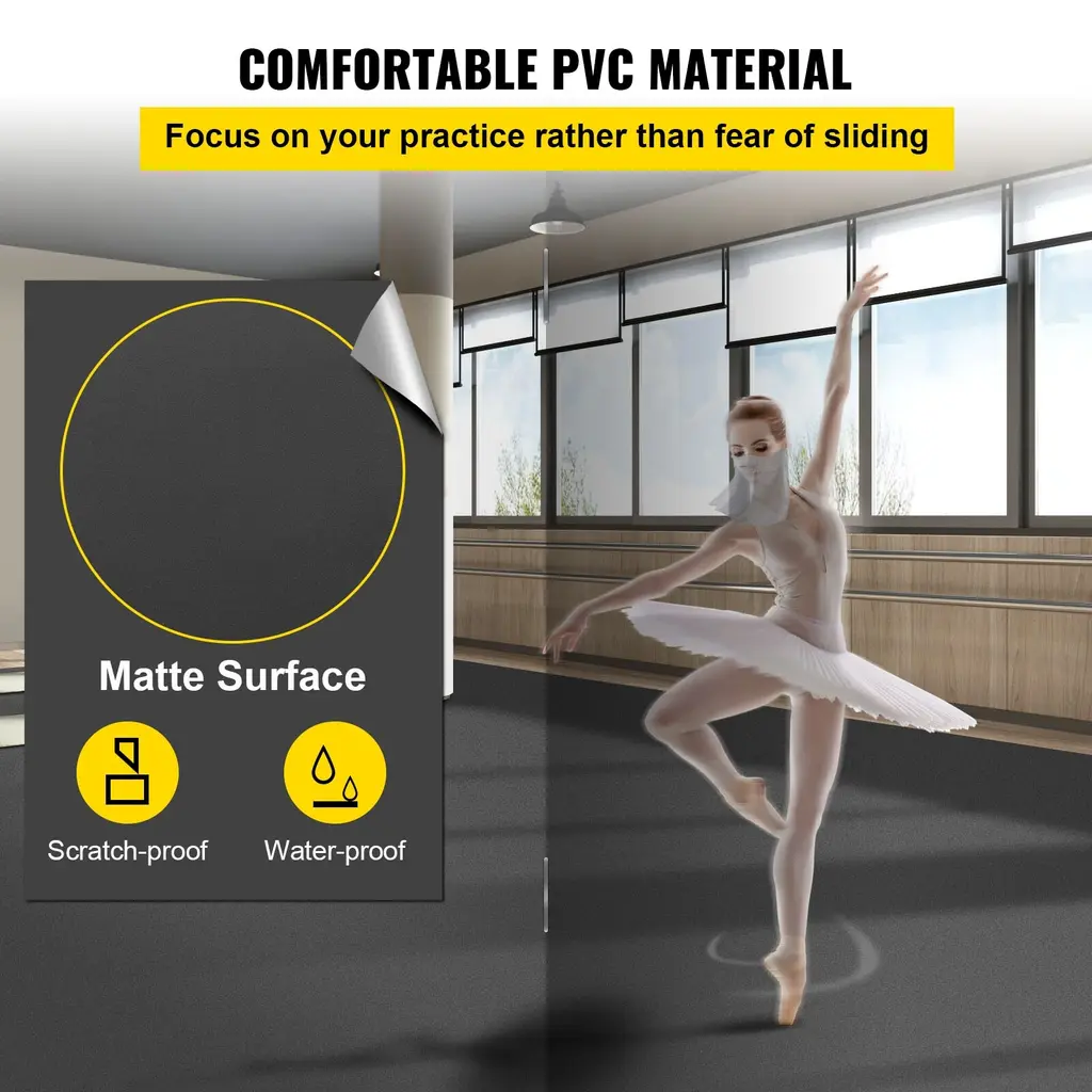 PVC Comfortable Material: Color: Grey/Black; Product Weight: 25.6 lbs /9.3 lbs. The high-quality dance floor is manufactured from scratch-proof, water-proof, and lightweight PVC material. Our product features a matte surface with the perfect balance of comfort and stability to keep the floor from sliding around and your feet from hurt. Ease of Assembly & Large Area: It is convenient to tape the dance floor roll down for a temporary or semi-permanent installation by unfolding it. Meanwhile, this 6.6 ft x 9.8 ft /6.6 x 8 ft mat provides 64.6/52.8 sq ft of coverage to give you plenty of space to practice. Enjoy your dance time. Highly Flexible to Cut: Thickness: 0.06 in (1.5 mm). Thanks to its high flexibility, you can cut the vinyl dance floor to fit your multiple needs with knives or scissors. What's more, you can turn the double-sided floor over for a perfect match with your different practice environments. Labor-Saving Cleaning: The portable dance floor is easy to clean and maintain. All work will be done instantly by sweeping any loose debris or dirt, cleaning stains with a damp mop, and gently scrubbing away scuffs. Hence, it can be used for a long time without being replaced. Multiple-Use Application: This dance flooring works well for various ways involving wearing soft shoes or bare feet, including ballet, jazz, hip hop, and modern dance. Our product is widely applied to different places such as homes, dance studios, gyms, etc. Package Content 1 x Dance Floor Mat