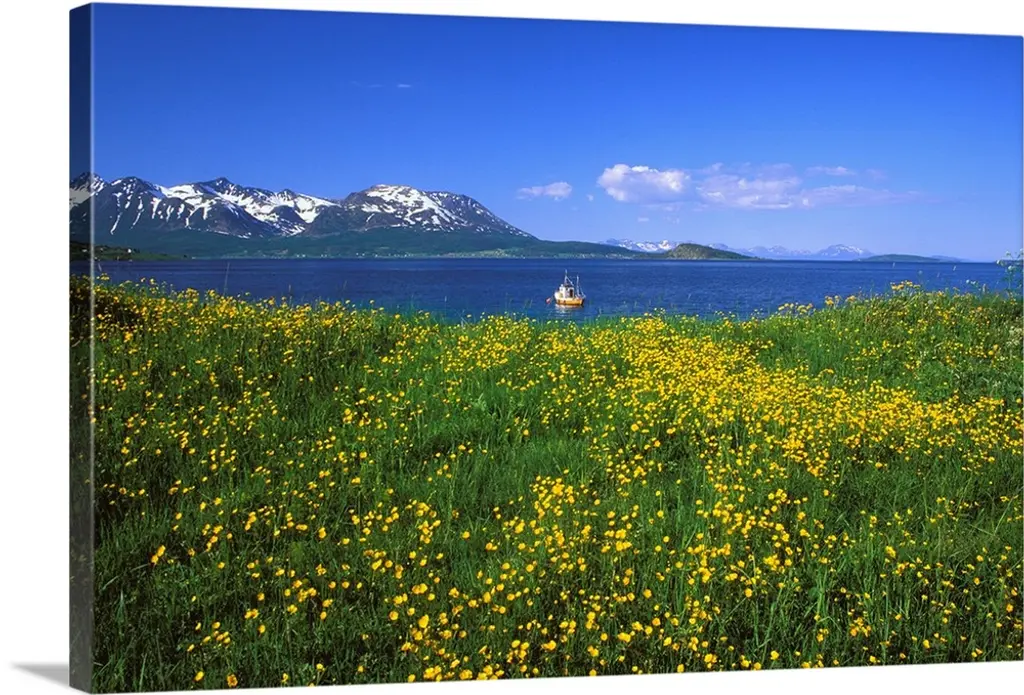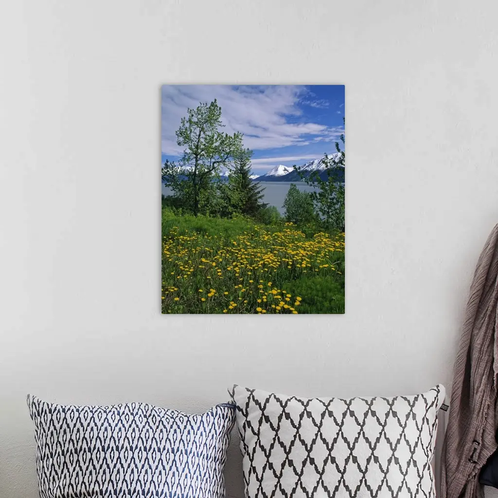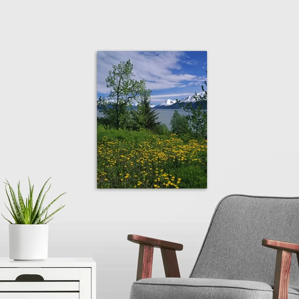 Big, vertical photograph of trees and a field of dandelion flowers along the shore of Turnagain Arm. The snow covered Chugach Mountains in the background, in Alaska.