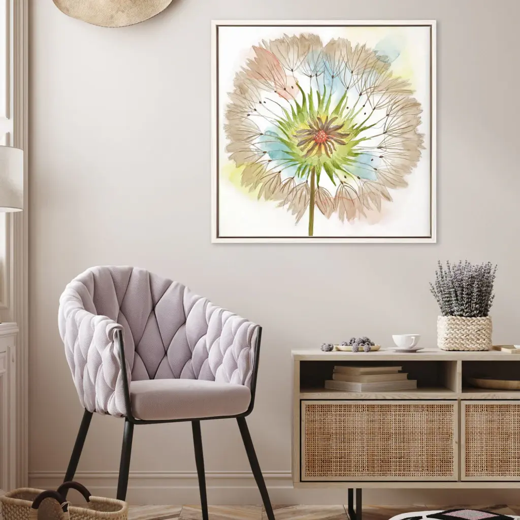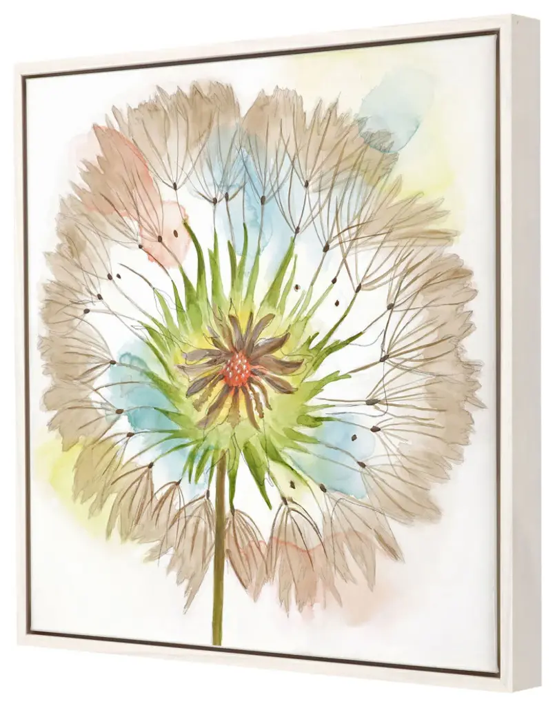 Exclusive hand painted canvas. Hand stretched and mounted in a whitewash wood floater frame.