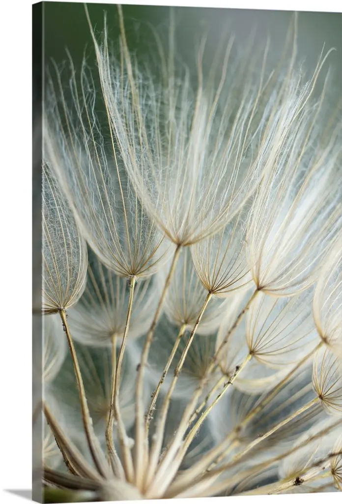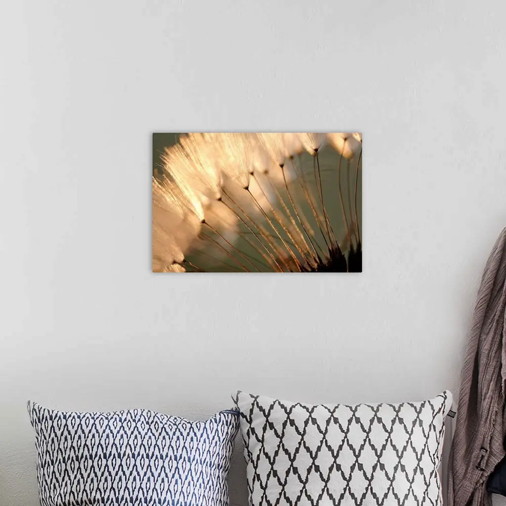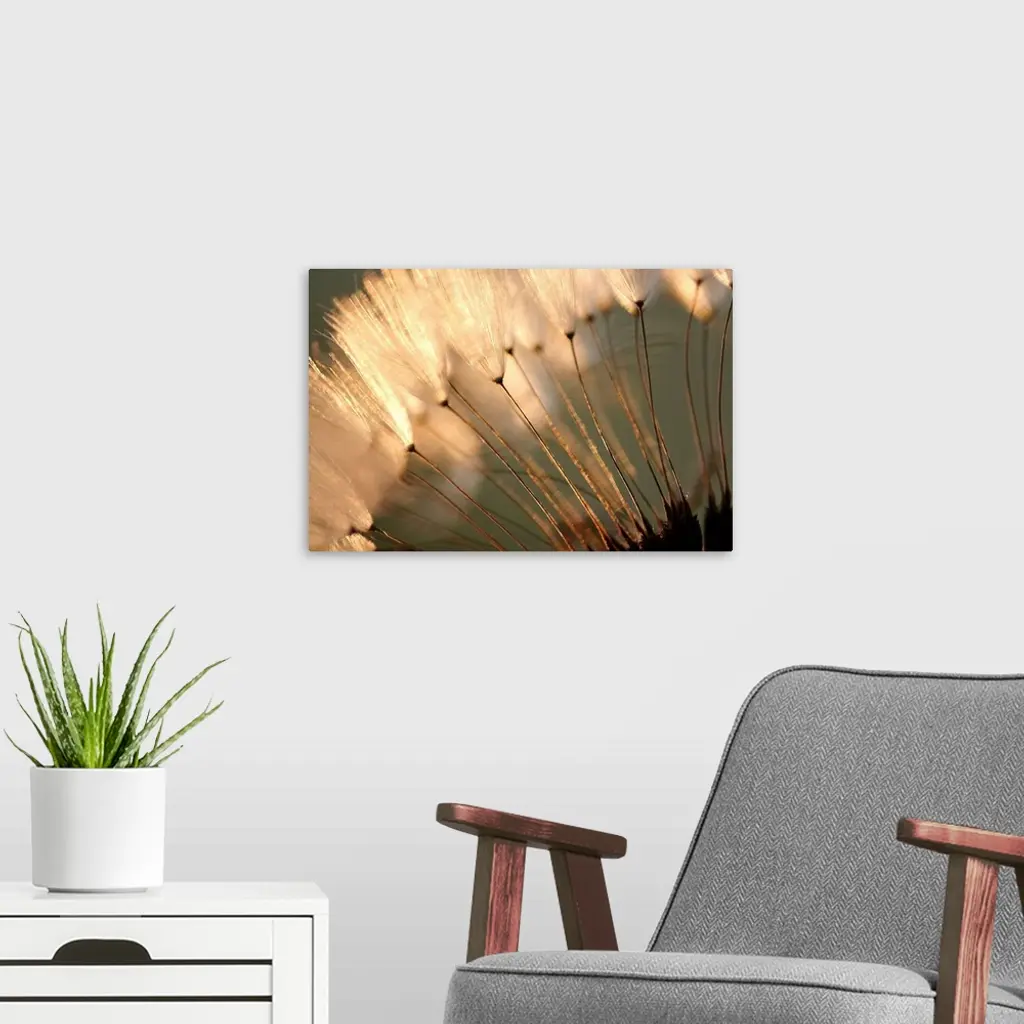 Landscape close up photograph of white, fluffy dandelion seeds at sunset.