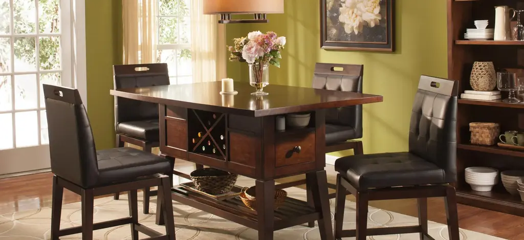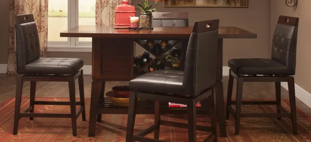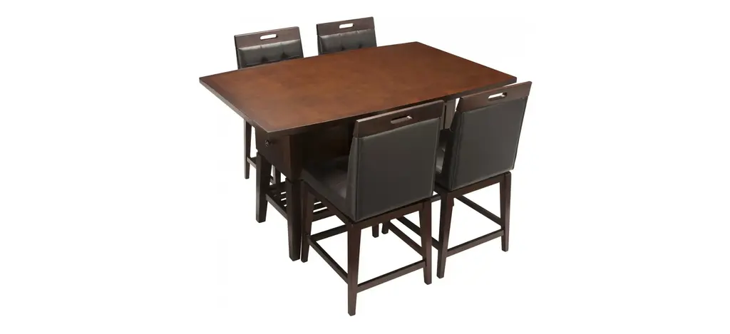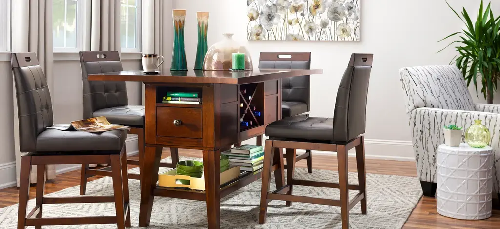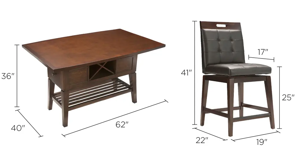 The Danfield 5-pc. counter-height dining set marries style and storage. Perfect for entertaining, the table has a removable wine rack to keep extra bottles handy. Drawers and nooks on either end of the table offer convenient storage for napkin rings, candles and other table accessories. Use the lower shelf for added storage or holiday display. The stool swivels 180 degrees and features footrests as well as a comfortable padded seat and back to encourage family members and guests alike to linger long after the meal is done.