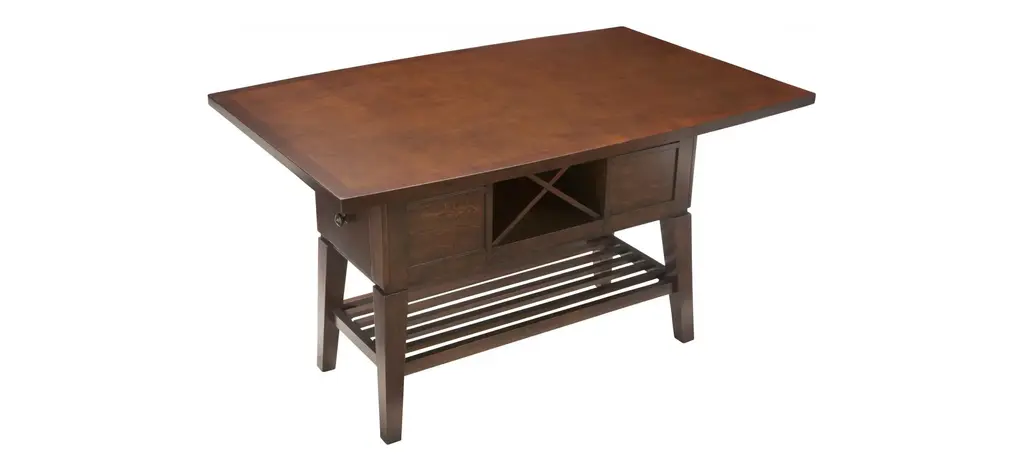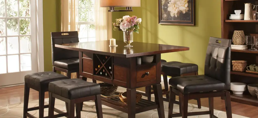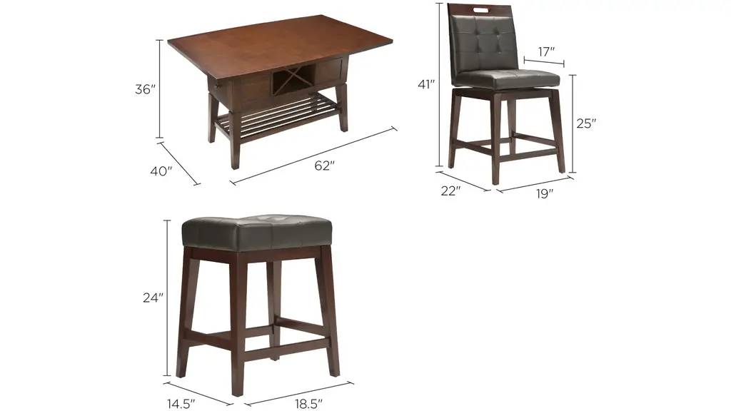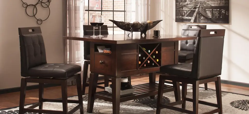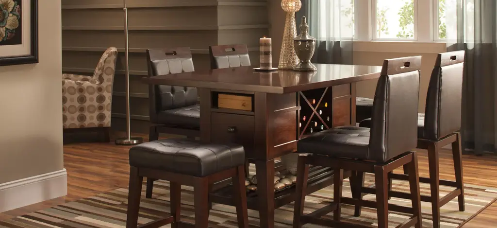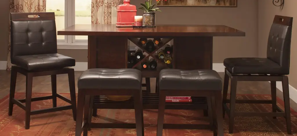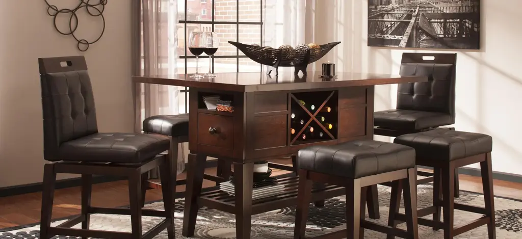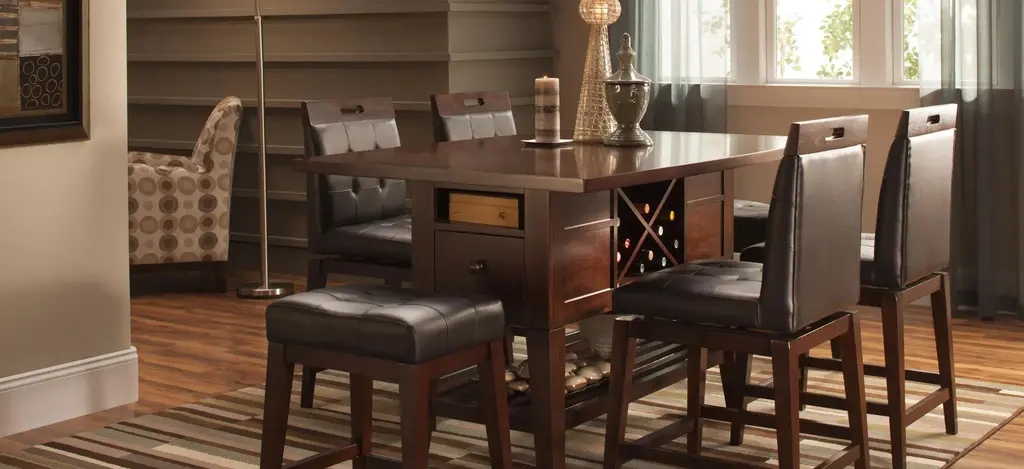 The Danfield 7-pc. counter-height dining set marries style and storage. Perfect for entertaining, the table has a removable wine rack to keep extra bottles handy. Drawers and nooks on either end of the table offer convenient storage for napkin rings, candles and other table accessories. Use the lower shelf for added storage or holiday display. The stool swivels 180 degrees and features footrests as well as a comfortable padded seat and back to encourage family members and guests alike to linger long after the meal is done.