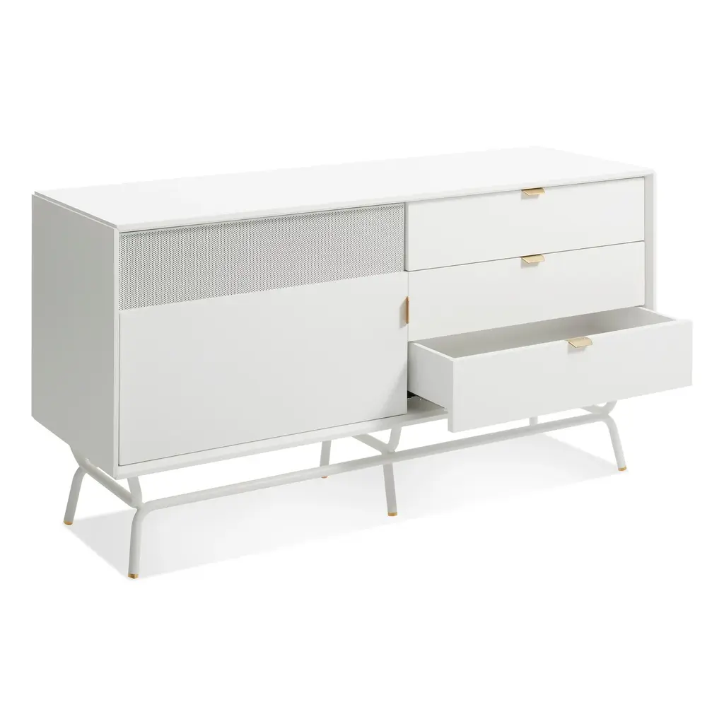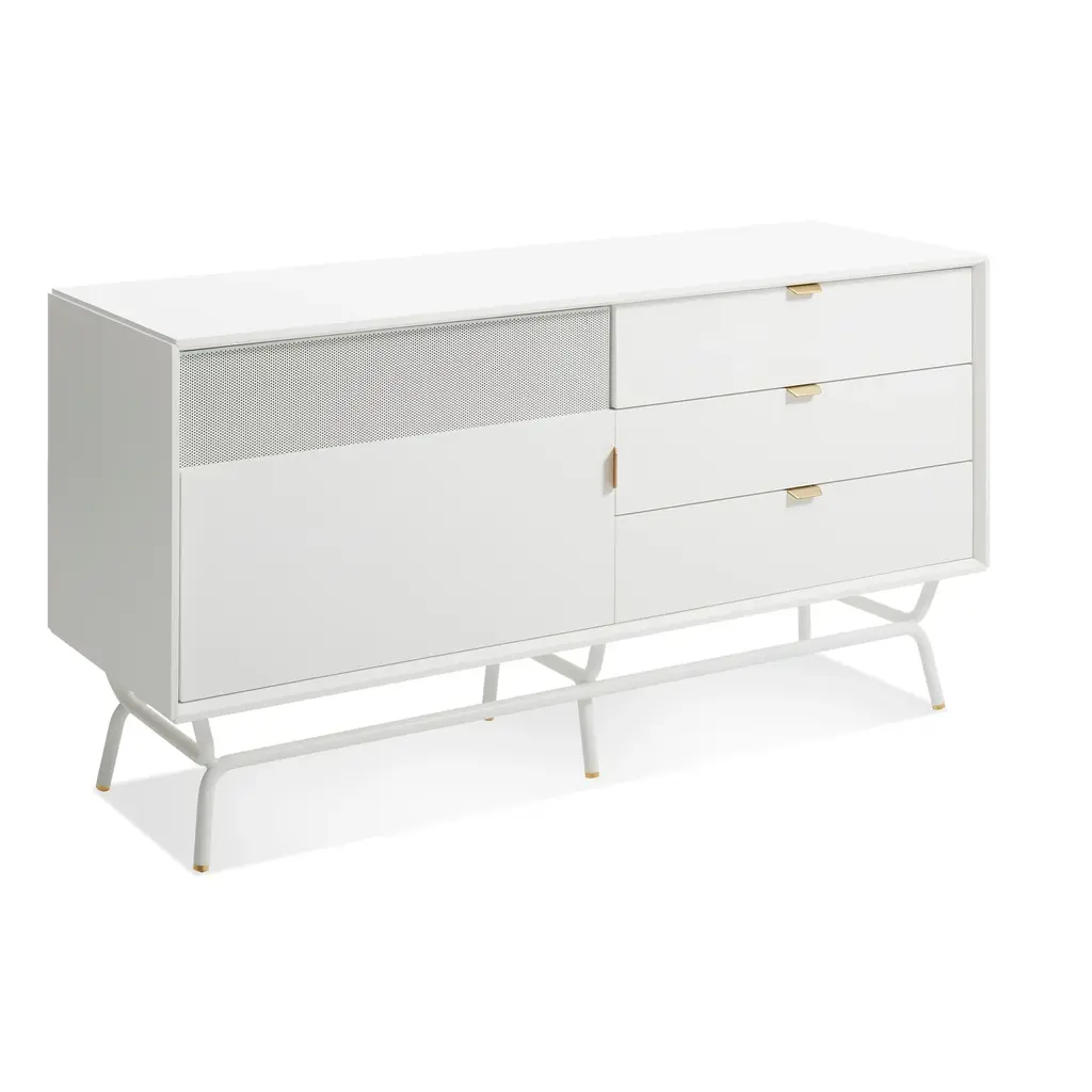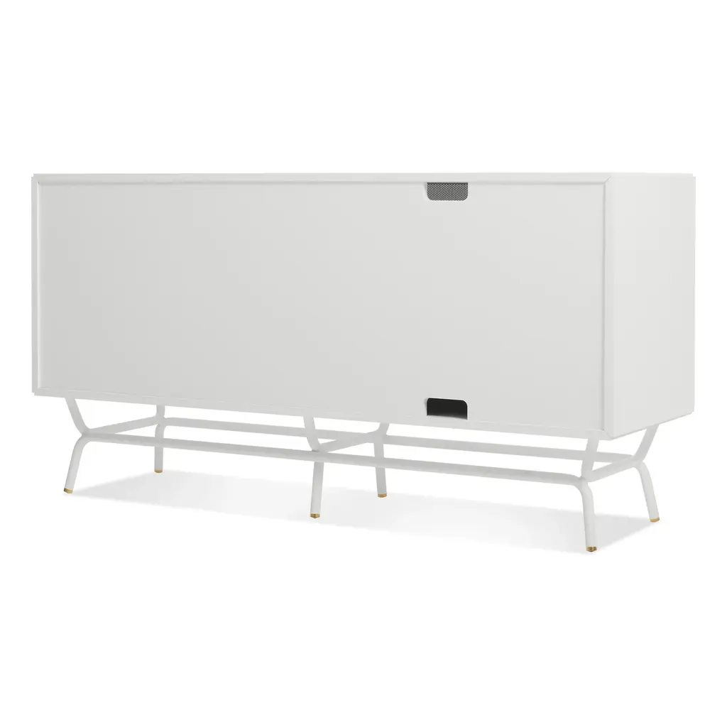 Perforated steel door front allows use of remotes without spoiling the view. Brass details and powder-coated steel base.