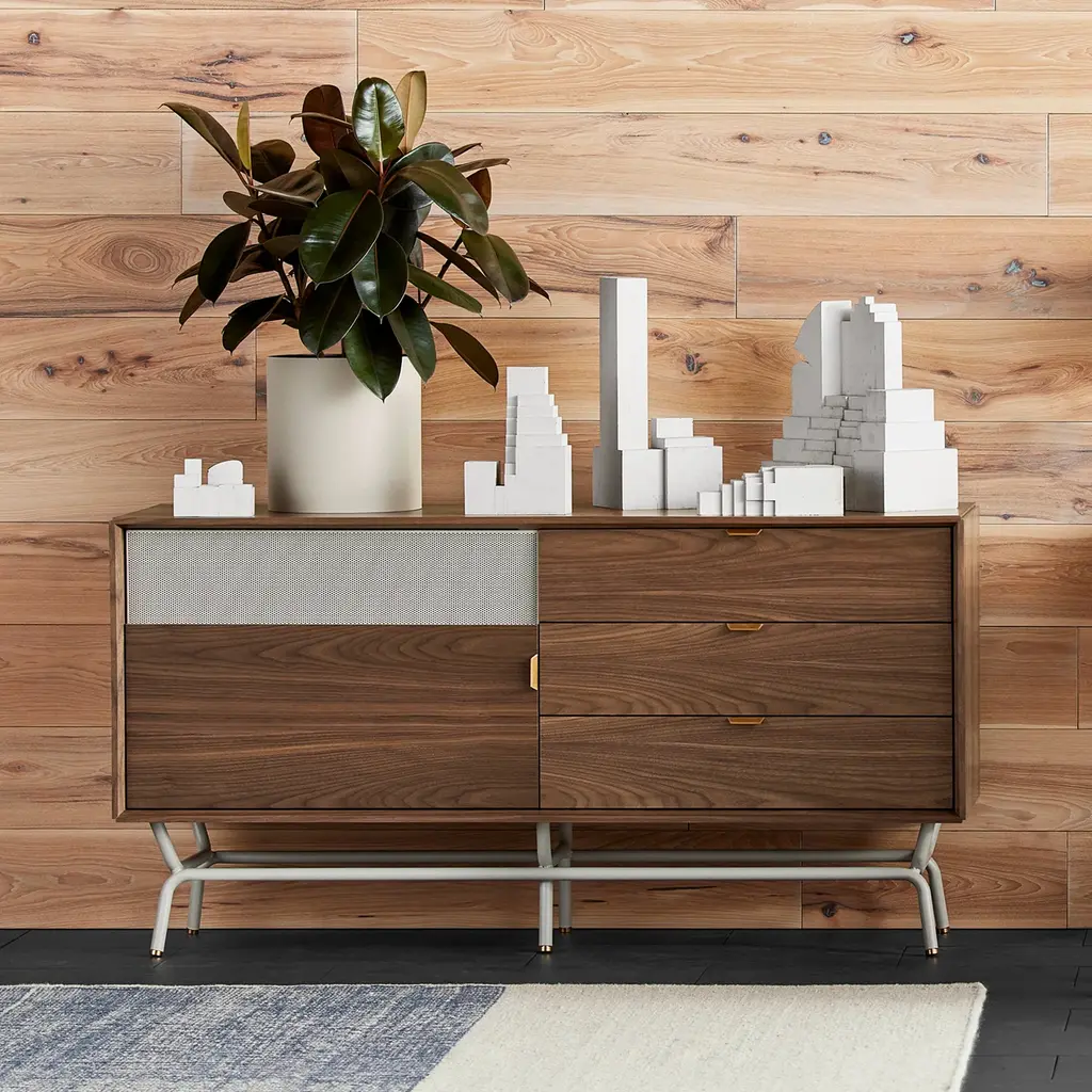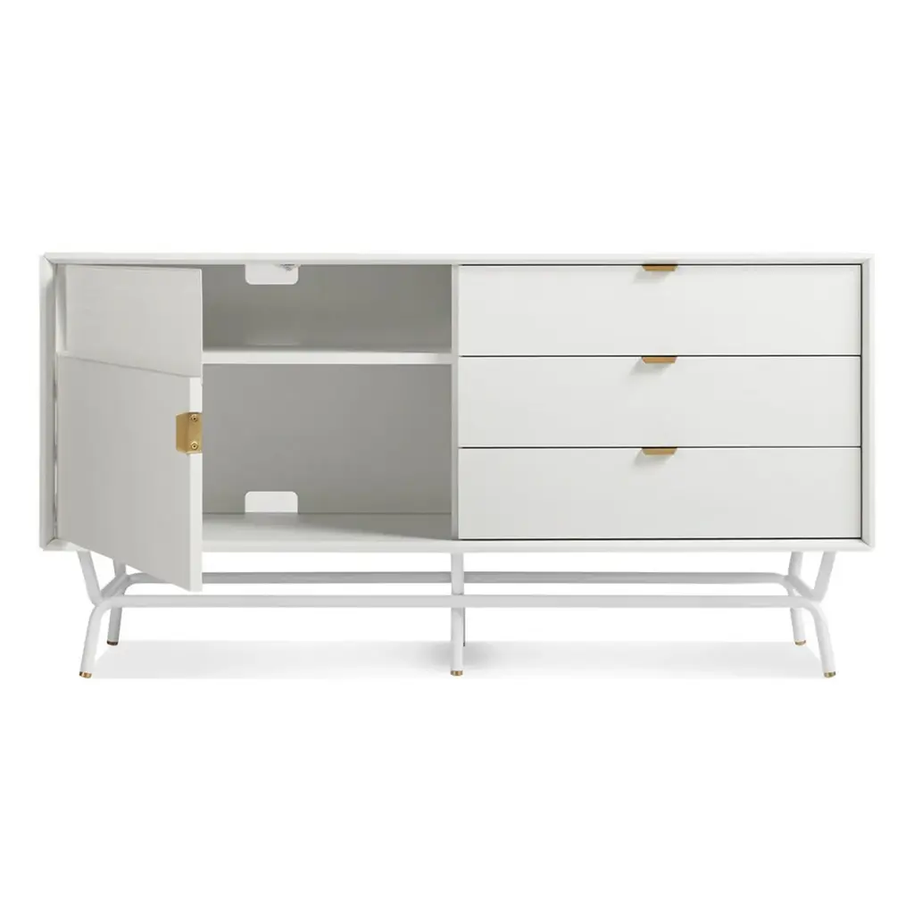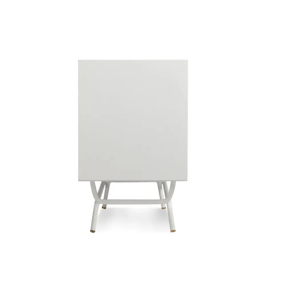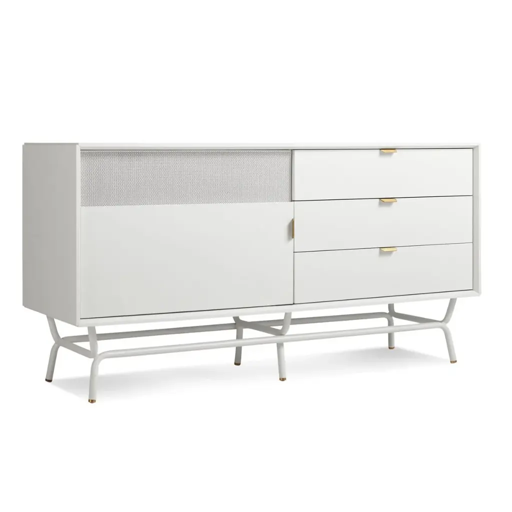 Perforated steel door front allows use of remotes without spoiling the view. Brass details and powder-coated steel base.