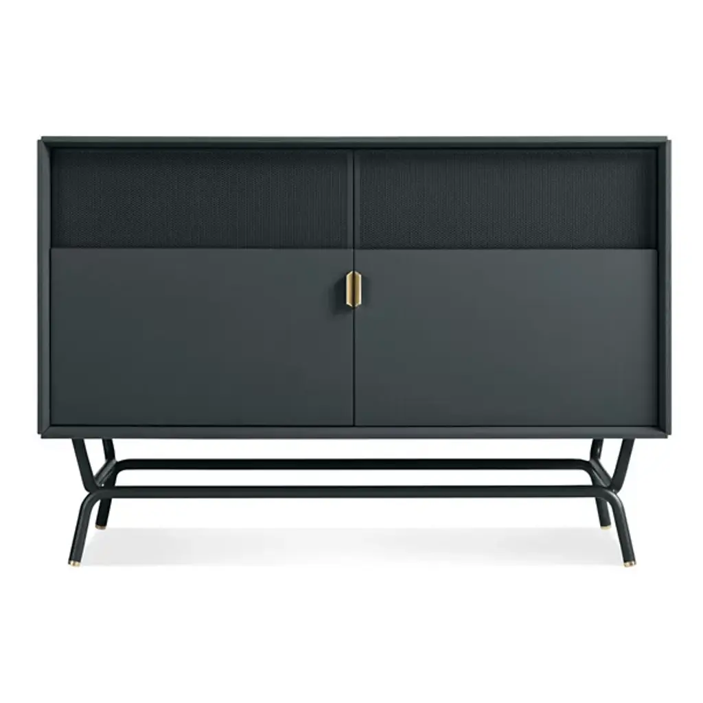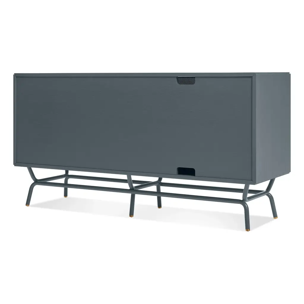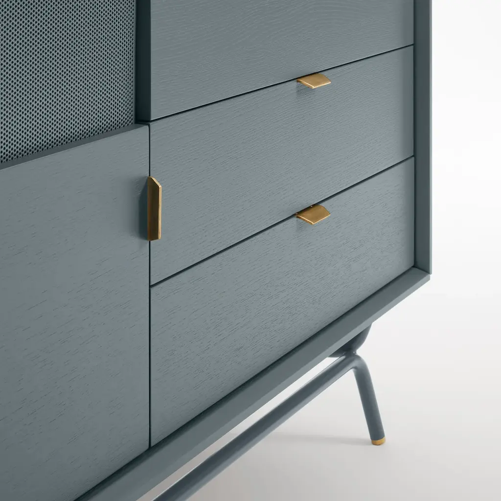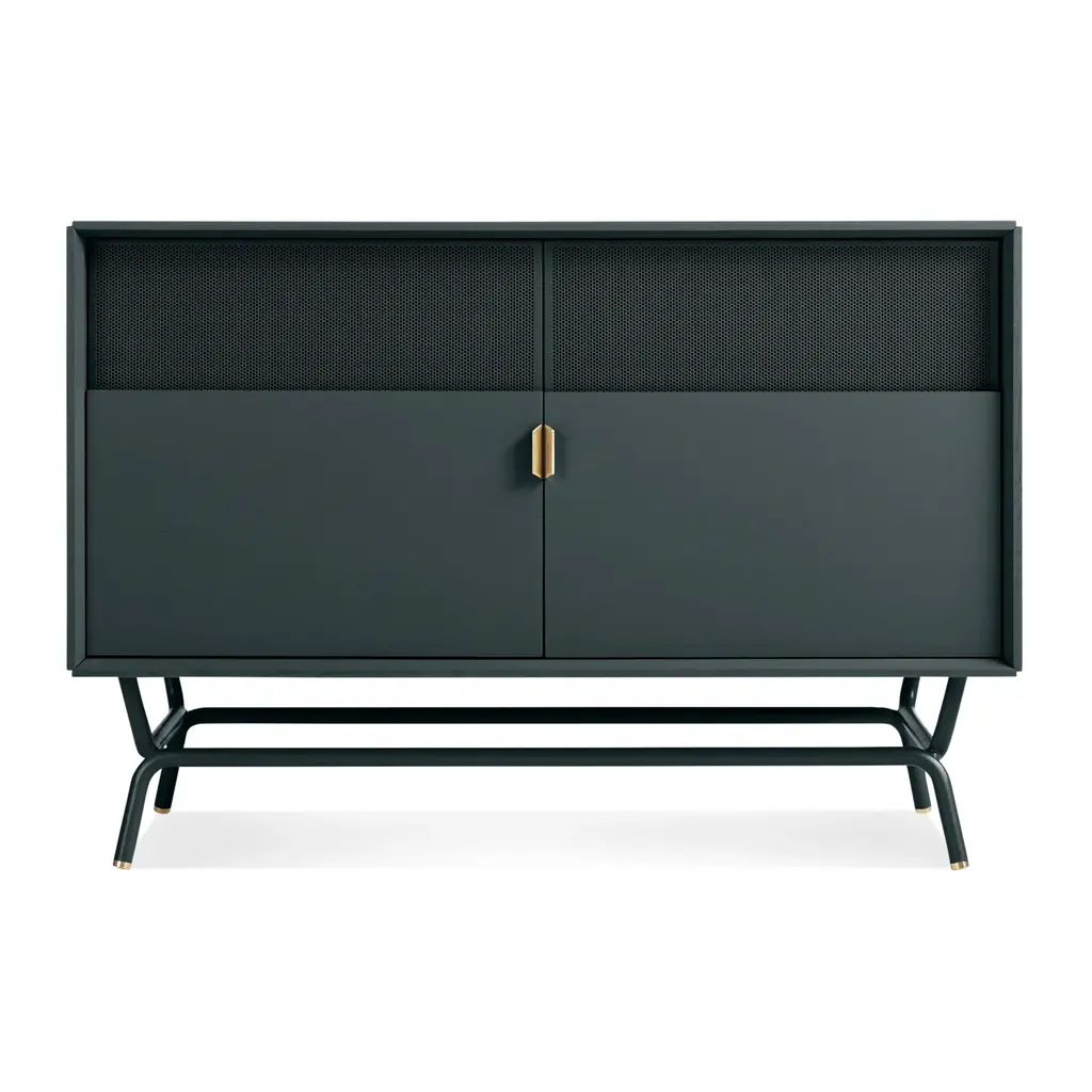 Perforated steel door front allows use of remotes without spoiling the view. Brass details and powder-coated steel base.
