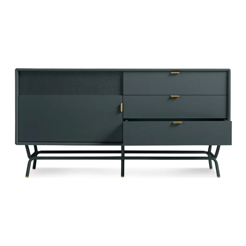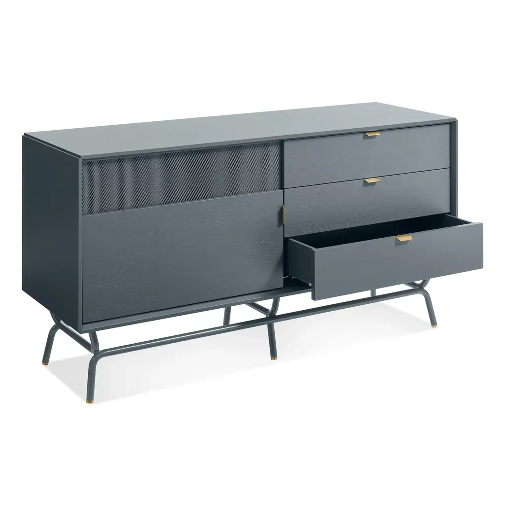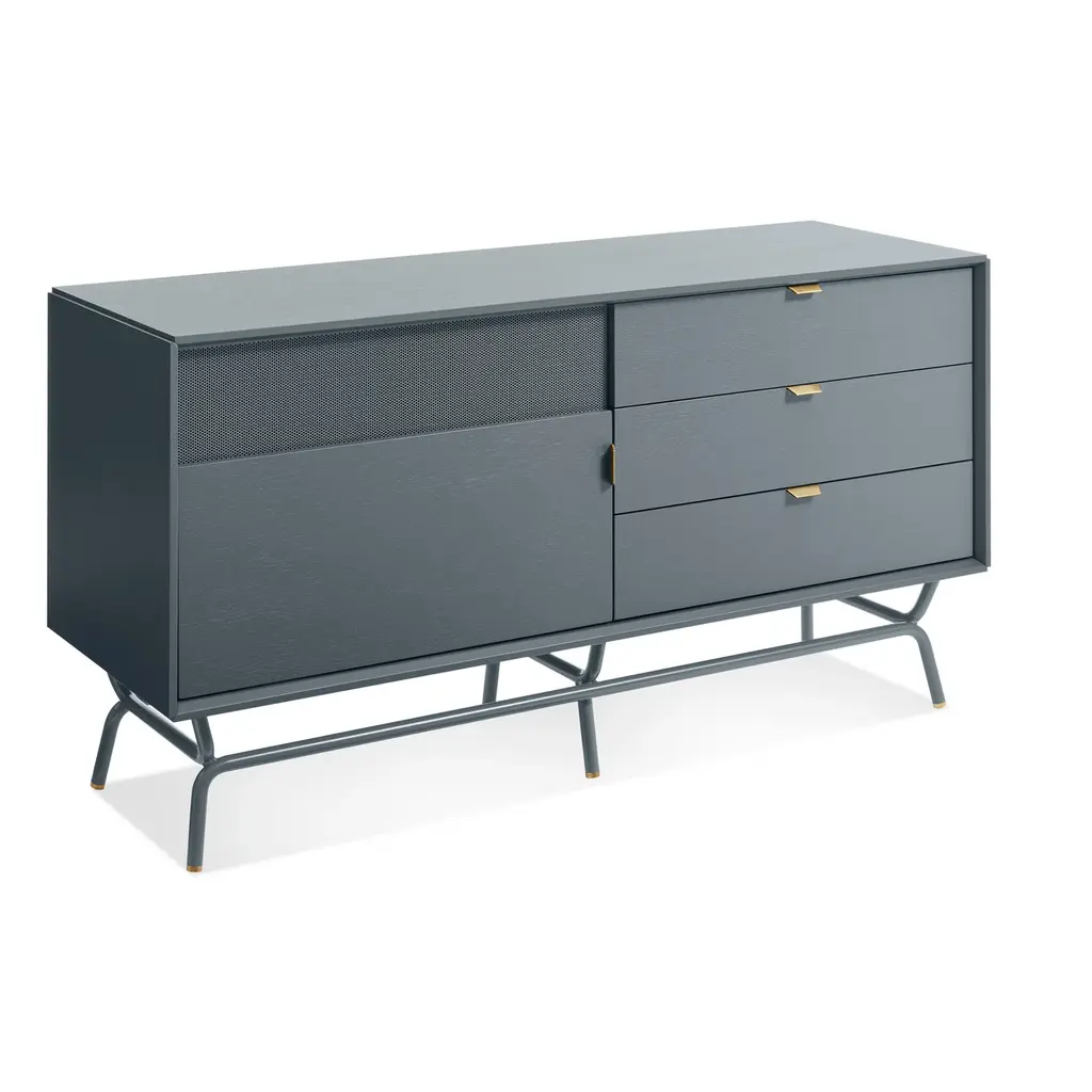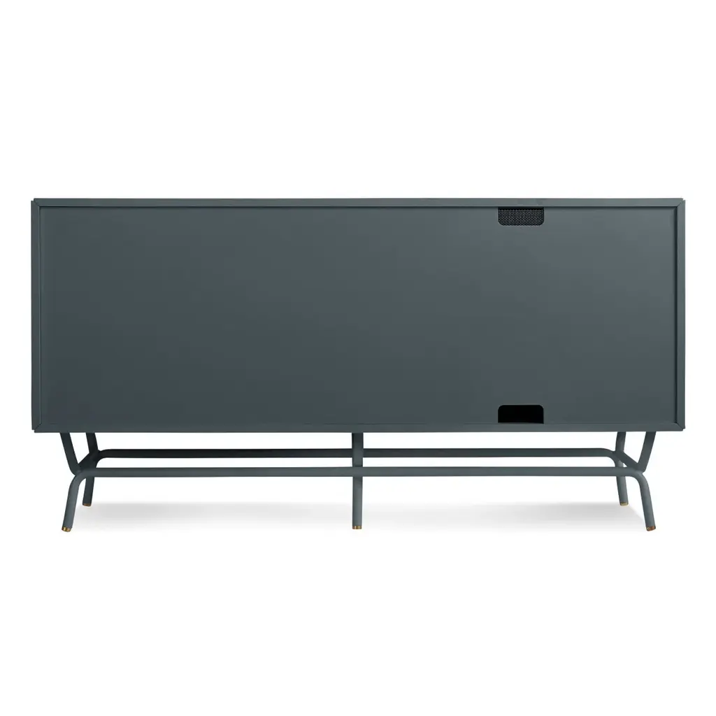 Perforated steel door front allows use of remotes without spoiling the view. Brass details and powder-coated steel base.