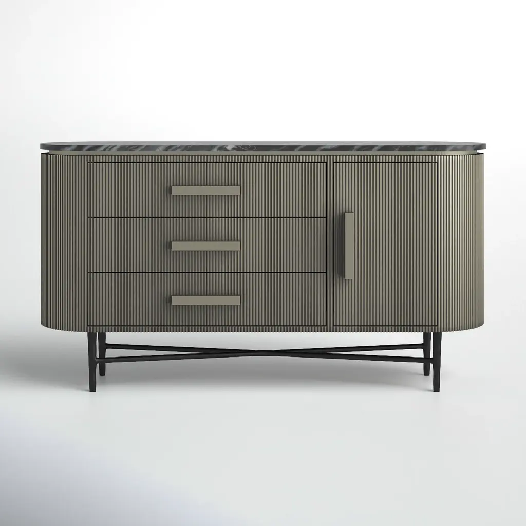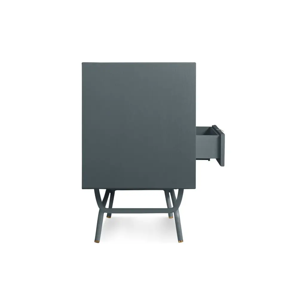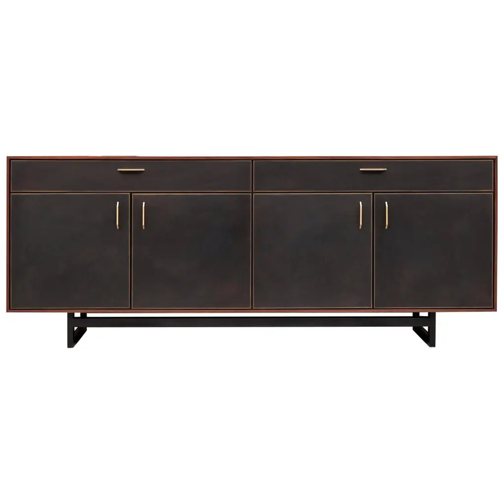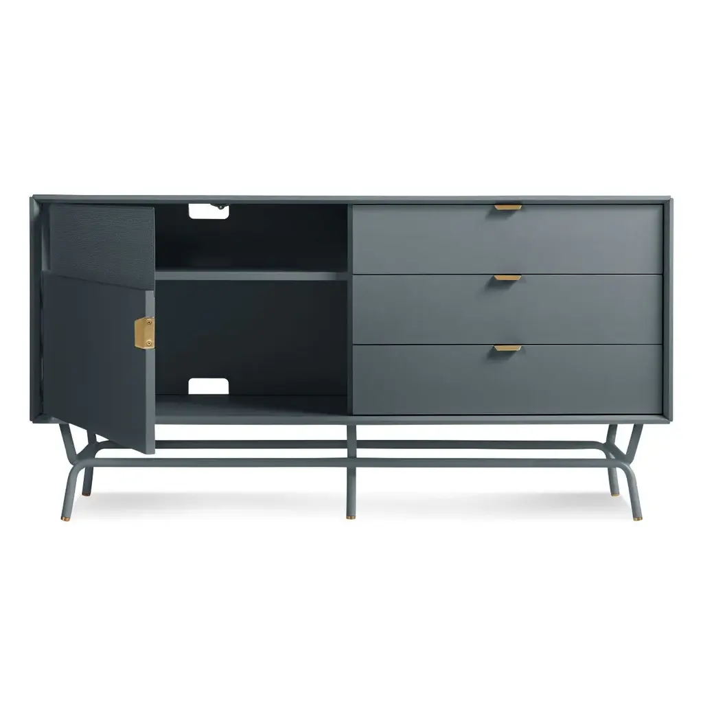 Perforated steel door front allows use of remotes without spoiling the view. Brass details and powder-coated steel base.