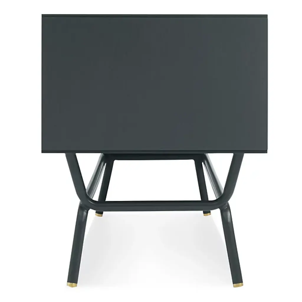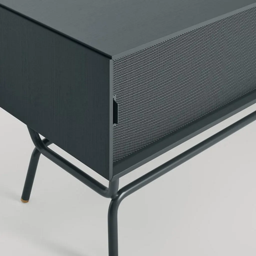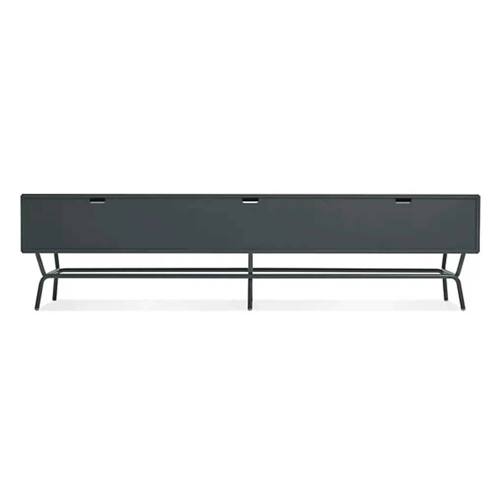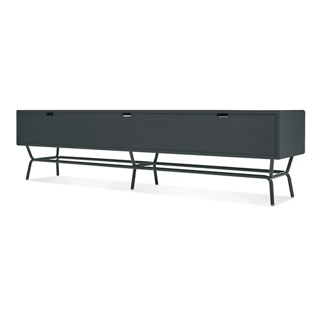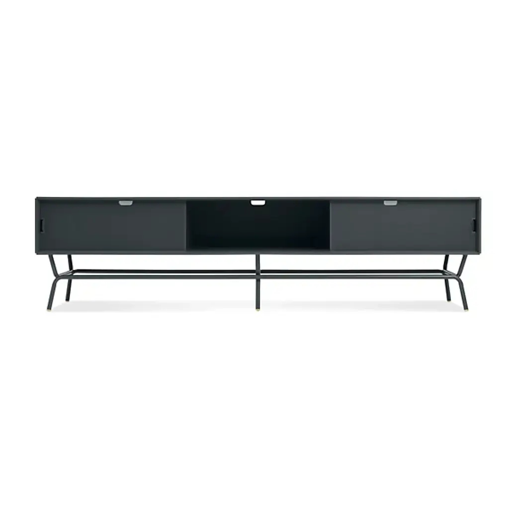 A distinctive style with homey aesthetics. The Dang Long and Low Console from Blu Dot has a pair of perforated steel doors that will allow you to use remote controllers without ruining the look of the piece, making it perfect for supporting televisions in living rooms. The doors cover two-thirds of the available space for easy-to-reach storage. The frame base is made from powder-coated steel for longevity. Holes in the back panel let you easily manage your cables from game or movie consoles.