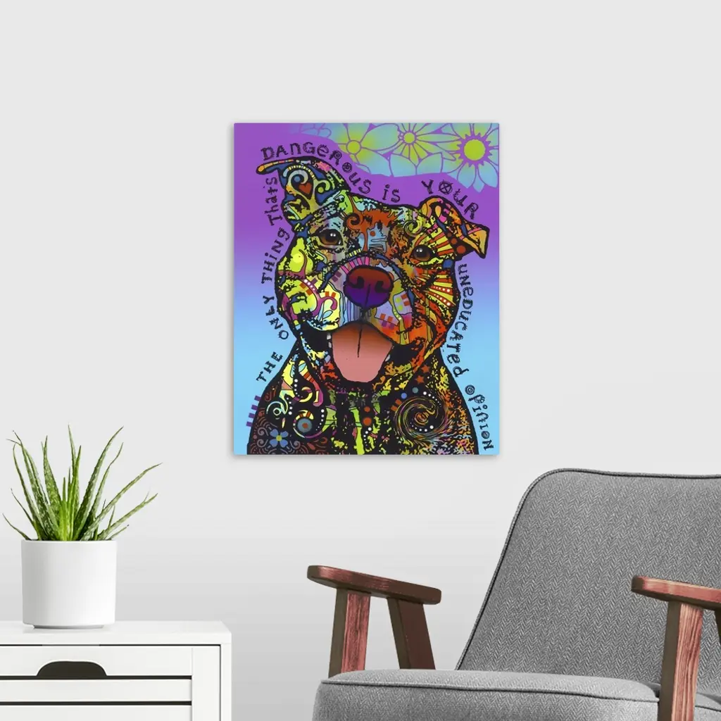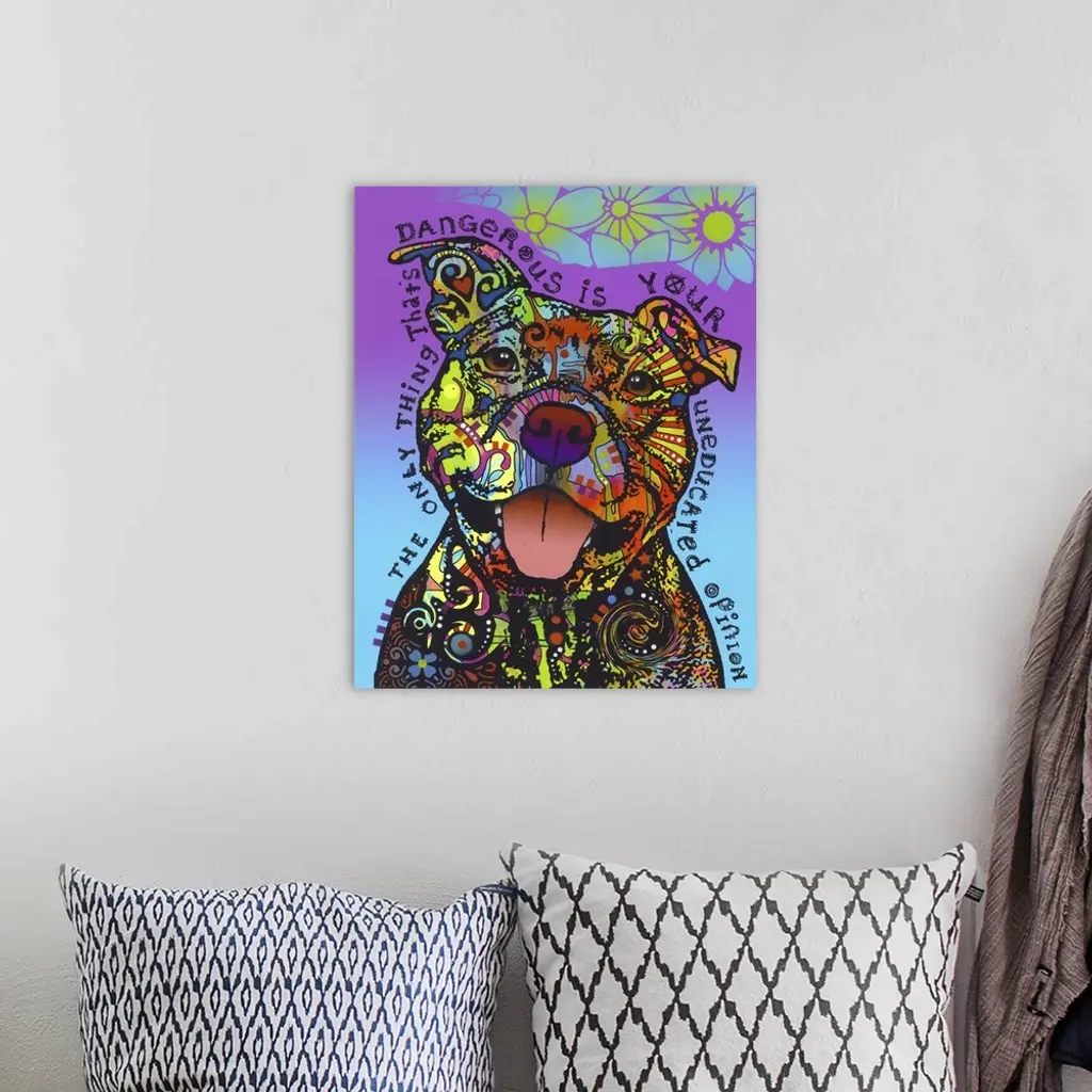 Adorable illustration of a pit bull with intricate, colorful designs all over its fur on a blue and purple background with flowers and "The Only Thing That's Dangerous is Your Uneducated Opinion" handwritten around the dog.