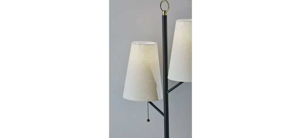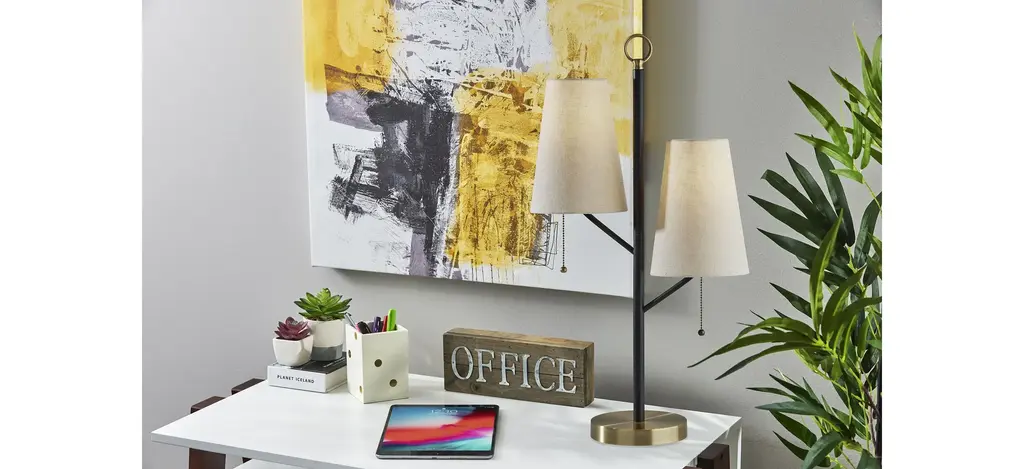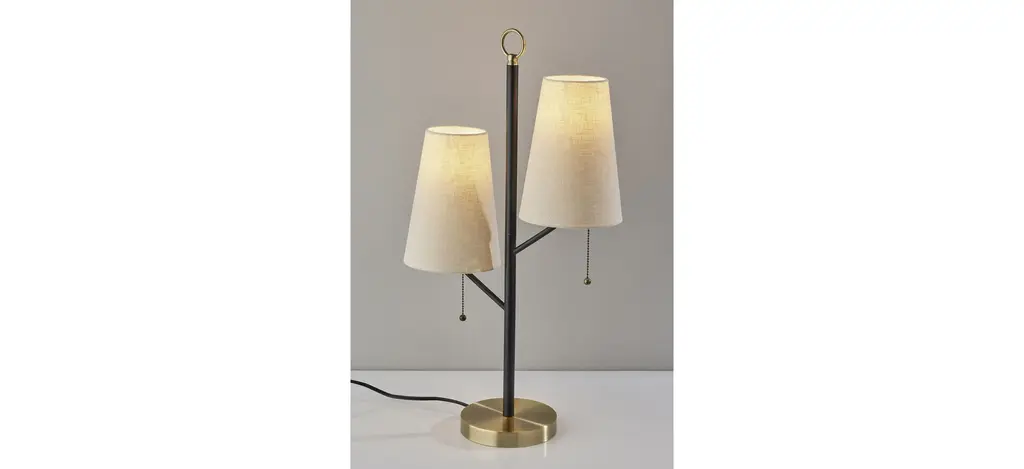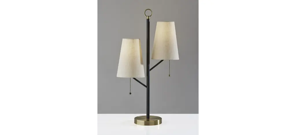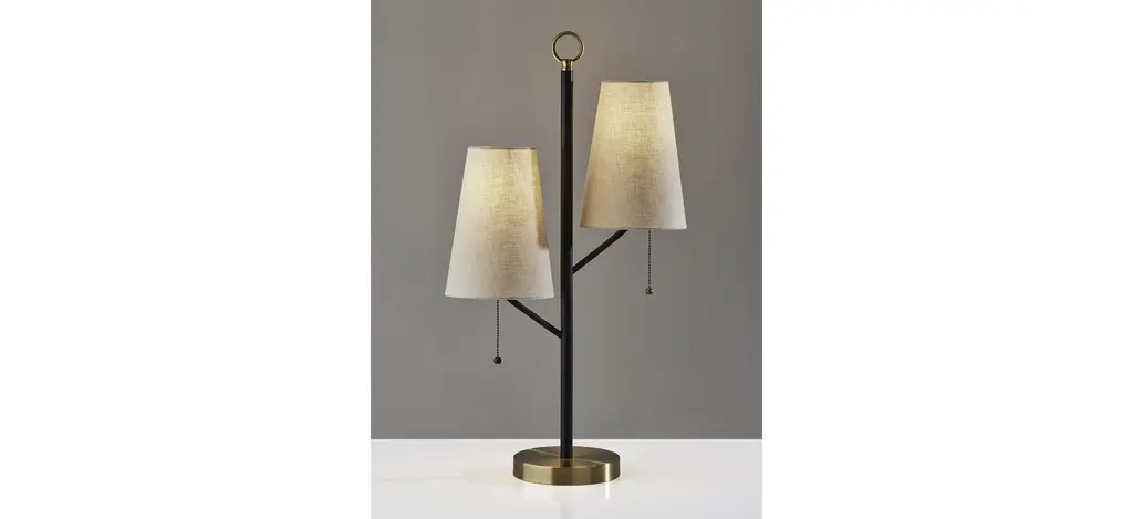 Brighten your room with a modern, industrial flair with the 27" Daniel table lamp. The clean silhouette, large offset shades, and combination of finishes create an understated yet stylish look. The lamp features a metal body, with coordinating antique finish on the base and top. Two arms present linear lines at offset heights leading to tall textured fabric shades. Each light is operated by a pull chain to easily turn the 40W bulbs (sold separately) on or off independently of each other, and the table lamp features a 5' cord.