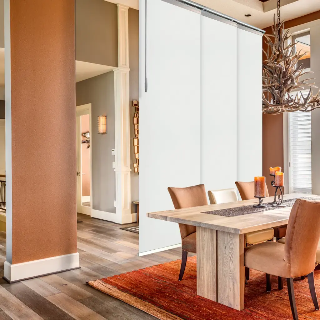 Central Design Products is pleased to introduce a new innovative panel track that offers easy 2-way installation, adding an alluring style and refined touch to your home decor. The single rail design of the track is sleek, compact, and reduces the overall footprint and weight of the installation, eliminating bulky, intrusive window treatments. Adjusting the panel height is a breeze � simply trim the panel, re-attach the liner, and install the panel weight. Detailed instructions are included.The panel track also features a patented slider design, made with aluminum and fitted with bearings that allow for durable and smooth operation. The sliders are stacked closer together than conventional panel tracks, reducing light bleed coming from the gaps between panels. This track has endless uses from dividing rooms, garages, offices, and closets to decorating windows and patios. Available in larger sizes including 8, 10, and 12 panels. Extends from 36-66� wide. Each panel measures 23.5" wide and 116" tall, with a total installation height of 118.5" (includes the 2.5" rail track). The track can be wall or ceiling mounted. The panels can stack on the left or the right. The clearance from the wall is extendable from 1.25� to 3.25� and projection from the wall is extendable from 3� to 4.25�. Danilo panel is made from 70% Polyester 30% Acrylic, with a blackout shade.