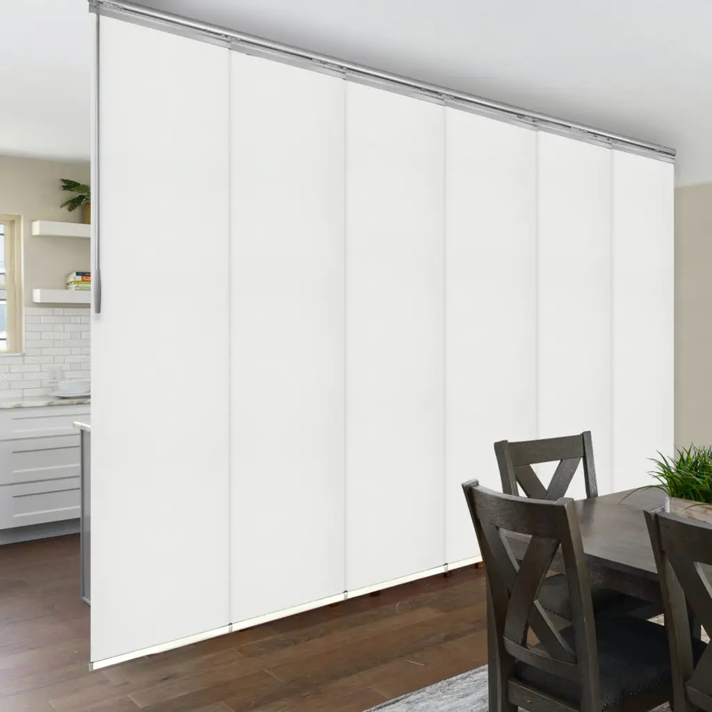 Central Design Products is pleased to introduce a new innovative panel track that offers easy 2-way installation, adding an alluring style and refined touch to your home decor. The single rail design of the track is sleek, compact, and reduces the overall footprint and weight of the installation, eliminating bulky, intrusive window treatments. Adjusting the panel height is a breeze � simply trim the panel, re-attach the liner, and install the panel weight. Detailed instructions are included.The panel track also features a patented slider design, made with aluminum and fitted with bearings that allow for durable and smooth operation. The sliders are stacked closer together than conventional panel tracks, reducing light bleed coming from the gaps between panels. This track has endless uses from dividing rooms, garages, offices, and closets to decorating windows and patios. Available in larger sizes including 8, 10, and 12 panels. Extends from 98-130� wide. Each panel measures 23.5" wide and 116" tall, with a total installation height of 118.5" (includes the 2.5" rail track). The track can be wall or ceiling mounted. The panels can stack on the left or the right. The clearance from the wall is extendable from 1.25� to 3.25� and projection from the wall is extendable from 3� to 4.25�. Danilo panel is made from 70% Polyester 30% Acrylic, with a blackout shade.