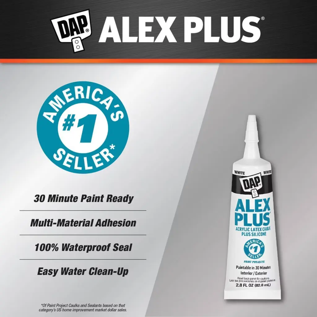 DAP Alex Plus White All Purpose Caulk is a top-quality acrylic latex caulk infused with silicone, ensuring a flexible and waterproof seal on various interior and exterior surfaces. This caulk is paintable within just 30 minutes using latex or oil-based paints, delivering fast results for your projects. Easy to apply, low in odor, and cleans up easily with water, it is suitable for both interior and exterior use. Mold resistant once cured.