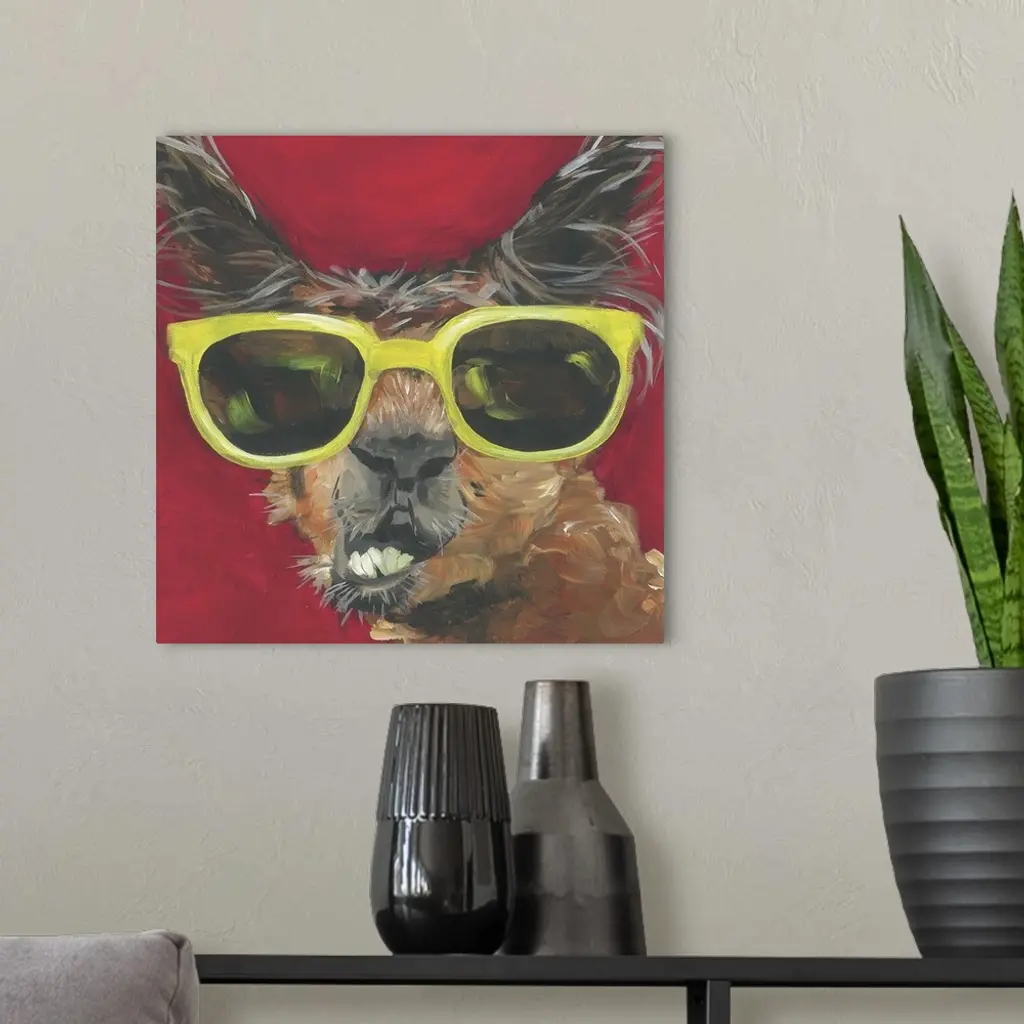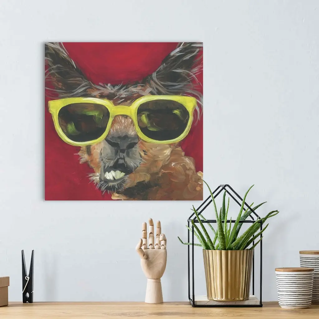 A engaging portrait of a llama wearing yellow sunglasses on a red background.