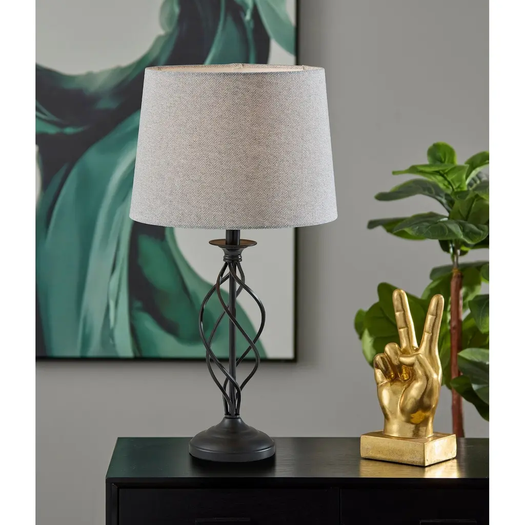 Introducing the SL3978-02 Darcy Table Lamp, a sophisticated addition to your home decor. Featuring a sleek black metal open spiral-shaped base complemented by a textured grey fabric shade, this lamp exudes contemporary elegance. Standing at a height of 26 inches, it's the perfect choice for adding ambient lighting to your living room, bedroom, or office. The convenient on/off rotary switch located on the socket ensures easy operation, making it a practical and stylish lighting solution for any space. -Modern design: Sleek black metal open spiral-shaped base for a contemporary look. -Textured grey fabric shade: Adds visual interest and softens the light. -Versatile height: Stands at 26 inches, suitable for various tabletops and surfaces. -Easy operation: On/off rotary switch located on the socket for convenient control. -Ambient lighting: Provides warm and inviting illumination for your living room, bedroom, or office.