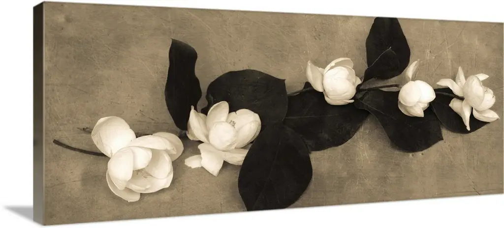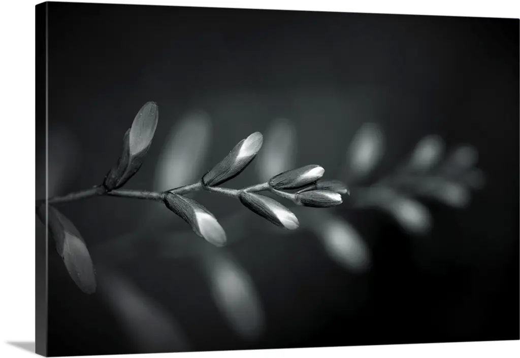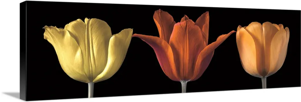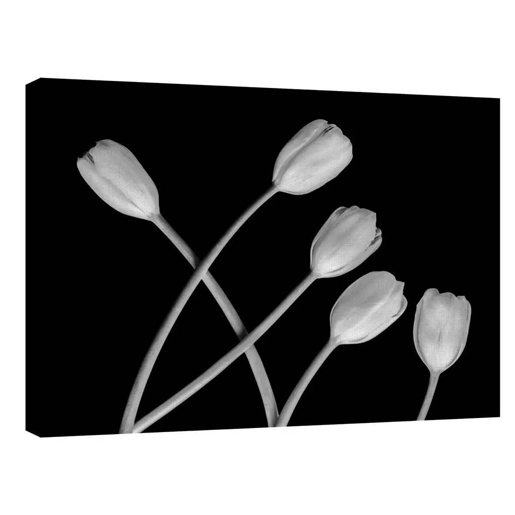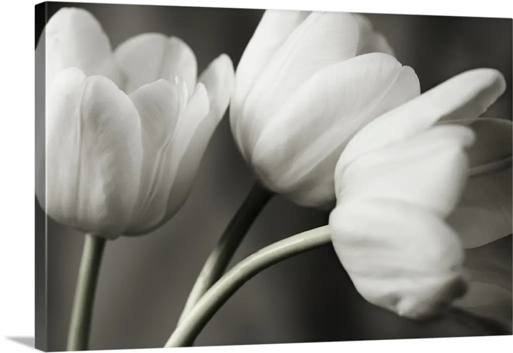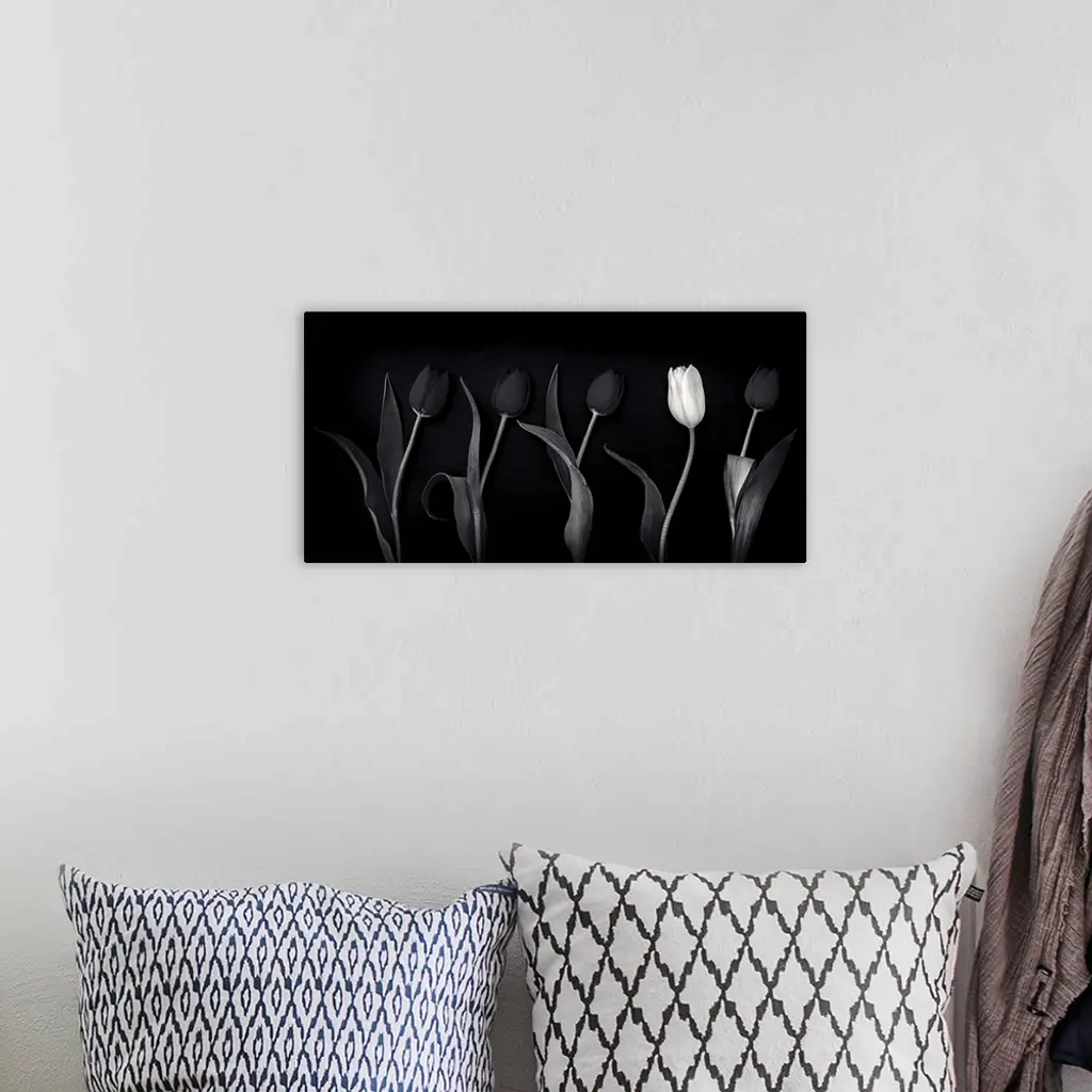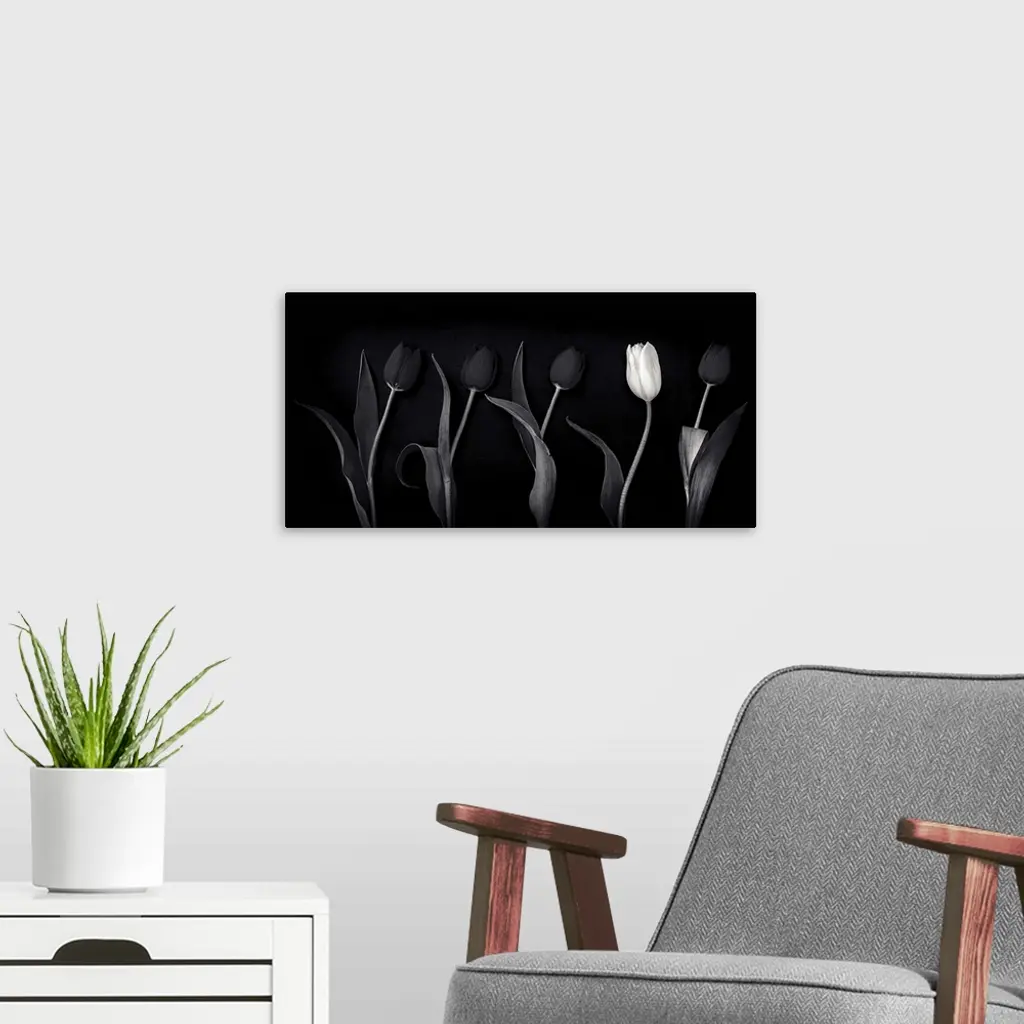 A black and white monochrome panorama of tulips with one white tulip standing out as an individual.