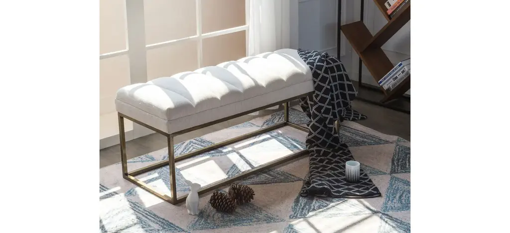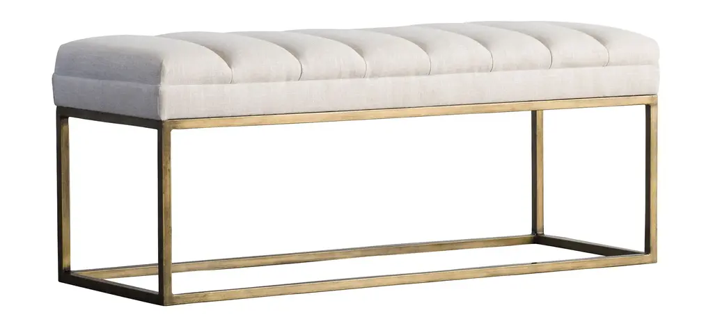 The Darius Fabric Bench is able to transition to nearly any room in the home, wherever and whenever extra seating is needed. The steel base is painted a color called Brushed Gold. No risks, only rewards when you choose the Darius channel-stitched bench.