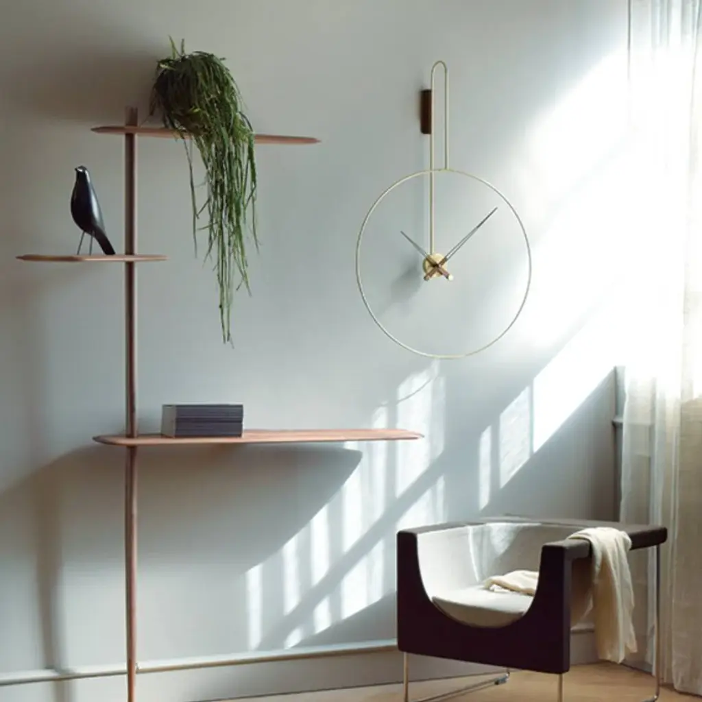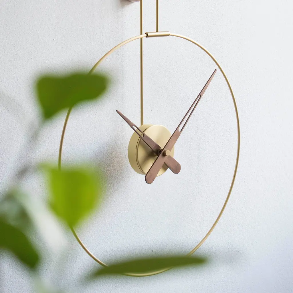 In Mini and Micro variations, Daro from Spanish brand Nomon takes form with its ring structure suspended from a vertical wall mount trimmed in solid walnut to match the clock's hands. Casting intriguing shadows on the wall behind, the construction offers a choice of polished brass or graphite-finished brass for the metal frame and center round box. Powered by German-origin precision quartz works, the piece is completely handmade, with attention paid to every detail.