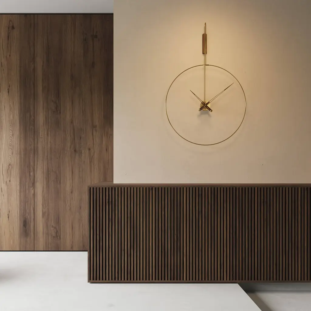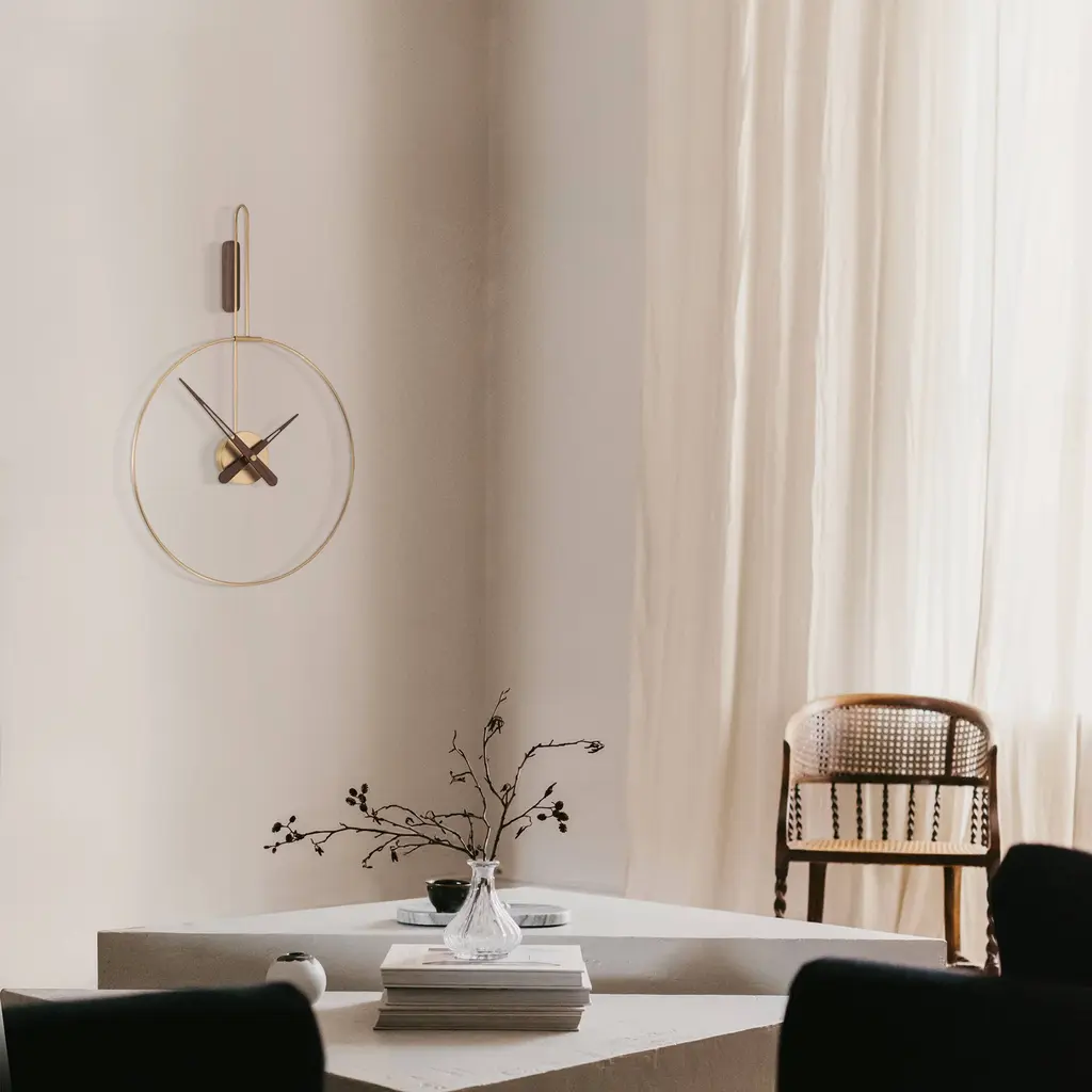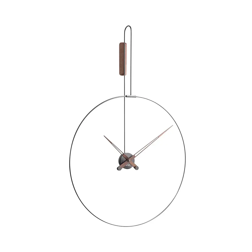 In Mini and Micro variations, Daro from Spanish brand Nomon takes form with its ring structure suspended from a vertical wall mount trimmed in solid walnut to match the clock's hands. Casting intriguing shadows on the wall behind, the construction offers a choice of polished brass or graphite-finished brass for the metal frame and center round box. Powered by German-origin precision quartz works, the piece is completely handmade, with attention paid to every detail.