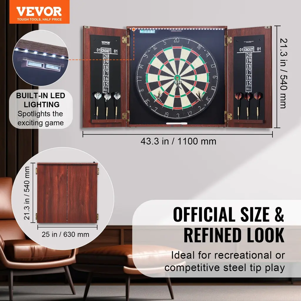 Official Size & Refined Look: This dartboard cabinet is perfect for both recreational and competitive play. Enhance your skills with an official size dartboard and offers a premium playing experience. With LED Light option: It features built-in LED lighting that spotlights your game, adding a touch of excitement and enhancing visibility. 18" Diameter Dartboard: Equipped with an 18-inch diameter dartboard made from self-healing sisal fiber, this dartboard and cabinet set is designed for durability and extended use. The high-density material and staple-free bullseye prevent darts from bouncing off, while the rotatable steel number ring helps prolong the board's lifespan. Classic Scoring: Track your game effortlessly with the classic black scoreboard, which is easy to wipe clean. The darts and dartboard set includes quality steel tip darts with grooves and rings for a consistent grip, along with dart holders to store your darts when not in use. Retro Style Cabinet: Enhance your living room décor with this retro-style cabinet. The dust-proof design, attractive woodgrain finish, and flannelette cloth that protects the board all contribute to its stylish and functional appearance. All Accessories Included: The dartboard and cabinet set comes complete with everything you need: 1 dartboard, 6 steel tip darts, 2 dry erase markers, 1 cleaning rag, and mounting hardware. Assembly is straightforward, ensuring you can start playing in no time. Package Content 1 x Dartboard Cabinet 1 x Dartboard 6 x Steel Tip Darts 2 x Dry Erase Markers 1 x Rag 1 x Set of Mounting Hardware 1 x User Manual With LED Light option: *REQUIRES 3XAA BATTERIES (NOT INCLUDED)