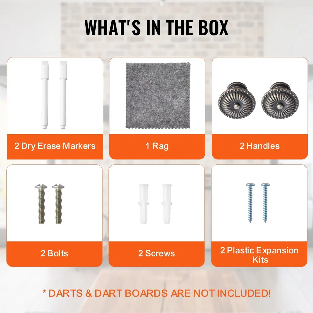 Official Size & Refined Look: With its official size and stylish design, this dartboard cabinet is perfect for both recreational and competitive steel tip play.Included Accessories: The dart board cabinet comes with essential accessories to get you started: 2 dry erase markers, 1 cleaning rag, 2 handles, 2 bolts, 2 screws, and 2 plastic expansion kits. Note: Darts and the dartboard are NOT INCLUDED! For Use with Bristle Dartboards: Designed to fit an 18" bristle dartboard, this dartboard cabinet is tailored to accommodate bristle dartboards for a perfect fit. Retro Style Cabinet: Add a touch of vintage charm to your living room with this retro-style cabinet. Its dust-proof, solid wood construction features brushed woodgrain and vintage brass hardware, complementing any décor with a classic look.Classic Scoring: Track your game effortlessly with the classic black scoreboard, which is easy to wipe clean. The dart board cabinet also includes dart holders to keep your darts organized when not in use. Package Content 1 x Dartboard Cabinet 2 x Dry Erase Markers 1 x Rag 2 x Handles 2 x Bolts 2 x Screws 2 x Plastic Expansion Kits 1 x User Manual * DARTS & DART BOARDS ARE NOT INCLUDED!