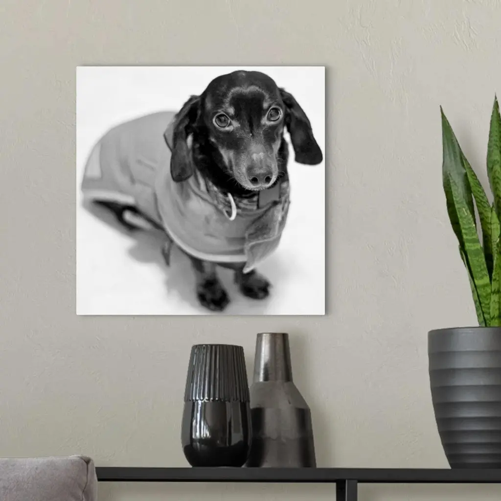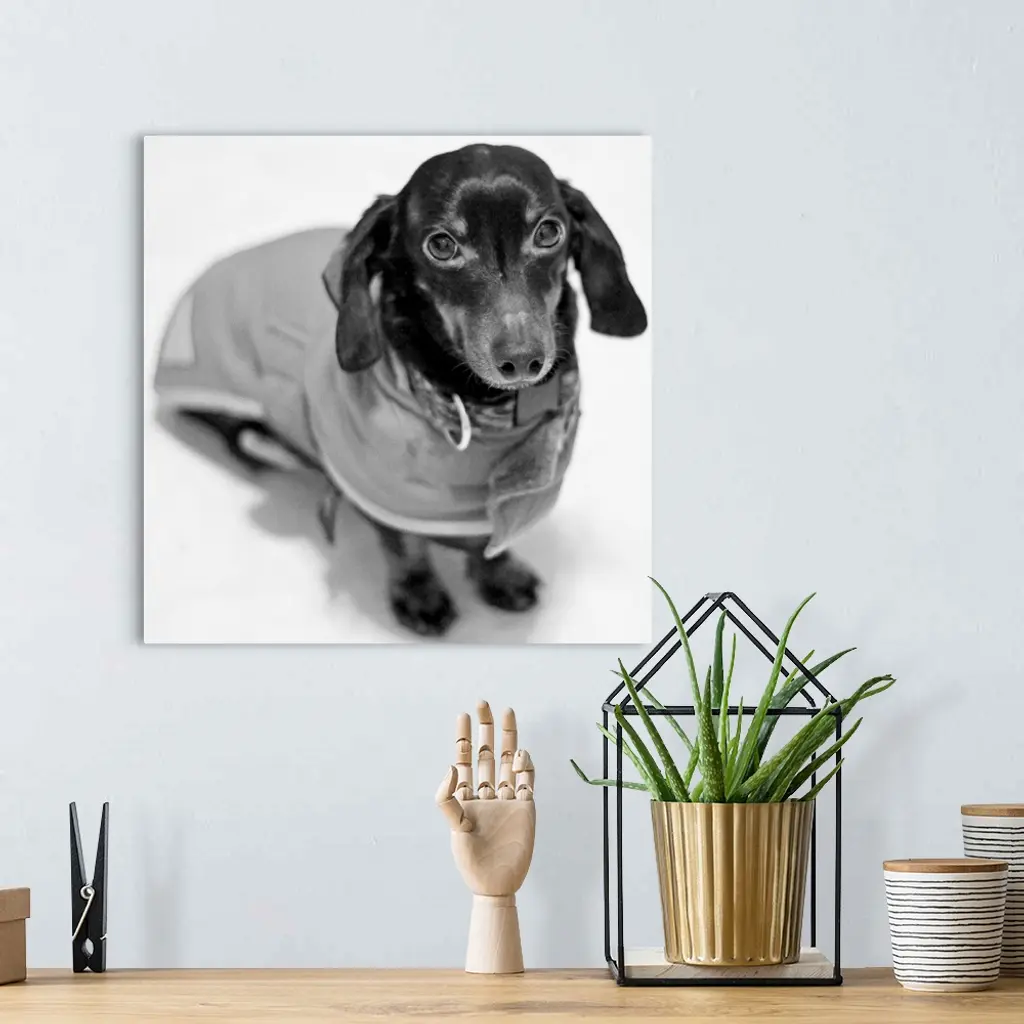 Daschund with a coat wall art for home and office decor. Discover canvas art prints, photos, mural, big canvas art and framed wall art in GreatBigCanvas.com's varied collections.