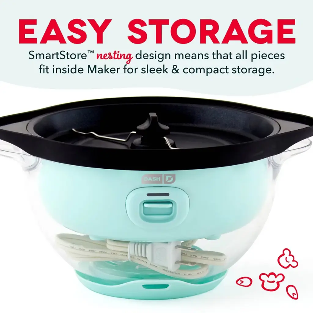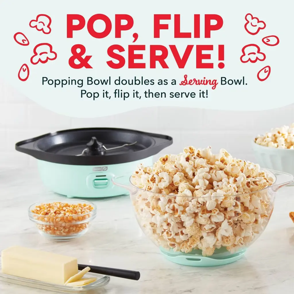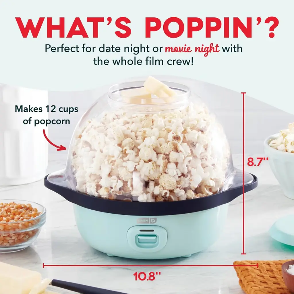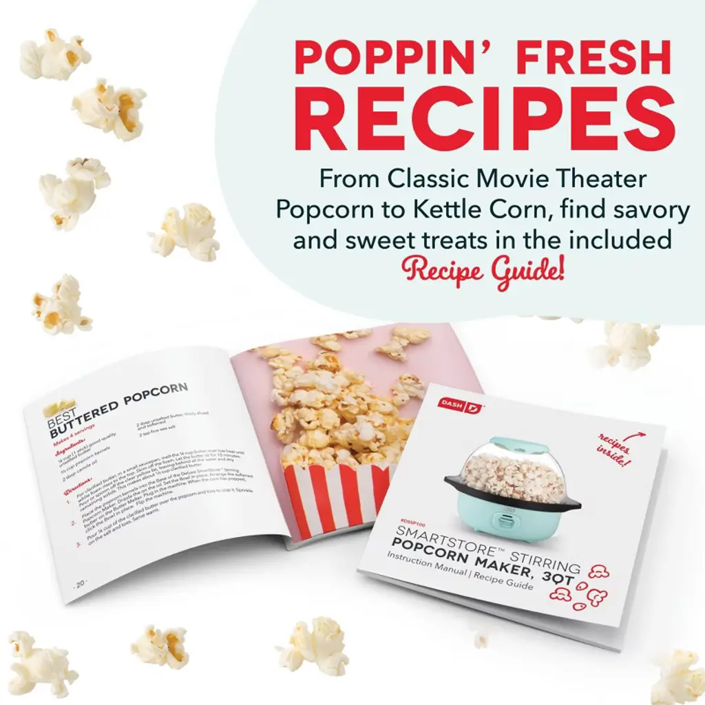 Romance Copy Make up to 12 cups of fresh, buttery popcorn with the Dash SmartStore™ Stirring Popcorn Maker, 3QT! Pop popcorn without having to heat the stove with the Stirring Popcorn Maker’s one-touch power: just add kernels, a little oil, and press the Power Button! Perfect for enjoying movie-theater-style popcorn, the Bowl of the SmartStore™ Popcorn Maker lets you watch popcorn popping, and also doubles as a serving dish. With the included Measuring Cup, you’ll always make just the right amount for friends and family. The SmartStore™ design makes it so the lid and base stack together, taking up less space in your cabinets. Get started enjoying delicious homemade popcorn right away — recipes included!