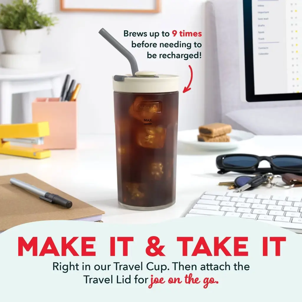 It’s time to be your own brewista! The Dash Brew2Go™ Portable Cold Brew System brews lightning-fast cold brew in less than 15 minutes right on your countertop, making it the morning MVP when you need to dash out the door. No more long coffee shop lines or overnight brewing. Just start brewing with one touch and the Indicator Light will alert you when your brew is ready. Top it off with the handy Travel Lid and included Silicone Straw, and you’re good 2 go! Featuring a reusable Filter and Portable Cup, the Brew2Go™ makes cleanup a breeze while promoting sustainable sipping—say goodbye to disposable filters, plastic pods, and single-use coffee shop cups! Plus, it's not just for coffee lovers: Use it for loose-leaf iced tea any time of year! Get ready to enjoy your favorite cold brew and iced tea creations with ease and convenience and don't forget to check out the included Recipe Guide for even more ways to brew!
