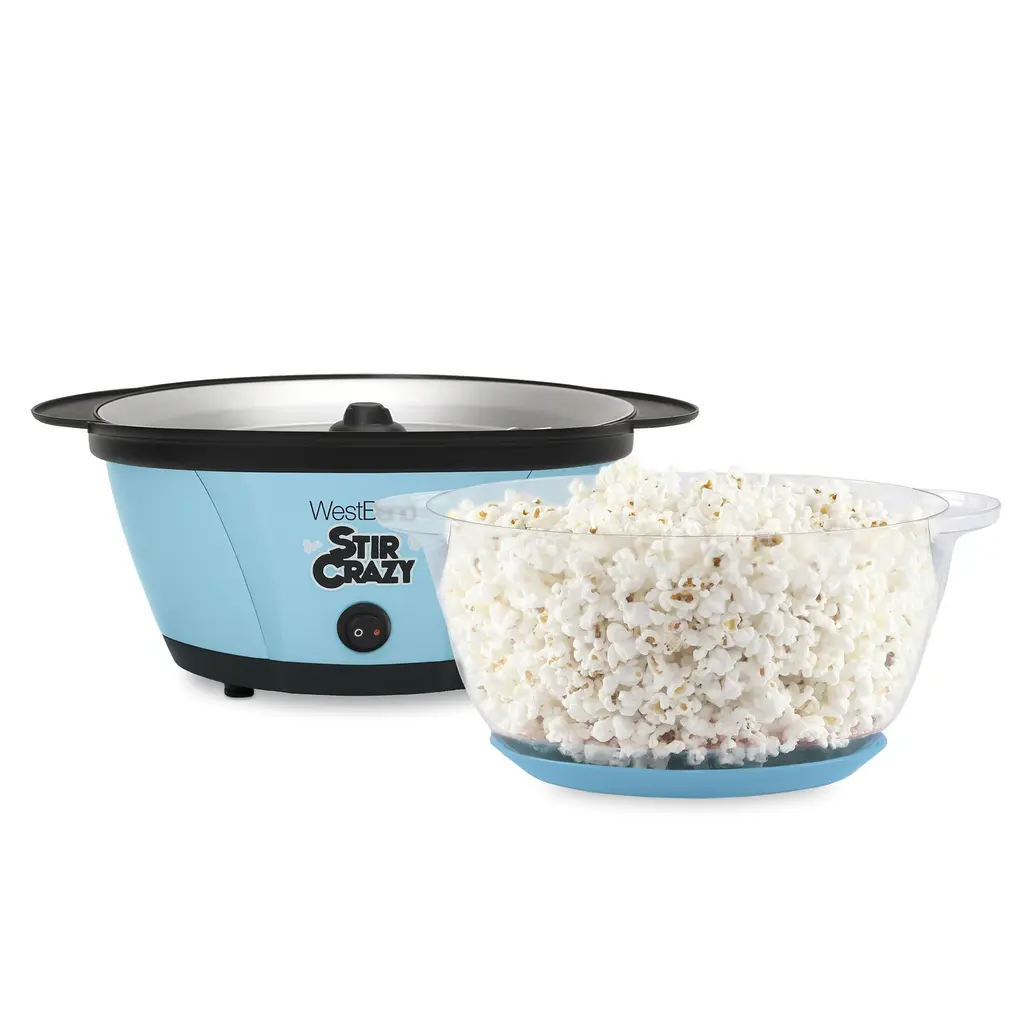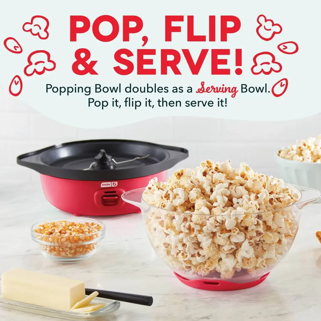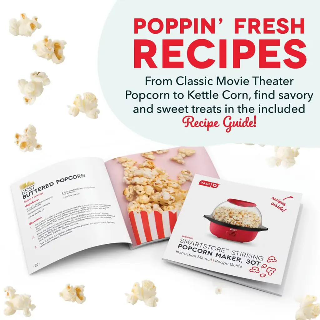 Romance Copy Make up to 12 cups of fresh, buttery popcorn with the Dash SmartStore™ Stirring Popcorn Maker, 3QT! Pop popcorn without having to heat the stove with the Stirring Popcorn Maker’s one-touch power: just add kernels, a little oil, and press the Power Button! Perfect for enjoying movie-theater-style popcorn, the Bowl of the SmartStore™ Popcorn Maker lets you watch popcorn popping, and also doubles as a serving dish. With the included Measuring Cup, you’ll always make just the right amount for friends and family. The SmartStore™ design makes it so the lid and base stack together, taking up less space in your cabinets. Get started enjoying delicious homemade popcorn right away — recipes included!