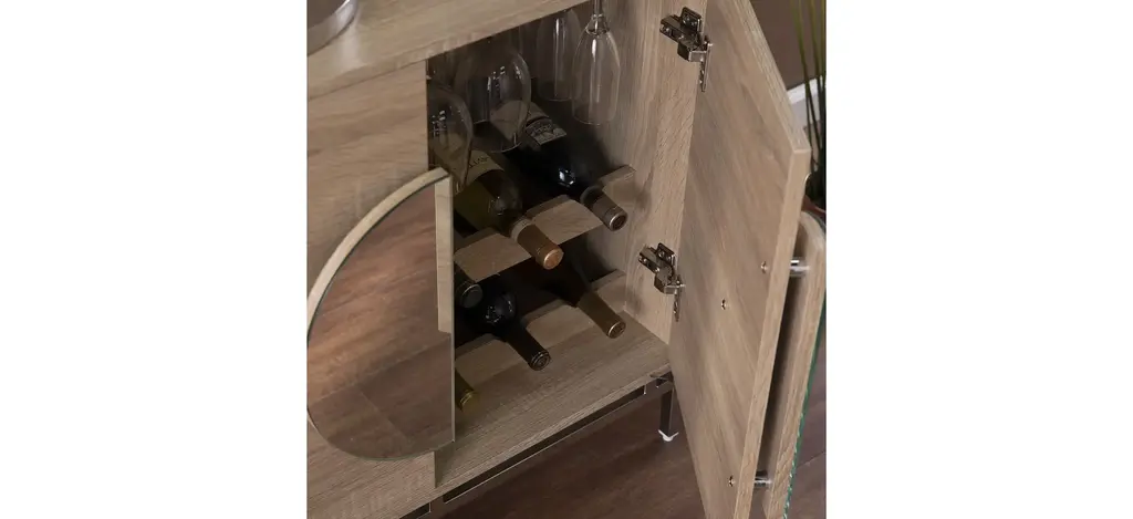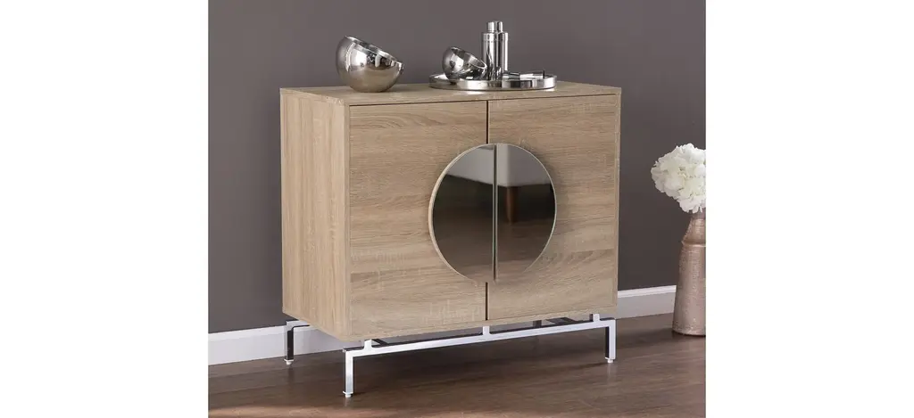 Keep your favorite drinks close at hand with this Davenport Bar Cabinet. Two shelves organize spare glassware and bar essentials, while double doors tuck away necessities for a clean, clutter-free space. Mirrored hardware brings a contemporary feel, adding style and dimension to your dining area or living room.